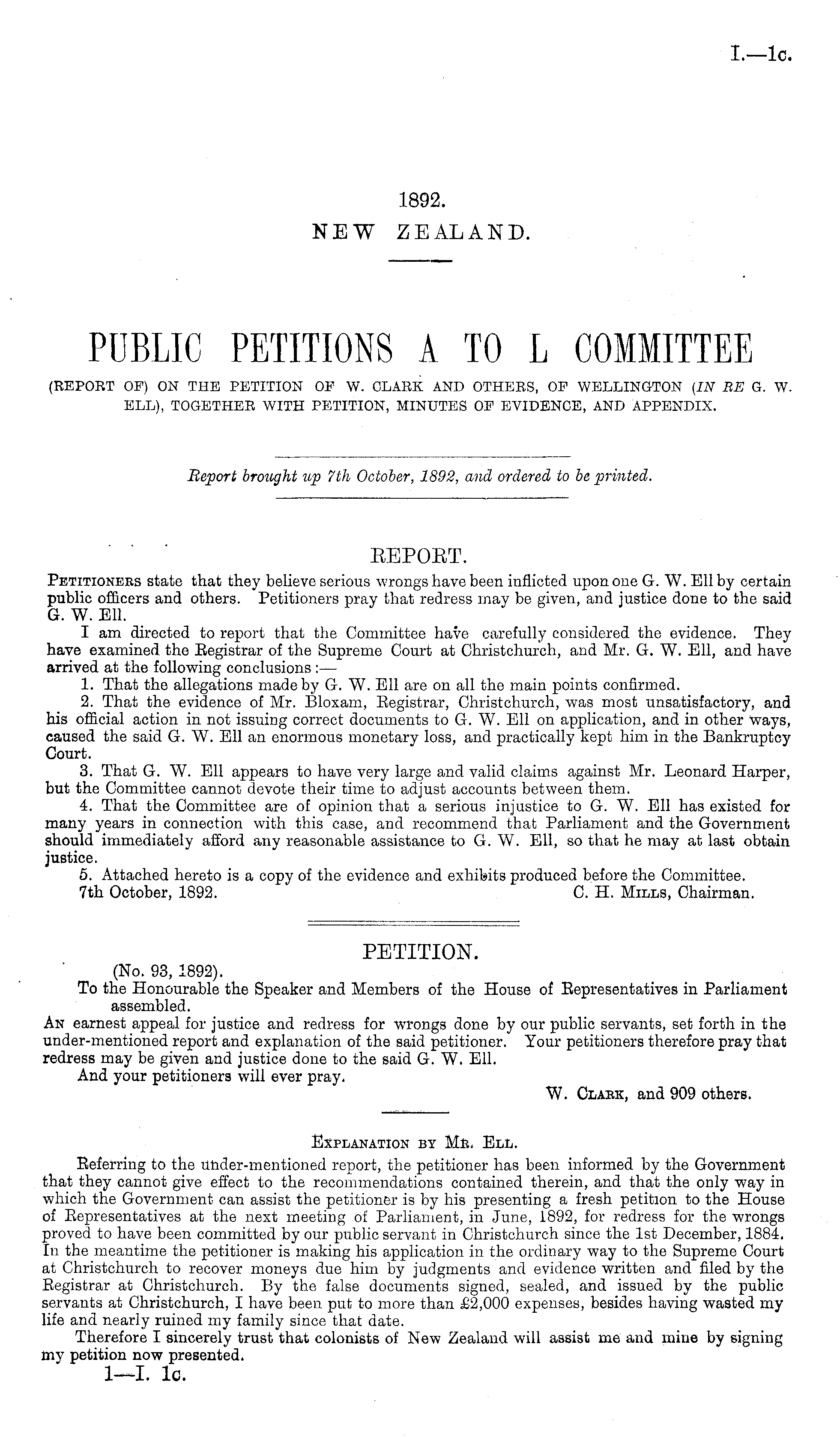 PETITION. (No. 93, 1892). To the Honourable the Speaker and Members of the House of Eepresentatives in Parliament assembled. An earnest appeal for justice and redress for wrongs done by our public servants, set forth in the under-mentioned report and explanation of the said petitioner. Your petitioners therefore pray that redress may be given and justice done to the said G. W. Ell. And your petitioners will ever pray. W. Clack, and 909 others.