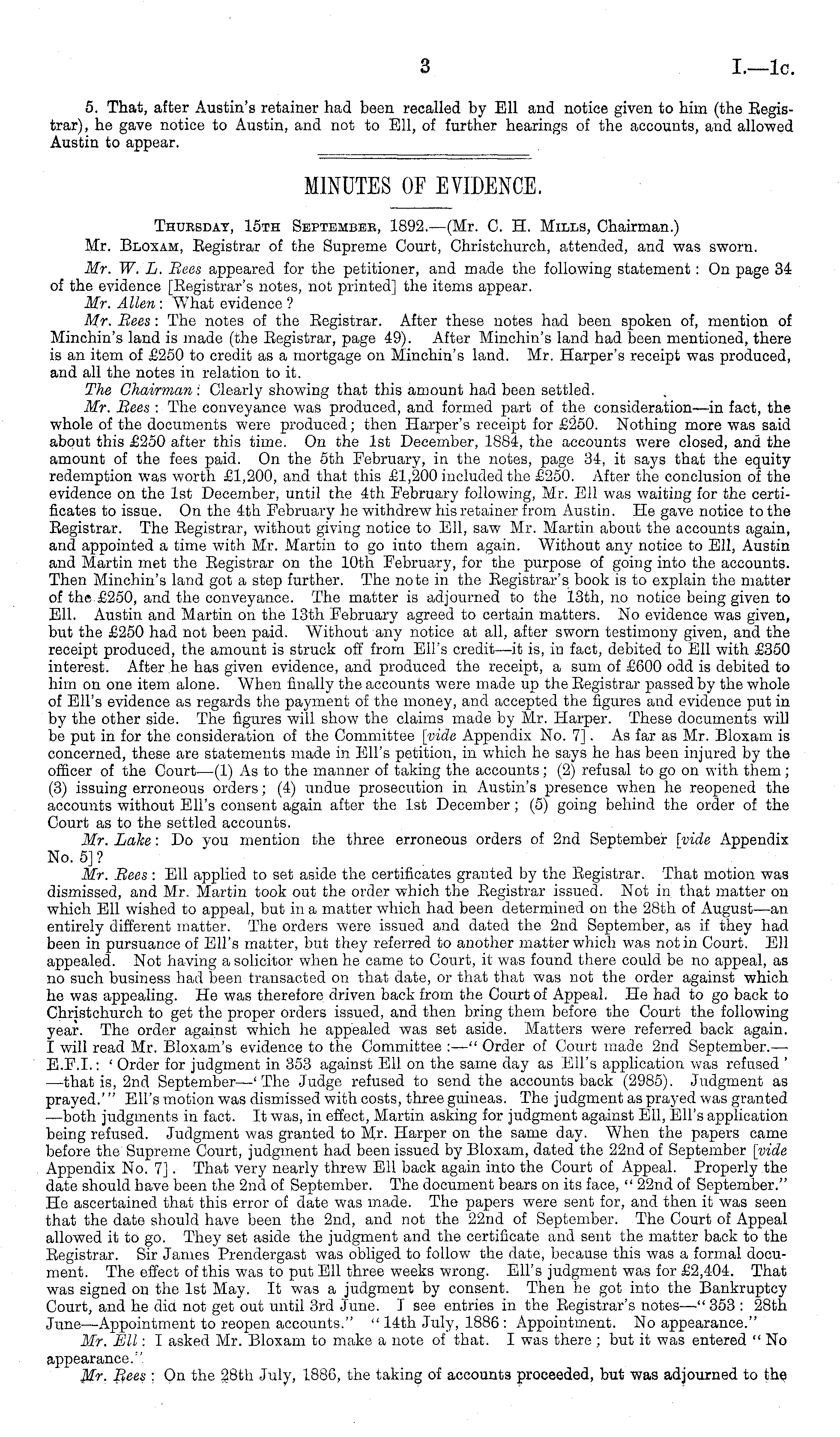 Thuesdat, 15th Septembee, 1892.—(Mr. C. H. Mills, Chairman.) Mr. Bloxam, Eegistrar of the Supreme Court, Christchurch, attended, and was sworn. Mr. W. L. Bees appeared for the petitioner, and made the following statement: On page 34 of the evidence [Eegistrar's notes, not printed] the items appear. Mr. Allen : What evidence '? Mr. Bees : The notes of the Eegistrar. After these notes had been spoken of, mention of Minchin's land is made (the Eegistrar, page 49). After Minchin's land had Been mentioned, there is an item of £250 to credit as a mortgage on Minchin's land. Mr. Harper's receipt was produced, and all the notes in relation to it. The Chairman : Clearly showing that this amount had been settled. Mr. Bees : The conveyance was produced, and formed part of the consideration—in fact, the whole of the documents were produced; then Harper's receipt for £250. Nothing more was said about this £250 after this time. On the Ist December, 1884, the accounts were closed, and the amount of the fees paid. On the sth February, in the notes, page 34, it says that the equity redemption was worth £1,200, and that this £1,200 included the £250. After the conclusion of the evidence on the Ist December, until the 4th February following, Mr. Ell was waiting for the certificates to issue. On the 4th February he withdrew his retainer from Austin. He gave notice to the Eegistrar. The Eegistrar, without giving notice to Ell, saw Mr. Martin about the accounts again, and appointed a time with Mr. Martin to go into them again. Without any notice to Ell, Austin and Martin met the Eegistrar on the 10th February, for the purpose of going into the accounts. Then Minchin's land got a step further. The note in the Begistrar's book is to explain the matter of the £250, and the conveyance. The matter is adjourned to the 13th, no notice being given to Ell. Austin and Martin on the 13th February agreed to certain matters. No evidence was given, but the £250 had not been paid. Without any notice at all, after sworn testimony given, and the receipt produced, the amount is struck off from Ell's credit—it is, in fact, debited to Ell with £350 interest. After he has given evidence, and produced the receipt, a sum of £600 odd is debited to him on one item alone. When finally the accounts were made up the Eegistrar passed by the whole of Ell's evidence as regards the payment of the money, and accepted the figures and evidence put in by the other side. The figures will show the claims made by Mr. Harper. These documents will be put in for the consideration of the Committee [vide Appendix No. 7]. As far as Mr. Bloxam is concerned, these are statements made in Ell's petition, in which he says he has been injured by the officer of the Court—(l) As to the manner of taking the accounts; (2) refusal to go on with them; (3) issuing erroneous orders; (4) undue prosecution in Austin's presence when he reopened the accounts without Ell's consent again after the Ist December; (5) going behind the order of the Court as to the settled accounts. Mr. Lake: Do you mention the three erroneous orders of 2nd September [vide Appendix No. 5] ? Mr. Bees : Ell applied to set aside the certificates granted by the Eegistrar. That motion was dismissed, and Mr. Martin took out the order which the Eegistrar issued. Not in that matter on which Ell wished to appeal, but in a matter which had been determined on the 28th of August—an entirely different matter. The orders were issued and dated the 2nd September, as if they had been in pursuance of Ell's matter, but they referred to another matter which was not in Court. Ell appealed. Not having a solicitor when he came to Court, it was found there could be no appeal, as no such business had been transacted on that date, or that that was not the order against which he was appealing. He was therefore driven back from the Court of Appeal. Ho had to go back to Christchurch to get the proper orders issued, and then bring them before the Court the following year. The order against which lie appealed was set aside. Matters were referred back again. I will read Mr. Bloxam's evidence to the Committee : —" Order of Court made 2nd September.— E.F.1.: ' Order for judgment in 353 against Ell on the same day as Ell's application was refused ' —that is, 2nd September—'The Judge refused to send the accounts back (2985). Judgment as prayed.'" Ell's motion was dismissed with costs, three guineas. The judgment as prayed was granted —both judgments in fact. It was, in effect, Martin asking for judgment against Ell, Ell's application being refused. Judgment was granted to Mr. Harper on the same day. When the papers came before the Supreme Court, judgment had been issued by Bloxam, dated the 22nd of September [vide Appendix No. 7]. That very nearly threw Ell back again into the Court of Appeal. Properly the date should have been the 2nd of September. The document bears on its face, " 22nd of September." He ascertained that this error of date was made. The papers were sent for, and then it was seen that the date should have been the 2nd, and not the 22nd of September. The Court of Appeal allowed it to go. They set aside the judgment and the certificate and sent the matter back to the Eegistrar. Sir James Prendergast was obliged to follow the date, because this was a formal document. The effect of this was to put Ell three weeks wrong. Ell's judgment was for £2,404. That was signed on the Ist May. It was a judgment by consent. Then he got into the Bankruptcy Court, and he dia not get out until 3rd June. I see entries in the Eegistrar's notes—"3s3 : 28th June —Appointment to reopen accounts." " 14th July, 1886 : Appointment. No appearance." Mr. Mil : I asked Mr. Bloxam to make a note of that. I was there ; but it was entered "No appearance/ Mr. Bees : On the 28th July, 1886, the taking of accounts proceeded, but was adjourned to the