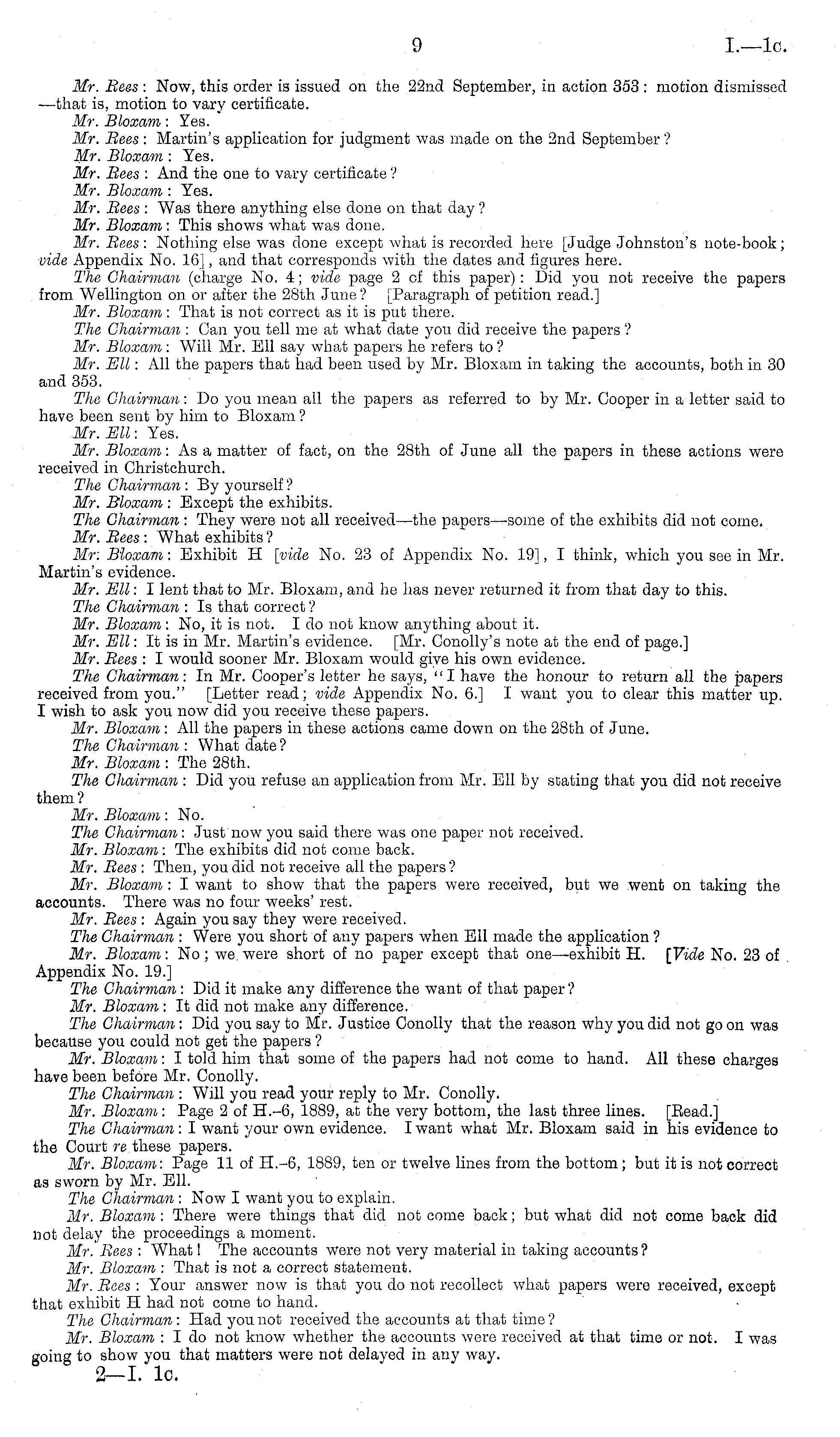 Mr. Bees : Now, this order is issued on the 22nd September, in action 353 : motion dismissed —that is, motion to vary certificate. Mr. Bloxam : Yes. Mr. Bees: Martin's application for judgment was made on the 2nd September? Mr. Bloxam : Yes. Mr. Bees : And the one to vary certificate ? Mr. Bloxam : Yes. Mr. Bees : Was there anything else done on that day ? Mr. Bloxam: This shows what was done. Mr. Bees : Nothing else was done except what is recorded here [Judge Johnston's note-book; vide Appendix No. 16], and that corresponds with the dates and figures here. The Chairman (charge No. 4; vide page 2 of this paper) : Did you not receive the papers from Wellington on or after the 28th June ? \ Paragraph of petition read.] Mr. Bloxam: That is not correct as it is put there. The Chairman : Can you tell me at what date you did receive the papers ? Mr. Bloxam : Will Mr. Ell say what papers he refers to ? Mr. Ell : All the papers that had been tised by Mr. Bloxam in taking the accounts, both in 30 and 353. The Chairman: Do you mean all the papers as referred to by Mr. Cooper in a letter said to have been sent by him to Bloxam ? Mr. Ell : Yes. Mr. Bloxam : As a matter of fact, on the 28th of June all the papers in these actions were received in Christchurch. The Chairman : By yourself ? Mr. Bloxam : Except the exhibits. The Chairman : They were not all received—the papers —some of the exhibits did not come. Mr. Bees : What exhibits ? Mr: Bloxam: Exhibit H [vide No. 23 of Appendix No. 19], I think, which you see in Mr. Martin's evidence. Mr. Ell: I lent that to Mr. Bloxam, and he has never returned it from that day to this. The Chairman : Is that correct ? Mr. Bloxam : No, it is not. Ido not know anything about it. Mr. Ell: It is in Mr. Martin's evidence. [Mr. Conolly's note at the end of page.] Mr. Bees : I would sooner Mr. Bloxam would give his own evidence. The Chairman: In Mr. Cooper's letter he says, "I have the honour to return all the papers received from you." [Letter read; vide Appendix No. 6.] I want you to clear this matter up. I wish to ask you now did you receive these papers. Mr. Bloxam: All the papers in these actions came down on the 28th of June. The Chairman : What date ? Mr. Bloxam : The 28th. The Chairman : Did you refuse an application from Mr. Ell by seating that you did not receive them ? Mr. Bloxam: No. The Chairman: Just now you said there was one paper not received. Mr. Bloxam : The exhibits did not come back. Mr. Bees : Then, you did not receive all the papers ? Mr. Bloxam : I want to show that the papers were received, but we went on taking the accounts. There was no four weeks' rest. Mr. Bees : Again you say they were received. The Chairman : Were you short of any papers when Ell made the application ? Mr. Bloxam: No ;we were short of no paper except that one —exhibit H. [Vide No. 23 of Appendix No. 19.] The Chairman: Did it make any difference the want of that paper ? Mr. Bloxam : It did not make any difference. The Chairman : Did you say to Mr. Justice Conolly that the reason why you did not go on was because you could not get the papers ? Mr. Bloxam: I told him that some of the papers had not come to hand. All these charges have been before Mr. Conolly. The Chairman : Will you read your reply to Mr. Conolly. Mr. Bloxam: Page 2of H.-6, 1889, at the very bottom, the last three lines. [Read.] The Chairman : I want your own evidence. I want what Mr. Bloxam said in his evidence to the Court re these papers. Mr. Bloxam: Page 11 of H.-6, 1889, ten or twelve lines from the bottom; but it is not correct as sworn by Mr. Ell. The Chairman : Now I want you to explain. Mr. Bloxam : There were things that did not come back; but what did not come back did not delay the proceedings a moment. Mr. Bees : What! The accounts were not very material in taking accounts ? Mr. Bloxam : That is not a correct statement. Mr. Bees : Your answer now is that you do not recollect what papers were received, except that exhibit H had not come to hand. The Chairman: Had you not received the accounts at that time? Mr. Bloxam : Ido not know whether the accounts were received at that time or not. I was going to show you that matters were not delayed in any way. 2—l. 10.