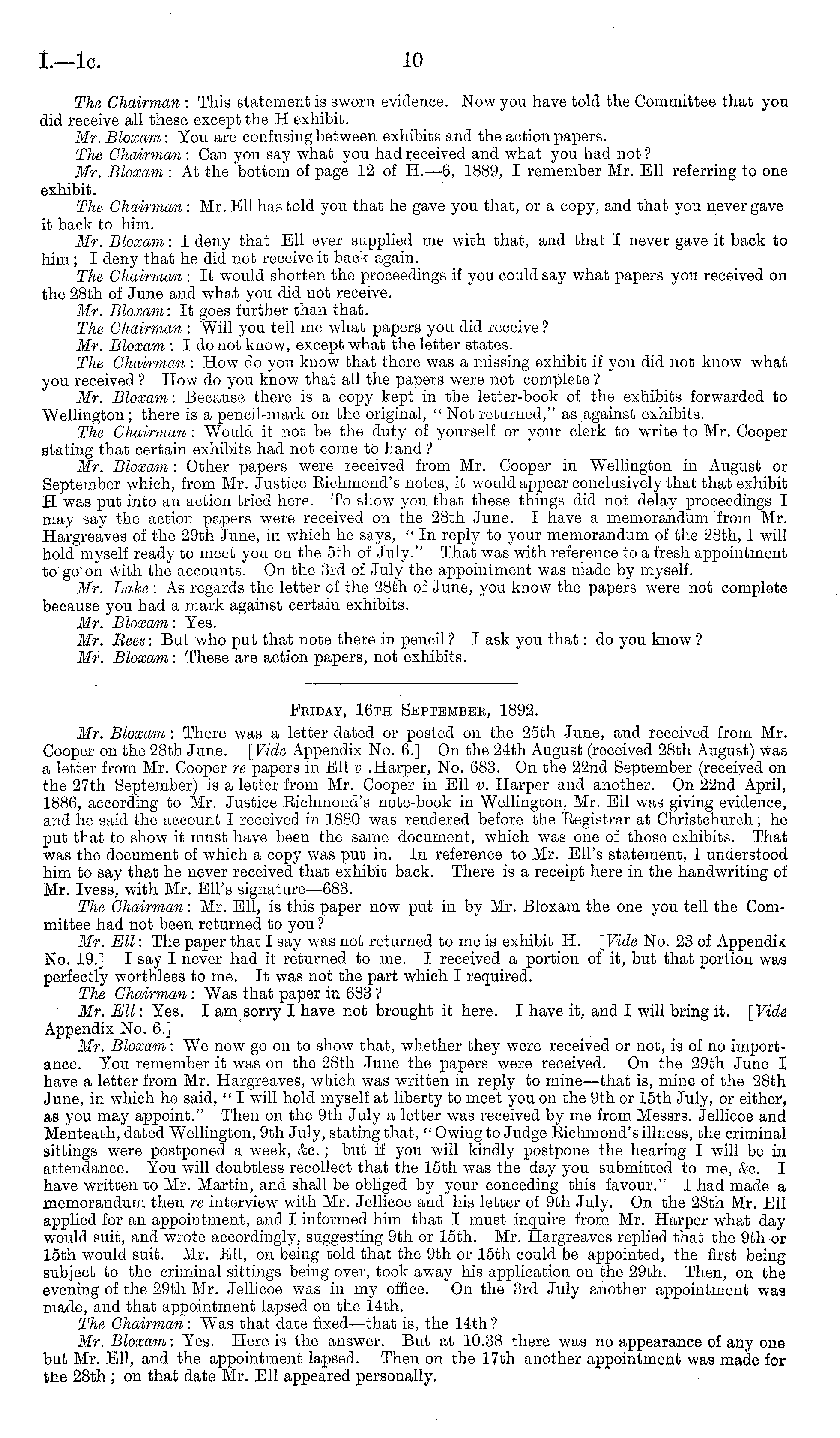 Ebiday, 16th Septembek, 1892. Mr. Bloxavi: There was a letter dated or posted on the 25th June, and received from Mr. Cooper on the 28th June. [Vide Appendix No. 6.] On the 24th August (received 28th August) was a letter from Mr. Cooper re papers in Ell i> .Harper, No. 683. On the 22nd September (received on the 27th September) is a letter from Mr. Cooper in Ell v. Harper and another. On 22nd April, 1886, according to Mr. Justice Bichmond's note-book in Wellington, Mr. Ell was giving evidence, and he said the account I received in 1880 was rendered before the Registrar at Christchurch; he put that to show it must have been the same document, which was one of those exhibits. That was the document of which a copy was put in. In reference to Mr. Ell's statement, I understood him to say that he never received that exhibit back. There is a receipt here in the handwriting of Mr. Ivess, with Mr. Ell's signature —683. The Chairman : Mr. Ell, is this paper now put in by Mr. Bloxam the one you tell the Committee had not been returned to you ? Mr. Ell : The paper that I say was not returned to me is exhibit H. [Vide No. 23 of Appendix No. 19.] I say I never had it returned to me. I received a portion of it, but that portion was perfectly worthless to me. It was not the part which I required. The Chairman : Was that paper in 683 ? Mr. Ell: Yes. lam sorry I have not brought it here. I have it, and I will bring it. [Vide Appendix No. 6.] Mr. Bloxam: We now go on to show that, whether they were received or not, is of no importance. You remember it was on the 28th June the papers were received. On the 29th June I have a letter from Mr. Hargreaves, which was written in reply to mine—that is, mine of the 28th June, in which he said, " I will hold myself at liberty to meet you on the 9th or 15th July, or either, as you may appoint." Then on the 9th July a letter was received by me from Messrs. Jellicoe and Menteath, dated Wellington, 9th July, stating that, " Owing to Judge Richmond's illness, the criminal sittings were postponed a week, &c.; but if you will kindly postpone the hearing I will be in attendance. You will doubtless recollect that the 15th was the day you submitted to me, &c. I have written to Mr. Martin, and shall be obliged by your conceding this favour." I had made a memorandum then re interview with Mr. Jellicoe and his letter of 9th July. On the 28th Mr. Ell applied for an appointment, and I informed him that I must inquire from Mr. Harper what day would suit, and wrote accordingly, suggesting 9th or 15th. Mr. Hargreaves replied that the 9th or 15th would suit. Mr. Ell, on being told that the 9th or 15th could be appointed, the first being subject to the criminal sittings being over, took away his application on the 29th. Then, on the evening of the 29th Mr. Jellicoe was in my office. On the 3rd July another appointment was made, and that appointment lapsed on the 14th. The Chairman: Was that elate fixed—that is, the 14th? Mr. Bloxam: Yes. Here is the answer. But at 10.38 there was no appearance of any one but Mr. Ell, and the appointment lapsed. Then on the 17th another appointment was made for the 28th ; on that date Mr. Ell appeared personally.