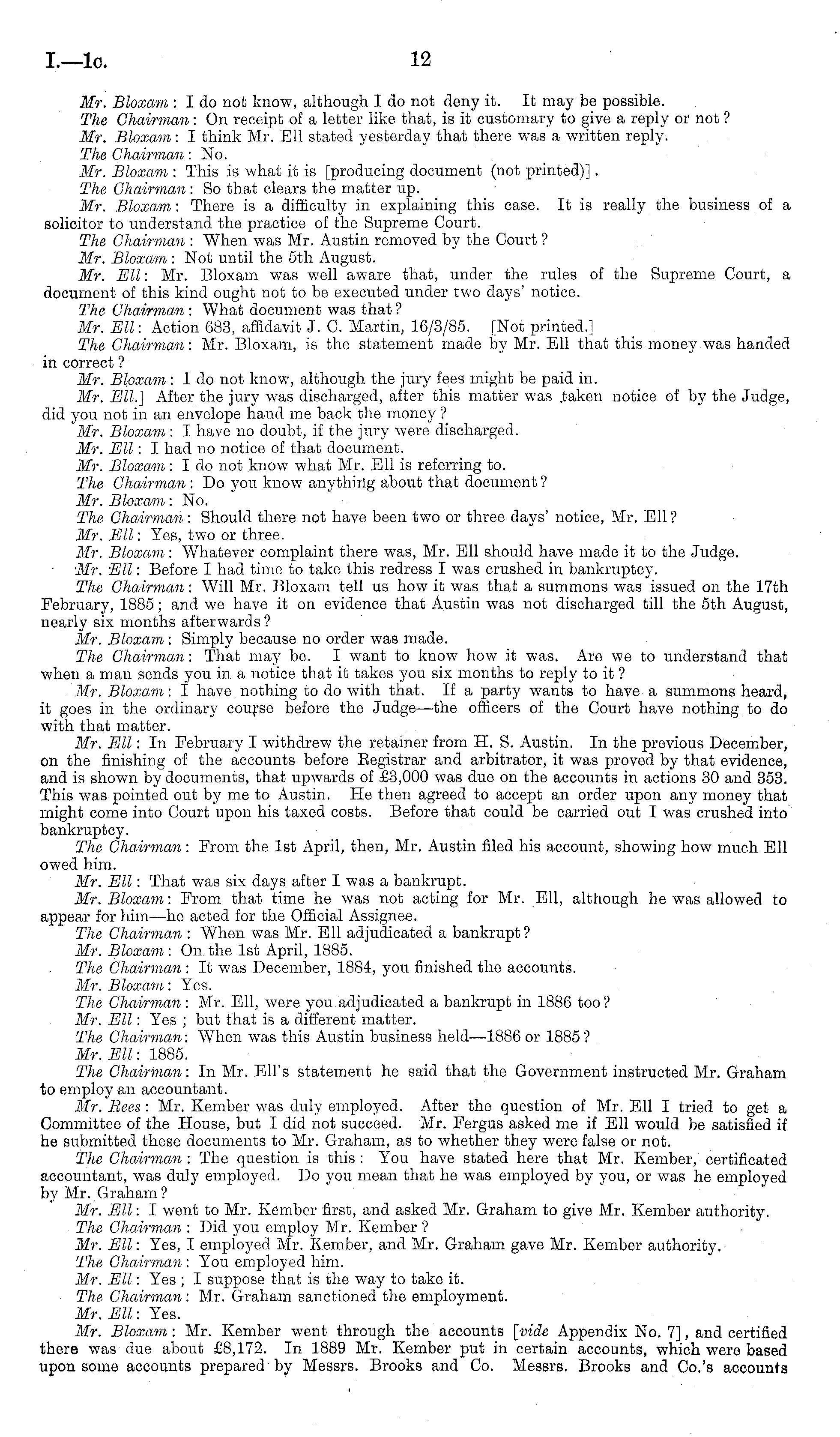 Mr. Bloxam :I do not know, although Ido not deny it. It may be possible. The Chairman : On receipt of a letter like that, is it customary to give a reply or not ? Mr. Bloxam : I think Mr. Ell stated yesterday that there was a written reply. The Chairman : No. Mr. Bloxam : This is what it is [producing document (not printed)]. The Chairman : So that clears the matter up. Mr. Bloxam : There is a difficulty in explaining this case. It is really the business of a solicitor to understand the practice of the Supreme Court. The Chairman : When was Mr. Austin removed by the Court ? Mr. Bloxam: Not until the sth August. Mr. Ell: Mr. Bloxam was well aware that, under the rules of the Supreme Court, a document of this kind ought not to be executed under two days' notice. The Chairman : What document was that ? Mr. Ell: Action 683, affidavit J. C. Martin, 16/3/85. [Not printed.] The Chairman: Mr. Bloxam, is the statement made by Mr. Ell that this money was handed in correct ? Mr. Bloxam : Ido not know, although the jury fees might be paid in. Mr. Ell.} After the jury was discharged, after this matter was .taken notice of by the Judge, did you not in an envelope hand me back the money ? Mr. Bloxam : I have no doubt, if the jury were discharged. Mr. Ell: I had no notice of that document. Mr. Bloxam: Ido not know what Mr. Ell is referring to. The Chairman : Do you know anything about that document ? Mr. Bloxam : No. The Chairman : Should there not have been two or three days' notice, Mr. Ell ? Mr. Ell: Yes, two or three. Mr. Bloxam: Whatever complaint there was, Mr. Ell should have made it to the Judge. Mr. Ell: Before I had time to take this redress I was crushed in bankruptcy. The Chairman: Will Mr. Bloxam tell us how it was that a summons was issued on the 17th February, 1885; and we have it on evidence that Austin was not discharged till the sth August, nearly six months afterwards? Mr. Bloxam : Simply because no order was made. The Chairman: That may be. I want to know how it was. Are we to understand that when a man sends you in a notice that it takes you six months to reply to it ? Mr. Bloxam: I have nothing to do with that. If a party wants to have a summons heard, it goes in the ordinary course before the Judge —the officers of the Court have nothing to do with that matter. Mr. Ell : In February I withdrew the retainer from H. S. Austin. In the previous December, on the finishing of the accounts before Eegistrar and arbitrator, it was proved by that evidence, and is shown by documents, that upwards of £3,000 was due on the accounts in actions 30 and 353. This was pointed out by me to Austin. He then agreed to accept an order upon any money that might come into Court upon his taxed costs. Before that could be carried out I was crushed into bankruptcy. The Chairman: From the Ist April, then, Mr. Austin filed his account, showing how much Ell owed him. Mr. Ell: That was six days after I was a bankrupt. Mr. Bloxam: From that time he was not acting for Mr. Ell, although he was allowed to appear for him—he acted for the Official Assignee. The Chairman : When was Mr. Ell adjudicated a bankrupt ? Mr. Bloxam: On the Ist April, 1885. The Chairman: It was December, 1884, you finished the accounts. Mr. Bloxam: Yes. The Chairman: Mr. Ell, were you adjudicated a bankrupt in 1886 too? Mr. Ell: Yes ; but that is a different matter. The Chairman: When was this Austin business held—lßß6 or 1885? Mr. Ell : 1885. The Chairman : In Mr. Ell's statement he said that the Government instructed Mr. Graham to employ an accountant. Mr. Bees : Mr. Kember was duly employed. After the question of Mr. Ell I tried to get a Committee of the House, but I did not succeed. Mr. Fergus asked me if Ell would be satisfied if he submitted these documents to Mr. Graham, as to whether they were false or not. The Chairman : The question is this : You have stated here that Mr. Kember, certificated accountant, was duly employed. Do you mean that he was employed by you, or was he employed by Mr. Graham ? Mr. Ell: I went to Mr. Kember first, and asked Mr. Graham to give Mr. Kember authority. The Chairman : Did you employ Mr. Kember ? Mr. Ell: Yes, I employed Mr. Kember, and Mr. Graham gave Mr. Kember authority. The Chairman : You employed him. Mr. Ell: Yes ; I suppose that is the way to take it. The Chairman : Mr. Graham sanctioned the employment. Mr. Ell: Yes. Mr. Bloxam : Mr. Kember went through the accounts [vide Appendix No. 7], and certified there was due about £8,172. In 1889 Mr. Kember put in certain accounts, which were based upon some accounts prepared by Messrs. Brooks and Co. Messrs. Brooks and Co.'s accounts