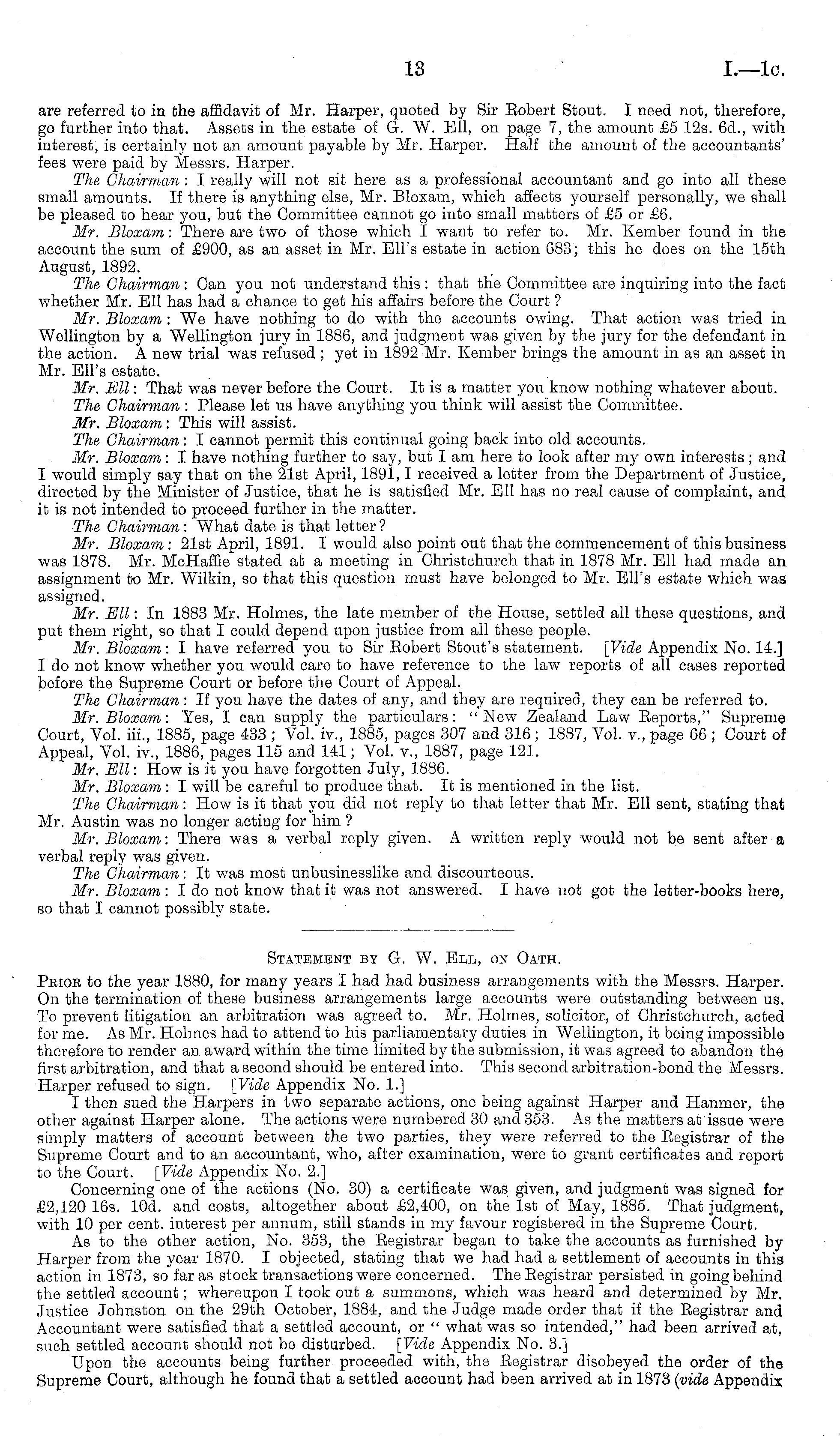 are referred to in the affidavit of Mr. Harper, quoted by Sir Eobert Stout. I need not, therefore, go further into that. Assets in the estate of G. W. Ell, on page 7, the amount £5 12s. 6d., with interest, is certainly not an amount payable by Mr. Harper. Half the amount of the accountants' fees were paid by Messrs. Harper. The Chairman : I really will not sit here as a professional accountant and go into all these small amounts. If there is anything else, Mr. Bloxam, which affects yourself personally, we shall be pleased to hear you, but the Committee cannot go into small matters of £5 or £6. Mr. Bloxam: There are two of those which I want to refer to. Mr. Kember found in the account the sum of £900, as an asset in Mr. Ell's estate in action 683; this he does on the 15th August, 1892. The Chairman : Can you not understand this : that the Committee are inquiring into the fact whether Mr. Ell has had a chance to get his affairs before the Court ? Mr. Bloxam :We have nothing to do with the accounts owing. That action was tried in Wellington by a Wellington jury in 1886, and judgment was given by the jury for the defendant in the action. A new trial was refused ; yet in 1892 Mr. Kember brings the amount in as an asset in Mr. Ell's estate. Mr. Ell : That was never before the Court. It is a matter you know nothing whatever about. The Chairman : Please let us have anything you think will assist the Committee. Mr. Bloxam: This will assist. The Chairman: I cannot permit this continual going back into old accounts. Mr. Bloxam: I have nothing further to say, but lam here to look after my own interests; and I would simply say that on the 21st April, 1891,1 received a letter from the Department of Justice, directed by the Minister of Justice, that he is satisfied Mr. Ell has no real cause of complaint, and it is not intended to proceed further in the matter. The Chairman: What date is that letter ? Mr. Bloxam : 21st April, 1891. I would also point out that the commencement of this business was 1878. Mr. McHaffie stated at a meeting in Christchurch that in 1878 Mr. Ell had made an assignment to Mr. Wilkin, so that this question must have belonged to Mr. Ell's estate which was assigned. Mr. Ell: In 1883 Mr. Holmes, the late member of the House, settled all these questions, and put them right, so that I could depend upon justice from all these people. Mr. Bloxam : I have referred you to Sir Eobert Stout's statement. [Vide Appendix No. 14.] I do not know whether you would care to have reference to the law reports of all cases reported before the Supreme Court or before the Court of Appeal. The Chairman : If you have the dates of any, and they are required, they can be referred to. Mr. Bloxam: Yes, I can supply the particulars: "New Zealand Law Eeports," Supreme Court, Vol. in., 1885, page 433 ; Vol.'iv., 1885, pages 307 and 316; 1887, Vol. v., page 66 ; Court of Appeal, Vol. iv., 1886, pages 115 and 141; Vol. v., 1887, page 121. Mr. Ell: How is it you have forgotten July, 1886. Mr. Bloxam : I will be careful to produce that. It is mentioned in the list. The Chairman: How is it that you did not reply to that letter that Mr. Ell sent, stating that Mr. Austin was no longer acting for him ? Mr. Bloxam: There was a verbal reply given. A written reply would not be sent after a verbal reply was given. The Chairman: It was most unbusinesslike and discourteous. Mr. Bloxam :I do not know that it was not answered. I have not got the letter-books here, so that I cannot possibly state.