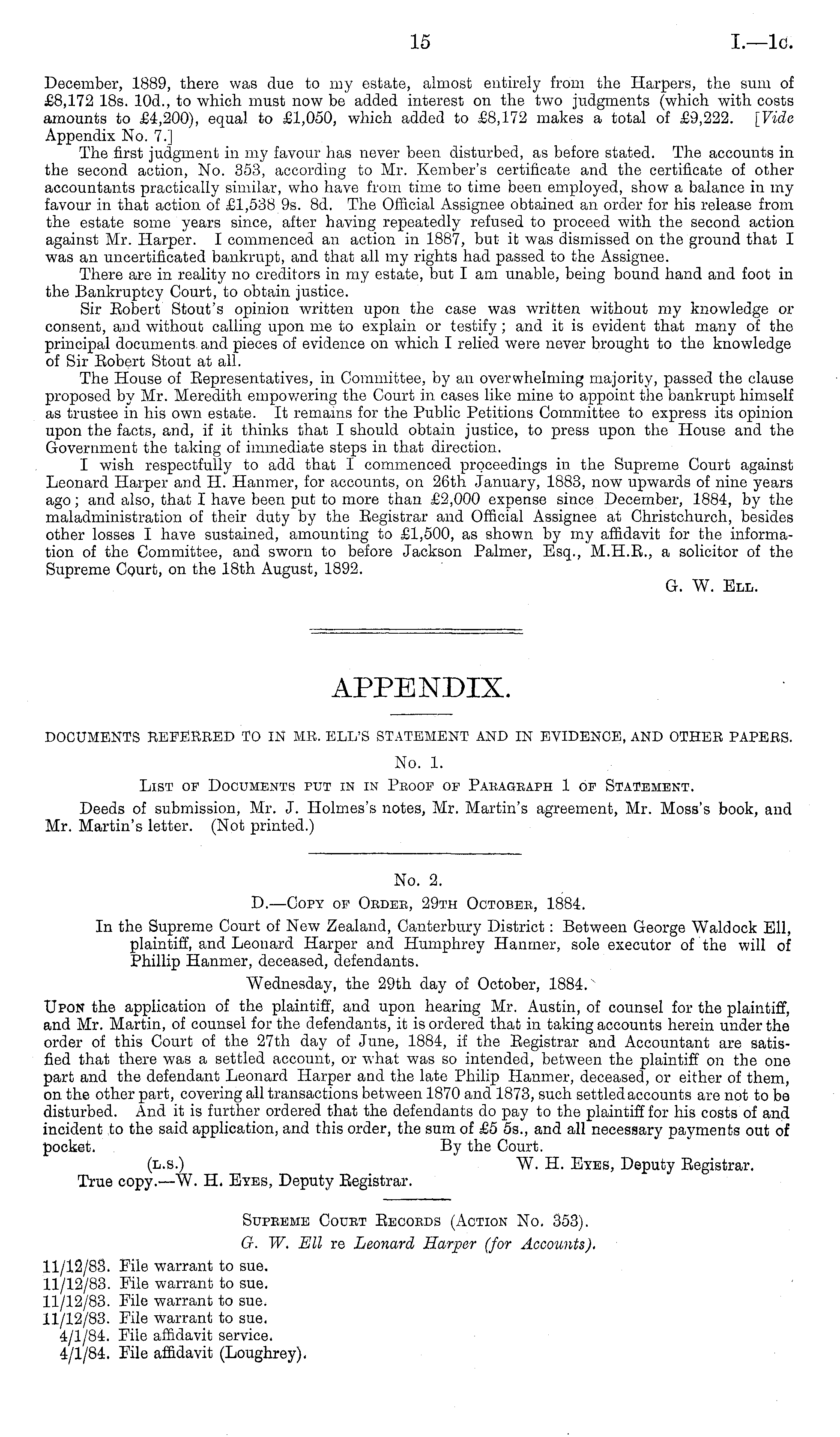 December, 1889, there was due to my estate, almost entirely from the Harpers, the sum of £8,172 18s. 10d., to which must now be added interest on the two judgments (which with costs amounts to £4,200), equal to £1,050, which added to £8,172 makes a total of £9,222. [Vide Appendix No. 7.] The first judgment in my favour has never been disturbed, as before stated. The accounts in the second action, No. 353, according to Mr. Kember's certificate and the certificate of other accountants practically similar, who have from time to time been employed, show a balance in my favour in that action of £1,538 9s. Bd. The Official Assignee obtained an order for his release from the estate some years since, after having repeatedly refused to proceed with the second action against Mr. Harper. I commenced an action in 1887, but it was dismissed on the ground that I was an uncertificated bankrupt, and that all my rights had passed to the Assignee. There are in reality no creditors in my estate, but I am unable, being bound hand and foot in the Bankruptcy Court, to obtain justice. Sir Eobert Stout's opinion written upon the case was written without my knowledge or consent, and without calling upon me to explain or testify ; and it is evident that many of the principal documents, and pieces of evidence on which I relied were never brought to the knowledge of Sir Eobert Stout at all. The House of Eepresentatives, in Committee, by an overwhelming majority, passed the clause proposed by Mr. Meredith empowering the Court in cases like mine to appoint the bankrupt himself as trustee in his own estate. It remains for the Public Petitions Committee to express its opinion upon the facts, and, if it thinks that I should obtain justice, to press upon the House and the Government the taking of immediate steps in that direction. I wish respectfully to add that I commenced proceedings in the Supreme Court against Leonard Harper and H. Hanmer, for accounts, on 26th January, 1883, now upwards of nine years ago; and also, that I have been put to more than £2,000 expense since December, 1884, by the maladministration of their duty by the Eegistrar and Official Assignee at Christchurch, besides other losses I have sustained, amounting to £1,500, as shown by my affidavit for the information of the Committee, and sworn to before Jackson Palmer, Esq., M.H.E., a solicitor of the Supreme Court, on the 18th August, 1892. G. W. Ell.