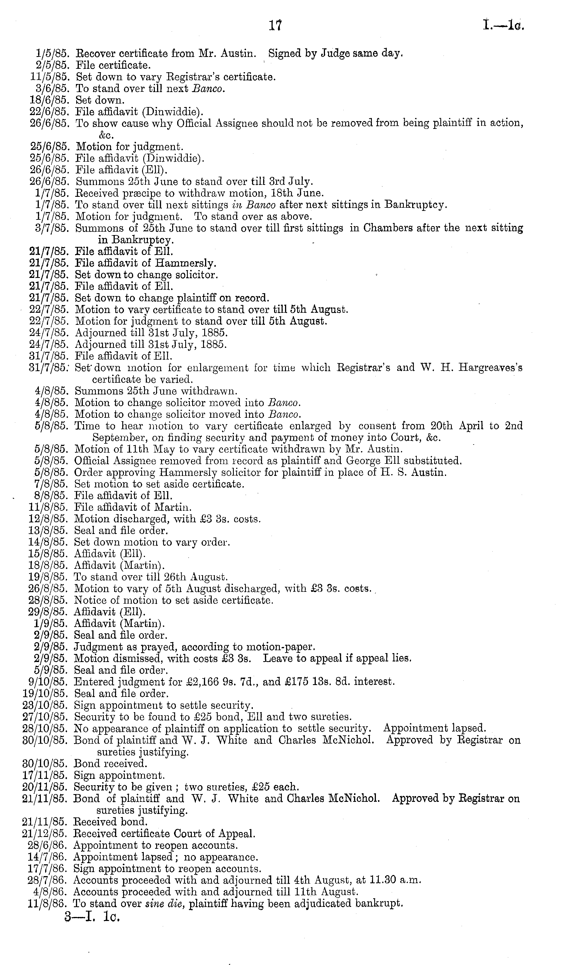 1/5/85. Eecover certificate from Mr. Austin. Signed by Judge same day. 2/5/85. File certificate. 11/5/85. Set down to vary Registrar's certificate. 3/6/85. To stand over till next Banco. 18/6/85. Set down. 22/6/85. File affidavit (Dinwiddie). 26/6/85. To show cause why Official Assignee should not be removed from being plaintiff in action, &c. 25/6/85. Motion for judgment. 25/6/85. File affidavit (Dinwiddie). 26/6/85. File affidavit (Ell). 26/6/85. Summons 25th June to stand over till 3rd July. 1/7/85. Eeceived praecipe to withdraw motion, 18th June. 1/7/85. To stand over till next sittings in Banco after next sittings in Bankruptcy. 1/7/85. Motion for judgment. To stand over as above. 3/7/85. Summons of 25th June to stand over till first sittings in Chambers after the next sitting in Bankruptcy. 21/7/85. File affidavit of Ell. 21/7/85. File affidavit of Hammersly. 21/7/85. Set down to change solicitor. 21/7/85. File affidavit of Ell. 21/7/85. Set down to change plaintiff on record. 22/7/85. Motion to vary certificate to stand over till sth August. 22/7/85. Motion for judgment to stand over till sth August. 24/7/85. Adjourned till 31st July, 1885. 24/7/85. Adjourned till 31st July, 1885. 31/7/85. File affidavit of Ell. 31/7/85.' Set'down motion for enlargement for time which Registrar's and W. H. Hargreaves's certificate be varied. 4/8/85. Summons 25th June withdrawn. 4/8/85. Motion to change solicitor moved into Banco. 4/8/85. Motion to change solicitor moved into Banco. 5/8/85. Time to hear motion to vary certificate enlarged by consent from 20th April to 2nd September, on finding security and payment of money into Court, &c. 5/8/85. Motion of 11th May to vary certificate withdrawn by Mr. Austin. 5/8/85. Official Assignee removed from record as plaintiff and George Ell substituted. 5/8/85. Order approving Hammersly solicitor for plaintiff in place of H. S. Austin. 7/8/85. Set motion to set aside certificate. 8/8/85. File affidavit of Ell. 11/8/85. File affidavit of Martin. 12/8/85. Motion discharged, with £3 3s. costs. 13/8/85. Seal and file order. 14/8/85. Set down motion to vary order. 15/8/85. Affidavit (Ell). 18/8/85. Affidavit (Martin). 19/8/85. To stand over till 26th August. 26/8/85. Motion to vary of sth August discharged, with £3 3s. costs. 28/8/85. Notice of motion to set aside certificate. 29/8/85. Affidavit (Ell). 1/9/85. Affidavit (Martin). 2/9/85. Seal and file order. 2/9/85. Judgment as prayed, according to motion-paper. 2/9/85. Motion dismissed, with costs £3 3s. Leave to appeal if appeal lies. 5/9/85. Seal and file order. 9/10/85. Entered judgment for £2,166 9s. 7d., and £175 13s. Bd. interest. 19/10/85. Seal and file order. 23/10/85. Sign appointment to settle security. 27/10/85. Security to be found to £25 bond, Ell and two sureties. 28/10/85. No appearance of plaintiff on application to settle security. Appointment lapsed. 30/10/85. Bond of plaintiff and W. J. White and Charles McNichol. Approved by Registrar on sureties justifying. 30/10/85. Bond received. 17/11/85. Sign appointment. 20/11/85. Security to be given ; two sureties, £25 each. 21/11/85. Bond of plaintiff and W. J. White and Charles McNichol. Approved by Registrar on sureties justifying. 21/11/85. Received bond. 21/12/85. Received certificate Court of Appeal. 28/6/86. Appointment to reopen accounts. 14/7/86. Appointment lapsed; no appearance. 17/7/86. Sign appointment to reopen accounts. 28/7/86. Accounts proceeded with and adjourned till 4th August, at 11.30 a.m. 4/8/86. Accounts proceeded with and adjourned till 11th August. 11/8/88. To stand over sine die, plaintiff having been adjudicated bankrupt. 3—l. lc.