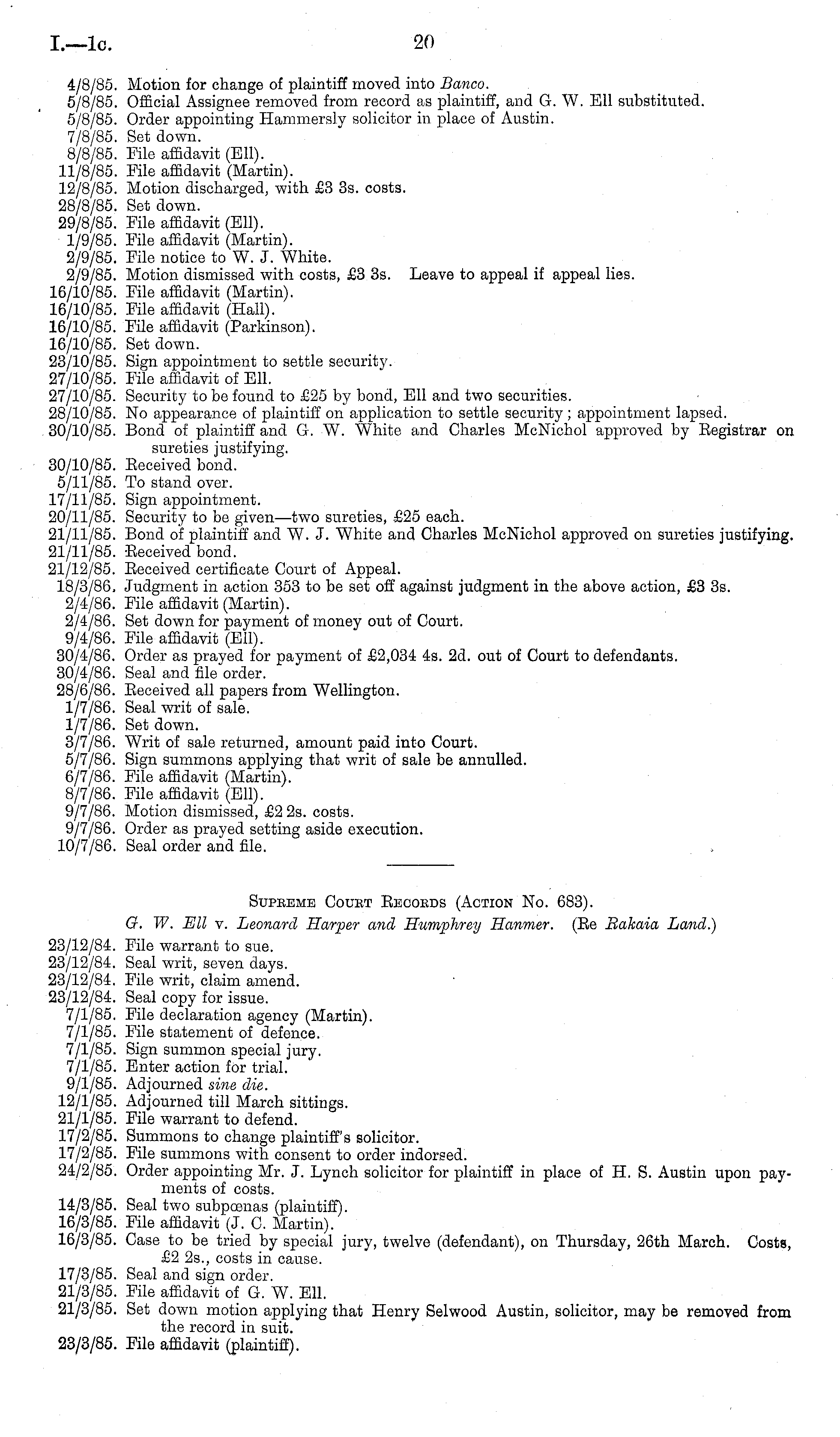 Supeeme Covet Becoeds (Action No. 683). G. W. Ell v. Leonard Harper and Humphrey Hanmer. (Be Bakaia Land.) 23/12/84. File warrant to sue. 23/12/84. Seal writ, seven days. 23/12/84. Pile writ, claim amend. 23/12/84. Seal copy for issue. 7/1/85. Pile declaration agency (Martin). 7/1/85. File statement of defence. 7/1/85. Sign summon special jury. 7/1/85. Enter action for trial. 9/1/85. Adjourned sine die. 12/1/85. Adjourned till March sittings. 21/1/85. Pile warrant to defend. 17/2/85. Summons to change plaintiff's solicitor. 17/2/85. File summons with consent to order indorsed. 24/2/85. Order appointing Mr. J. Lynch solicitor for plaintiff in place of H. S. Austin upon payments of costs. 14/3/85. Seal two subpoenas (plaintiff). 16/3/85. File affidavit '(J. C. Martin). 16/3/85. Case to be tried by special jury, twelve (defendant), on Thursday, 26th March. Costs, £2 25., costs in cause. 17/3/85. Seal and sign order. 21/3/85. Pile affidavit of G. W. Ell. 21/3/85. Set down motion applying that Henry Selwood Austin, solicitor, may be removed from the record in suit. 23/3/85. File affidavit (plaintiff).