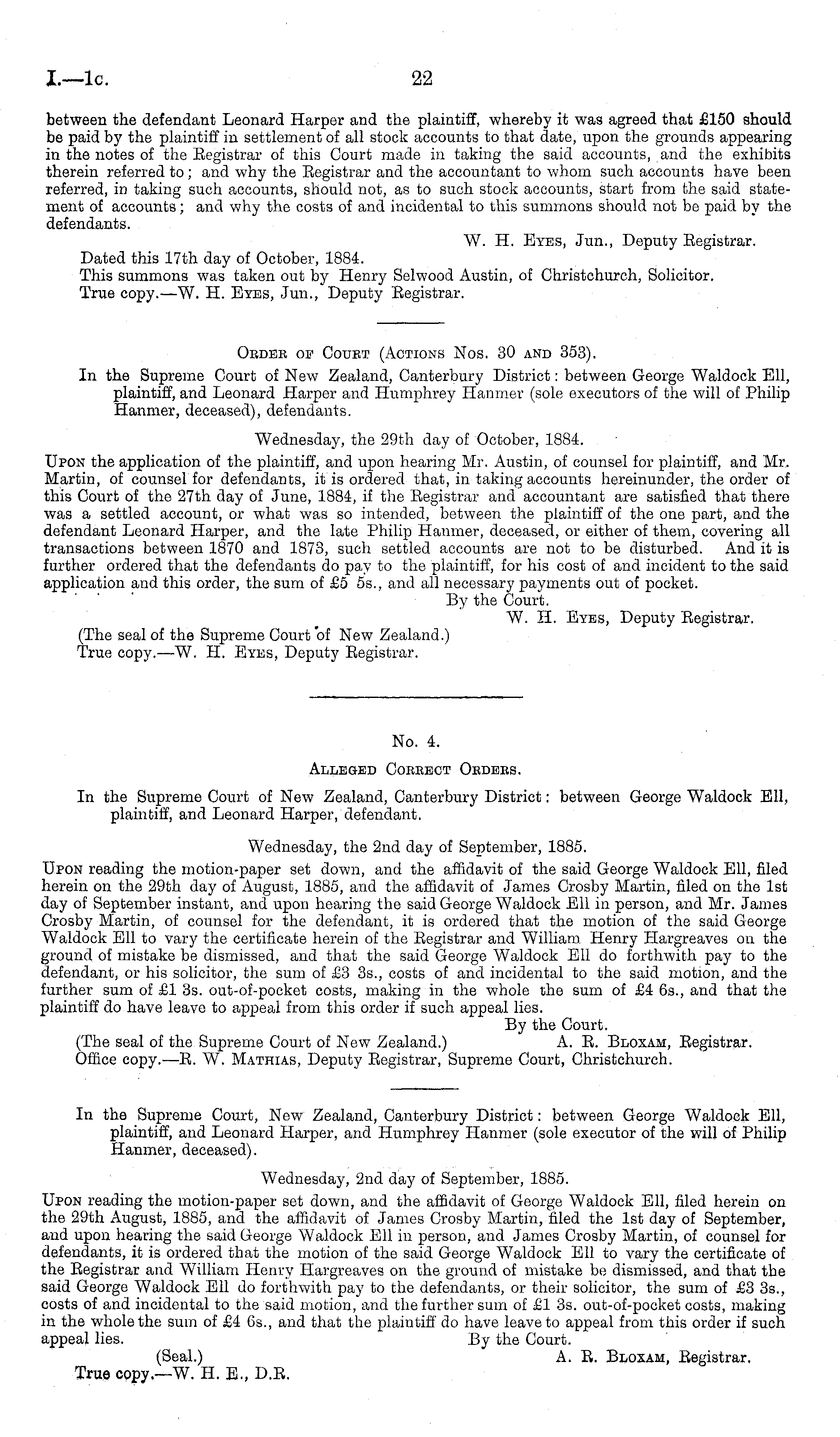 No. 4. Alleged Correct Ordees. In the Supreme Court of New Zealand, Canterbury District: between George Waldock Ell, plaintiff, and Leonard Harper, defendant. Wednesday, the 2nd day of September, 1885. Upon reading the motion-paper set down, and the affidavit of the said George Waldock Ell, filed herein on the 29th day of August, 1885, and the affidavit of James Crosby Martin, filed on the Ist day of September instant, and upon hearing the said George Waldock Ell in person, and Mr. James Crosby Martin, of counsel for the defendant, it is ordered that the motion of the said George Waldock Ell to vary the certificate herein of the Begistrar and William Henry Hargreaves on the ground of mistake be dismissed, and that the said George Waldock Ell do forthwith pay to the defendant, or his solicitor, the sum of £3 35., costs of and incidental to the said motion, and the further sum of £1 3s. out-of-pocket costs, making in the whole the sum of £4 65., and that the plaintiff do have leave to appeal from this order if such appeal lies. By the Court. (The seal of the Supreme Court of New Zealand.) A. B. Bloxam, Begistrar. Office copy.—B. W T . Mathias, Deputy Begistrar, Supreme Court, Christchurch.