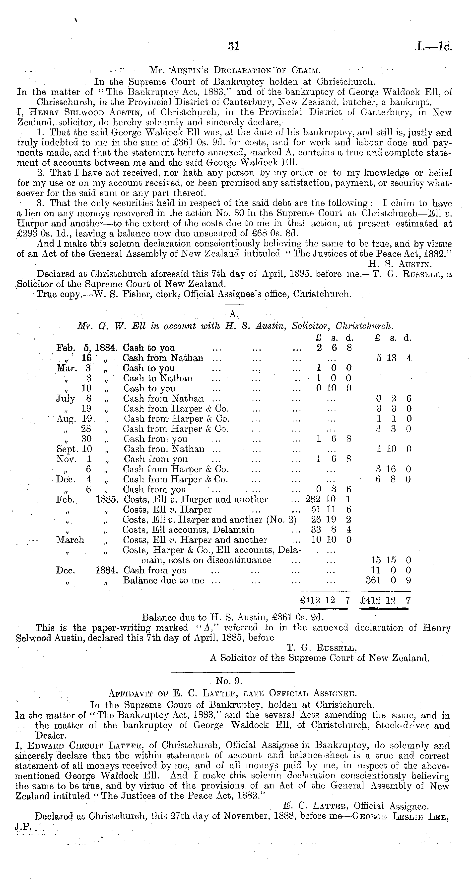 ■;,--• ■. -■" Mr.'Austin's Declabation "of Claim. In the Supreme Court of Bankruptcy holden at Christchurch. In the matter of " The Bankruptcy Act, 1883," and of the bankruptcy of George Waldock Ell, of Christchurch, in the Provincial District of Canterbury, New Zealand, butcher, a bankrupt. I, Henry Selwood Austin, of Christchurch, in the Provincial District of Canterbury, in New Zealand, solicitor, do hereby solemnly and sincerely declare, — 1. That the said George Waldock Ell was, at the date of his bankruptcy, and still is, justly and truly indebted to me in the sum of £361 os. 9d. for costs, and for work and labour done and payments made, and that the statement hereto annexed, marked A, contains a true and complete statement of accounts between me and the said George Waldock Ell. 2. That I have not received, nor hath any person by my order or to my knowledge or belief for my use or on my account received, or been promised any satisfaction, payment, or security whatsoever for the said sum or any part thereof. 3. That the only securities held in respect of the said debt are the following : I claim to have a lien on any moneys recovered in the action No. 30 in the Supreme Court at Christchurch—Ell v. Harper and another —to the extent of the costs due to me in that action, at present estimated at £293 os. Id., leaving a balance now due unsecured of £68 os. Bd. And I make this solemn declaration conscientiously believing the same to be true, and by virtue of an Act of the General Assembly of New Zealand intituled " The Justices of the Peace Act, 1882." H. S. Austin. Declared at Christchurch aforesaid this 7th day of April, 1885, before me. —T. G. Eussell, a Solicitor of the Supreme Court of New Zealand. True copy.—W. S. Fisher, clerk, Official Assignee's office, Christchurch.