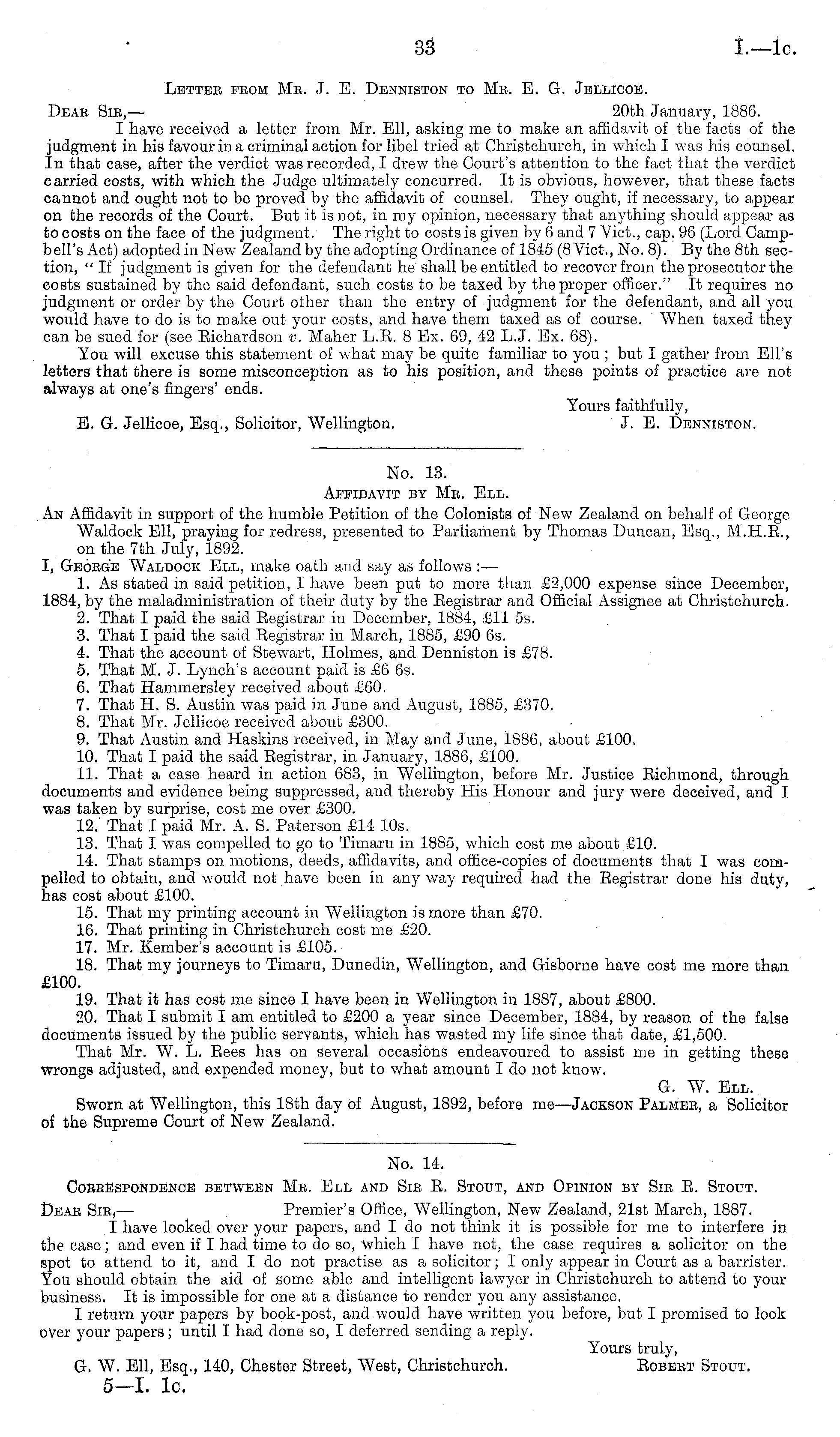 No. 14. Correspondence between Me. Ell and Sib E. Stout, and Opinion by Sic E. Stout. Deak Sic, — Premier's Office, Wellington, New Zealand, 21st March, 1887. I have looked over your papers, and I do not think it is possible for me to interfere in the case; and even if I had time to do so, which I have not, the case requires a solicitor on the spot to attend to it, and I do not practise as a solicitor; I only appear in Court as a barrister. You should obtain the aid of some able and intelligent lawyer in Christchurch to attend to your business. It is impossible for one at a distance to render you any assistance. I return your papers by book-post, and.would have written you before, but I promised to look over your papers; until I had done so, I deferred sending a reply. Yours truly, G. W. Ell, Esq., 140, Chester Street, West, Christchurch. Eobeet Stout. 5-1. lc.