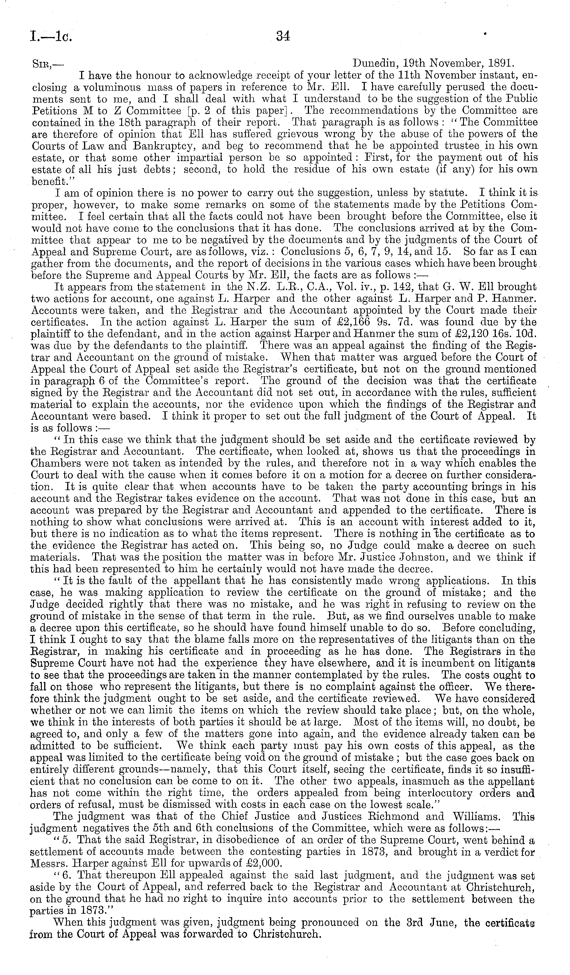 Sib,— Dunedin, 19th November, 1891. I have the honour to acknowledge receipt of your letter of the 11th November instant, enclosing a voluminous mass of papers in reference to Mr. Ell. I have carefully perused the documents sent to me, and I shall deal with what I understand to be the suggestion of the Public Petitions M to Z Committee [p. 2 of this paper] . The recommendations by the Committee are contained in the 18th paragraph of their report. That paragraph is as follows : " The Committee are therefore of opinion that Ell has suffered grievous wrong by the abuse of the powers of the Courts of Law and Bankruptcy, and beg to recommend that he be appointed trustee in his own estate, or that some other impartial person be so appointed : First, for the payment out of his estate of all his just debts; second, to hold the residue of his own estate (if any) for his own benefit." lam of opinion there is no power to carry out the suggestion, unless by statute. I think it is proper, however, to make some remarks on some of the statements made by the Petitions Committee. I feel certain that all the facts could not have been brought before the Committee, else it would not have come to the conclusions that it has done. The conclusions arrived at by the Committee that appear to me to be negatived by the documents and by the judgments of the Court of Appeal and Supreme Court, are as follows, viz. : Conclusions 5, 6, 7, 9, 14, and 15. So far as I can gather from the documents, and the report of decisions in the various cases which have been brought before the Supreme and Appeal Courts by Mr. Ell, the facts are as follows : — It appears from the statement in the N.Z. L.E., C.A., Vol. iv., p. 142, that G. W. Ell brought two actions for account, one against L. Harper and the other against L. Harper and P. Hanmer. Accounts were taken, and the Registrar and the Accountant appointed by the Court made their certificates. In the action against L. Harper the sum of £2,166 9s. 7d. was found due by the plaintiff to the defendant, and in the action against Harper and Hanmer the sum of £2,120 16s. 10d. was due by the defendants to the plaintiff. There was an appeal against the finding of the Registrar and Accountant on the ground of mistake. When that matter was argued before the Court of Appeal the Court of Appeal set aside the Registrar's certificate, but not on the ground mentioned in paragraph 6of the Committee's report. The ground of the decision was that the certificate signed by the Registrar and the Accountant did not set out, in accordance with the rules, sufficient material to explain the accounts, nor the evidence upon which the findings of the Registrar and Accountant were based. I think it proper to set out the full judgment of the Court of Appeal. It is as follows :— " In this case we think that the judgment should be set aside and the certificate reviewed by the Registrar and Accountant. The certificate, when looked at, shows us that the proceedings in Chambers were not taken as intended by the rules, and therefore not in a way which enables the Court to deal with the cause when it comes before it on a motion for a decree on further consideration. It is quite clear that when accounts have to be taken the party accounting brings in his account and the Registrar takes evidence on the account. That was not done in this case, but an account was prepared by the Registrar and Accountant and appended to the certificate. There is nothing to show what conclusions were arrived at. This is an account with interest added to it, but there is no indication as to what the items represent. There is nothing in "the certificate as to the evidence the Registrar has acted on. This being so, no Judge could make a decree on such materials. That was the position the matter was in before Mr. Justice Johnston, and we think if this had been represented to him he certainly would not have made the decree. "It is the fault of the appellant that he has consistently made wrong applications. In this case, he was making application to review the certificate on the ground of mistake; and the Judge decided rightly that there was no mistake, and he was right in refusing to review on the ground of mistake in the sense of that term in the rule. But, as we find ourselves unable to make a decree upon this certificate, so he should have found himself unable to do so. Before concluding, I think I ought to say that the blame falls more on the representatives of the litigants than on the Registrar, in making his certificate and in proceeding as he has done. The Registrars in the Supreme Court have not had the experience they have elsewhere, and it is incumbent on litigants to see that the proceedings are taken in the manner contemplated by the rules. The costs ought to fall on those who represent the litigants, but there is no complaint against the officer. We therefore think the judgment ought to be set aside, and the certificate reviewed. We have considered whether or not we can limit the items on which the review should take place; but, on the whole, we think in the interests of both parties it should be at large. Most of the items will, no doubt, be agreed to, and only a few of the matters gone into again, and the evidence already taken can be admitted to be sufficient. We think each party must pay his own costs of this appeal, as the appeal was limited to the certificate being void on the ground of mistake ; but the case goes back on entirely different grounds—namely, that this Court itself, seeing the certificate, finds it so insufficient that no conclusion can be come to on it. The other two appeals, inasmuch as the appellant has not come within the right time, the orders appealed from being interlocutory orders and orders of refusal, must be dismissed with costs in each case on the lowest scale." The judgment was that of the Chief Justice and Justices Richmond and Williams. This judgment negatives the sth and 6th conclusion