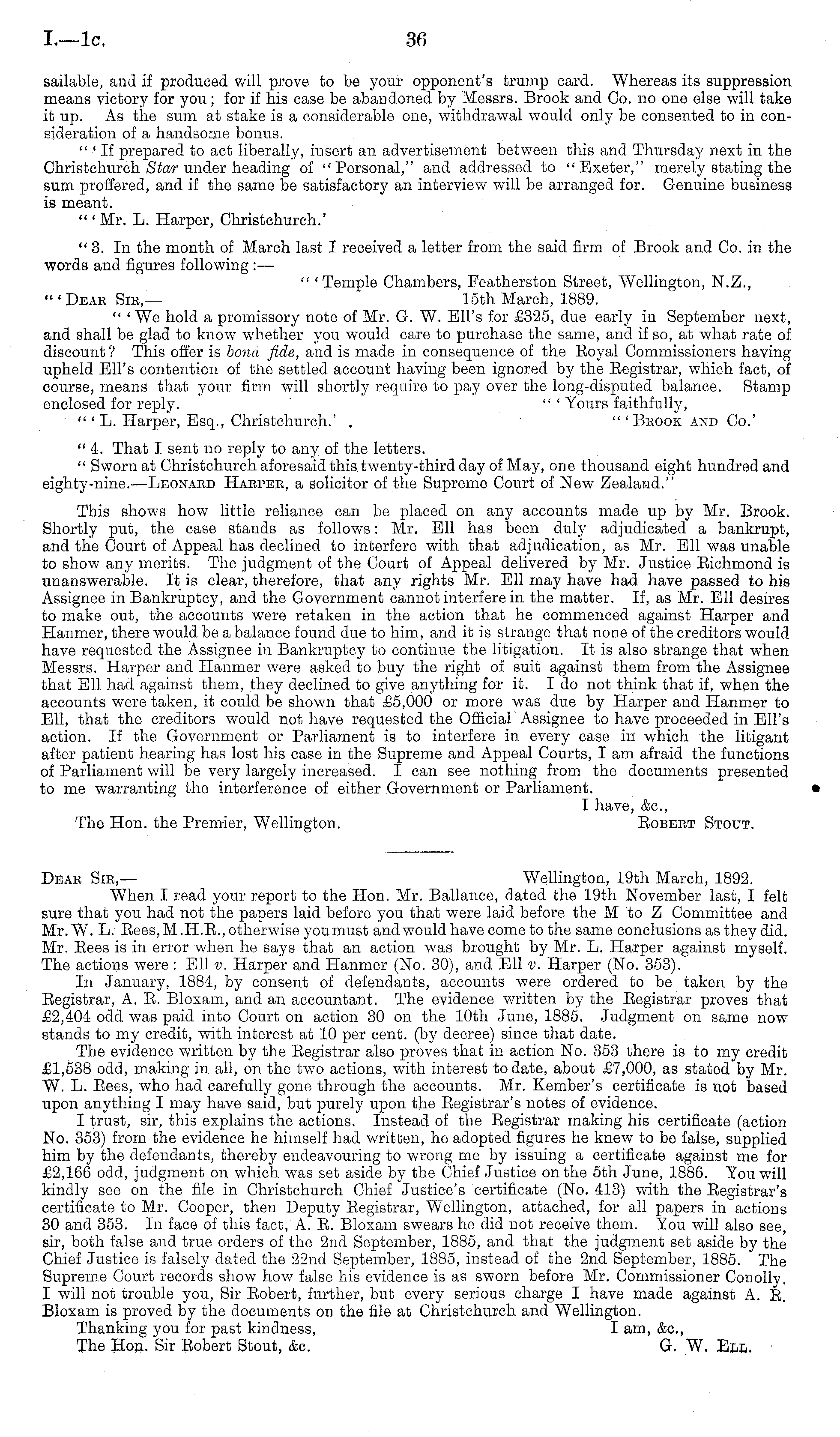 Deae Sir,— Wellington, 19th March, 1892. When I read your report to the Hon. Mr. Ballance, dated the 19th November last, I felt sure that you had not the papers laid before you that were laid before the M to Z Committee and Mr.W. L. Rees, M.H.R., otherwise you must andwould have come to the same conclusions as they did. Mr. Rees is in error when he says that an action was brought by Mr. L. Harper against myself. The actions were : Ell v. Harper and Hanmer (No. 30), and Ell v. Harper (No. 353). In January, 1884, by consent of defendants, accounts were ordered to be taken by the Registrar, A. R. Bloxam, and an accountant. The evidence written by the Registrar proves that £2,404 odd was paid into Court on action 30 on the 10th June, 1885. Judgment on same now stands to my credit, with interest at 10 per cent, (by decree) since that date. The evidence written by the Registrar also proves that in action No. 353 there is to my credit £1,538 odd, making in all, on the two actions, with interest to date, about £7,000, as stated by Mr. W. L. Rees, who had carefully gone through the accounts. Mr. Kember's certificate is not based upon anything I may have said, but purely upon the Registrar's notes of evidence. I trust, sir, this explains the actions. Instead of the Registrar making his certificate (action No. 353) from the evidence he himself had written, he adopted figures he knew to be false, supplied him by the defendants, thereby endeavouring to wrong me by issuing a certificate against me for £2,166 odd, judgment on which was set aside by the Chief Justice on the sth June, 1886. You will kindly see on the file in Christchurch Chief Justice's certificate (No. 413) w r ith the Registrar's certificate to Mr. Cooper, then Deputy Registrar, Wellington, attached, for all papers in actions 30 and 353. In face of this fact, A. R. Bloxam swears he did not receive them. You will also see, sir, both false and true orders of the 2nd September, 1885, and that the judgment set aside by the Chief Justice is falsely dated the 22nd September, 1885, instead of the 2nd September, 1885. The Supreme Court records show how false his evidence is as sworn before Mr. Commissioner Conolly. I will not trouble you, Sir Robert, further, but every serious charge I have made against A. E. Bloxam is proved by the documents on the file at Christchurch and Wellington. Thanking you for past kindness, I am, &c, The Hon. Sir Robert Stout, &c. G. W. Ell.