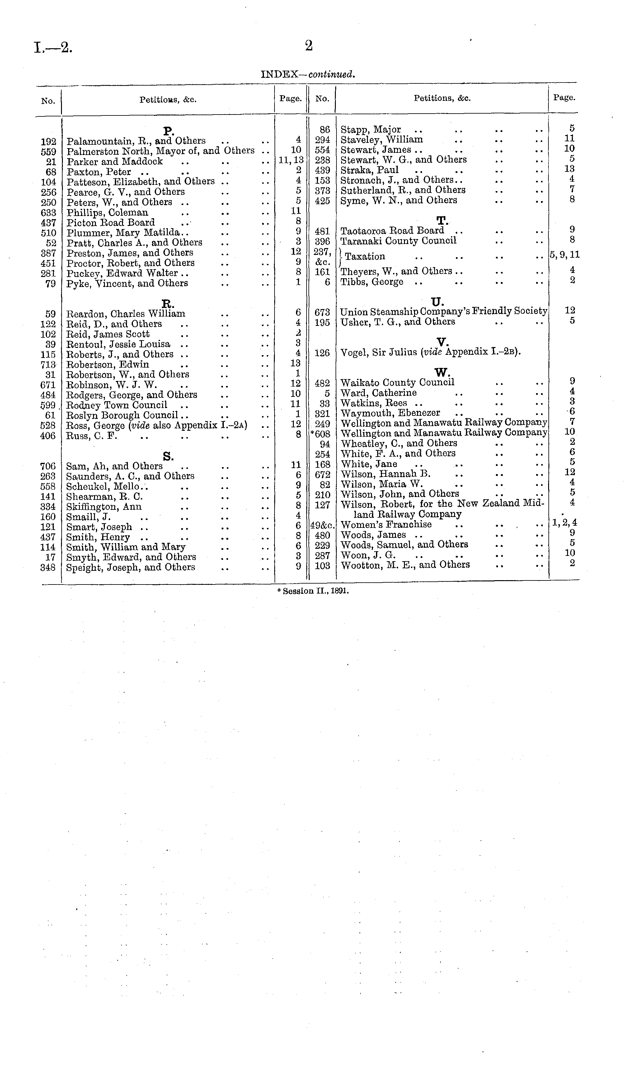 No. Petitioas, &c. Page. No. Petitions, &c. Page. 192 559 21 68 104 256 250 633 437 510 52 387 451 281 79 P. Palamountain, E., and Others Palmerston North, Mayor of, and Others .. Parker and Maddook Paxton, Peter .. Patteson, Elizabeth, and Others Pearoe, G. V., and Others Peters, W., and Others Phillips, Coleman Picton Road Board Plumrner, Mary Matilda Pratt, Charles A., and Others Preston, James, and Others Proctor, Robert, and Others Puckey, Edward Walter Pyke, Vincent, and Others 4 10 11,13 2 4 5 5 11 8 9 3 12 9 8 1 86 294 554 238 439 153 373 425 Stapp, Major Staveley, William Stewart, James Stewart, W. G., and Others Straka, Paul Stronach, J., and Others.. Sutherland, R., and Others Syme, W. N., and Others 5 11 10 5 13 4 7 8 481 396 237, &c. 161 6 T. Taotaoroa Road Board .. Taranaki County Council I Taxation Theyers, W., and Others Tibbs, George .. 9 8 5,9,11 4 2 59 122 102 39 115 713 31 671 484 599. 61 528 406 R. Reardon, Charles William Reid, D., and Others Reid, James Scott Rentoul, Jessie Louisa Roberts, J., and Others Robertson, Edwin Robertson, W., and Others Robinson, W. J. W. Rodgers, George, and Others Rodney Town Council Roslyn Borough Council Ross, George (vide also Appendix I.-2A) Russ, C. F. 6 4 I 3 4 18 1 12 10 11 1 12 8 673 195 u. Union Steamship Company's Friendly Society Usher, T. G., and Others 12 5 126 V. Vogel, Sir Julius (vide Appendix I.-2b). 482 5 33 321 249 *608 94 254 168 672 82 210 127 w. Waikato County Council Ward, Catherine Watkins, Rees Waymouth, Ebenezer Wellington and Manawatu Railway Company Wellington and Manawatu Railway Company Wheatley, C, and Others White, F. A., and Others White, Jane Wilson, Hannah B. Wilson, Maria W. Wilson, John, and Others Wilson, Robert, for the New Zealand Midland Railway Company Women's Franchise .. ... Woods, James Woods, Samuel, and Others Woon, J. G. Wootton, M. E., and Others 9 4 3 6 7 10 2 6 5 12 4 5 4 706 263 558 141 334 160 121 437 114 17 348 s. Sam, Ah, and Others Saunders, A. C, and Others Scheukel, Mello.. Shearman, R. C. Skiffington, Ann Smaill, J. Smart, Joseph Smith, Henry Smith, William and Mary Smyth, Edward, and Others Speight, Joseph, and Others 11 6 9 5 8 4 6 8 6 3 9 1,2,4 9 5 10 2 49&c. 480 229 287 103 II. 11.