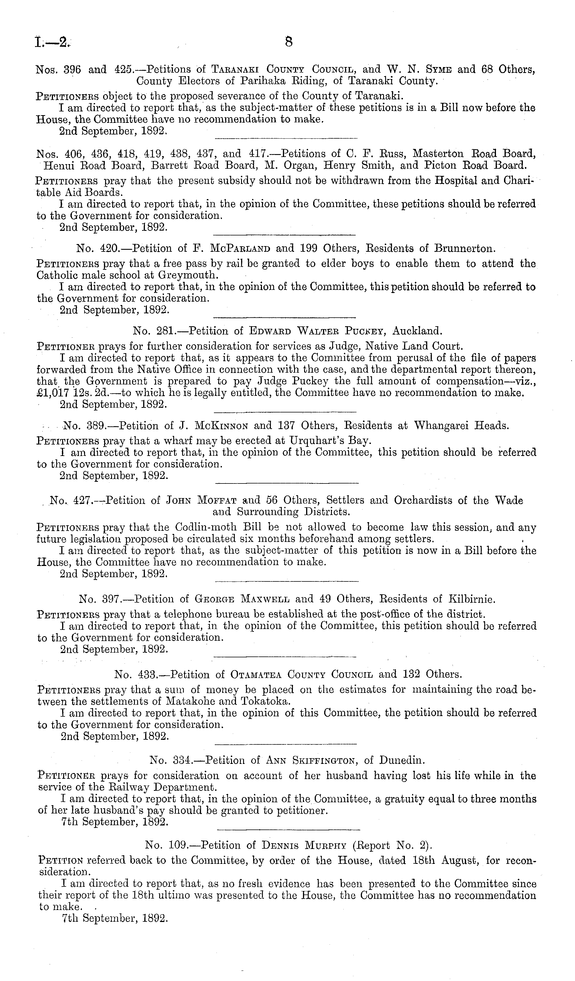 Nos. 396 and 425. —Petitions of Taranaki County Council, and W. N. Syme and 68 Others, County Electors of Parihaka Eiding, of Taranaki County. Petitioners object to the proposed severance of the County of Taranaki. I am directed to report that, as the subject-matter of these petitions is in a Bill now before the House, the Committee have no recommendation to make. 2nd September, 1892.