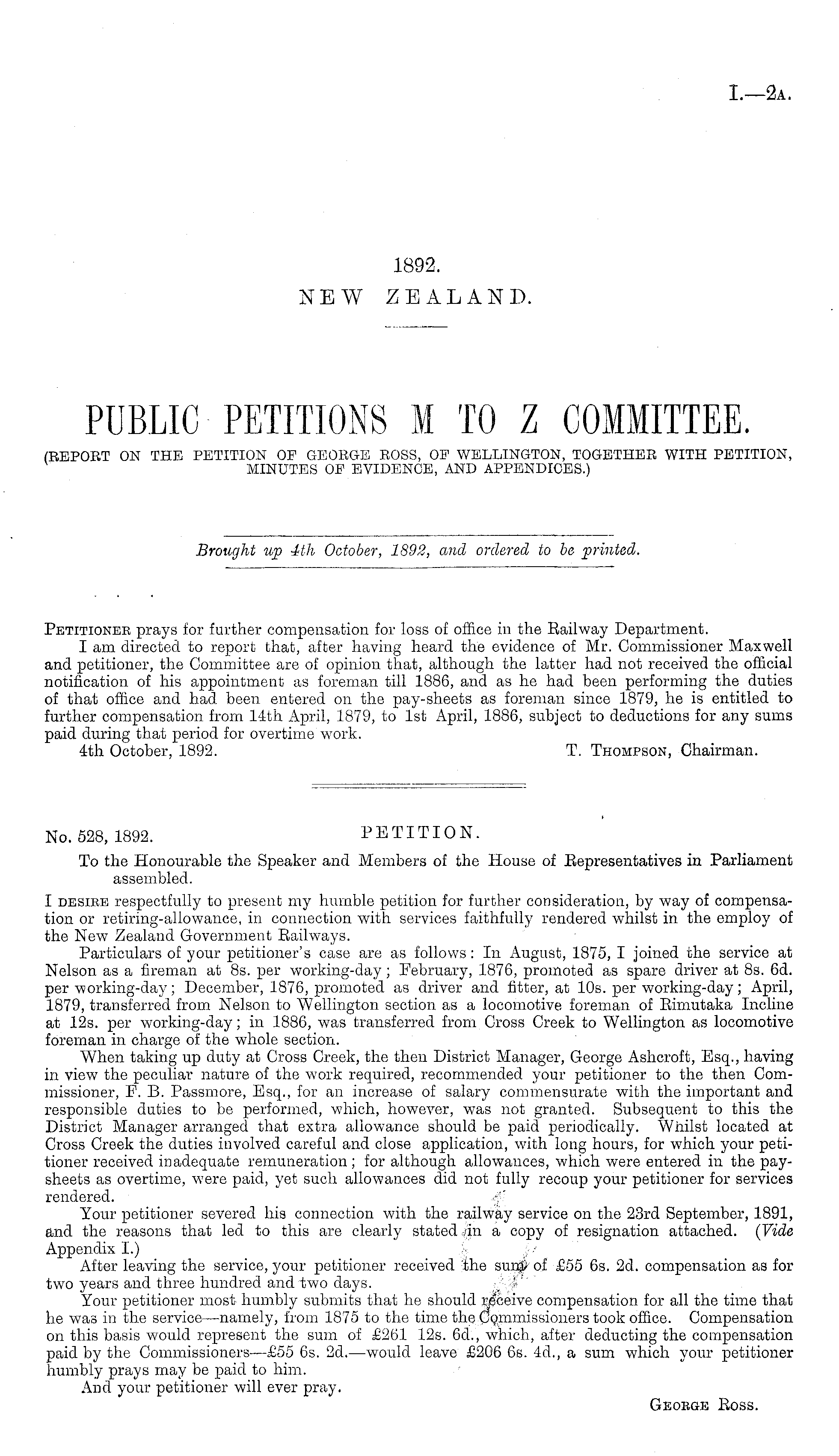 PUBLIC PETITIONS M TO Z COMMITTEE. (REPORT ON THE PETITION OF GEORGE ROSS, OF WELLINGTON, TOGETHER WITH PETITION, MINUTES OF EVIDENCE, AND APPENDICES.)