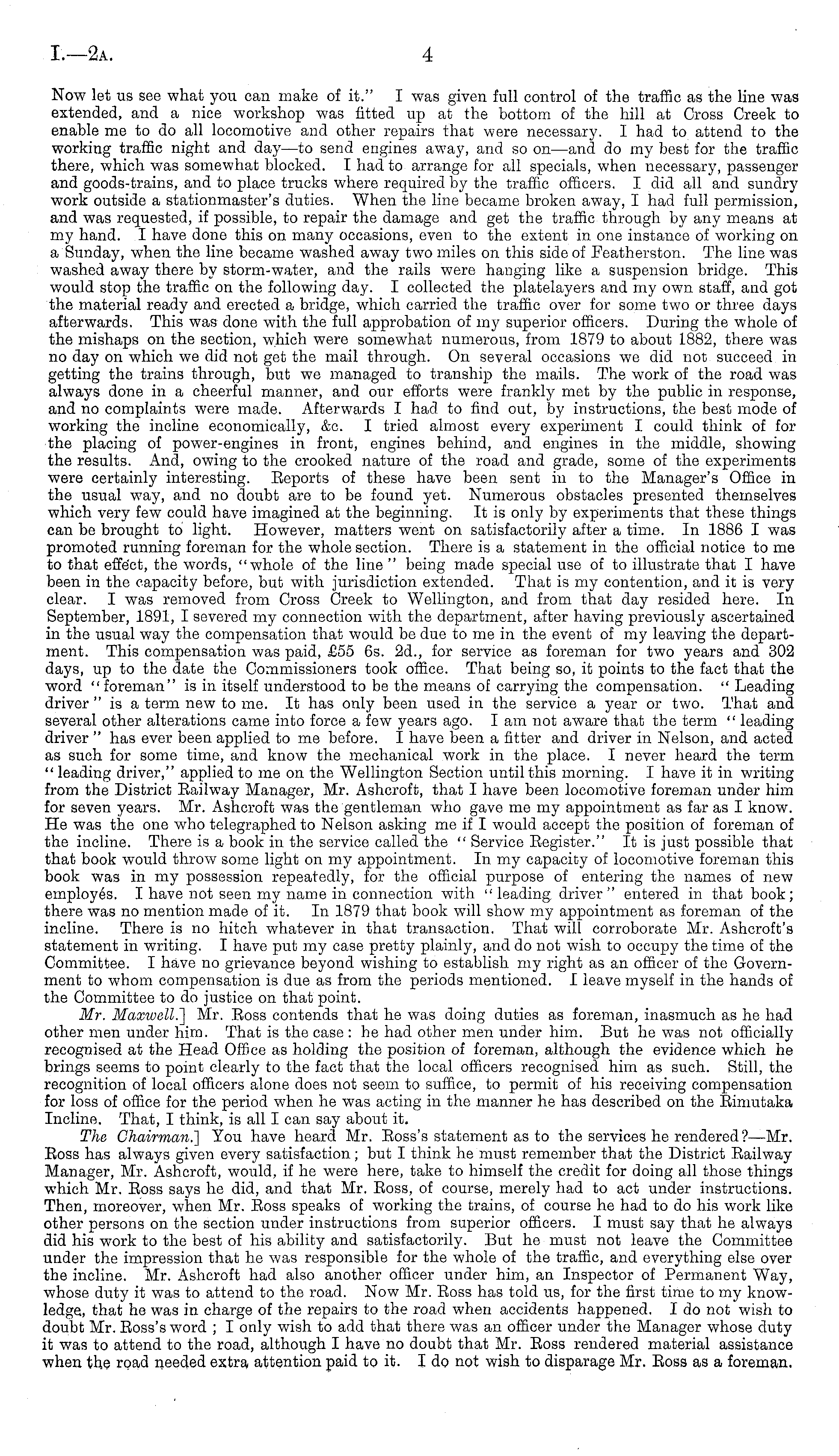 Now let us see what you can make of it." I was given full control of the traffic as the line was extended, and a nice workshop was fitted up at the bottom of the hill at Cross Creek to enable me to do all locomotive and other repairs that were necessary. I had to attend to the working traffic night and day—to send engines away, and so on —and do my best for the traffic there, which was somewhat blocked. I had to arrange for all specials, when necessary, passenger and goods-trains, and to place trucks where required by the traffic officers. I did all and sundry work outside a stationmaster's duties. When the line became broken away, I had full permission, and was requested, if possible, to repair the damage and get the traffic through by any means at my hand. I have done this on many occasions, even to the extent in one instance of working on a Sunday, when the line became washed away two miles on this side of Featherston. The line was washed away there by storm-water, and the rails were hanging like a suspension bridge. This would stop the traffic on the following day. I collected the platelayers and my own staff, and got the material ready and erected a bridge, which carried the traffic over for some two or three days afterwards. This was done with the full approbation of my superior officers. During the whole of the mishaps on the section, which were somewhat numerous, from 1879 to about 1882, there was no day on which we did not get the mail through. On several occasions we did not succeed in getting the trains through, but we managed to tranship the mails. The work of the road was always done in a cheerful manner, and our efforts were frankly met by the public in response, and no complaints were made. Afterwards I had to find out, by instructions, the best mode of working the incline economically, &c. I tried almost every experiment I could think of for the placing of power-engines in front, engines behind, and engines in the middle, showing the results. And, owing to the crooked nature of the road and grade, some of the experiments were certainly interesting. Reports of these have been sent hi to the Manager's Office in the usual way, and no doubt are to be found yet. Numerous obstacles presented themselves which very few could have imagined at the beginning. It is only by experiments that these things can be brought to light. However, matters went on satisfactorily after a time. In 1886 I was promoted running foreman for the whole section. There is a statement in the official notice to me to that effect, the words, "whole of the line " being made special use of to illustrate that I have been in the capacity before, but with jurisdiction extended. That is my contention, and it is very clear. I was removed from Cross Creek to Wellington, and from that day resided here. In September, 1891, I severed my connection with the department, after having previously ascertained in the usual way the compensation that would be due to me in the event of my leaving the department. This compensation was paid, £55 6s. 2d., for service as foreman for two years and 302 days, up to the date the Commissioners took office. That being so, it points to the fact that the word "foreman" is in itself understood to be the means of carrying the compensation. " Leading driver " is a term new to me. It has only been used in the service a year or two. That and several other alterations came into force a few years ago. lam not aware that the term " leading driver " has ever been applied to me before. I have been a fitter and driver in Nelson, and acted as such for some time, and know the mechanical work in the place. I never heard the term " leading driver," applied to me on the Wellington Section until this morning. I have it in writing from the District Railway Manager, Mr. Ashcroft, that I have been locomotive foreman under him for seven years. Mr. Ashcroft was the gentleman who gave me my appointment as far as I know. He was the one who telegraphed to Nelson asking me if I would accept the position of foreman of the incline. There is a book in the service called the " Service Register." It is just possible that that book would throw some light on my appointment. In my capacity of locomotive foreman this book was in my possession repeatedly, for the official purpose of entering the names of new employes. I have not seen my name in connection with "leading driver" entered in that book; there was no mention made of it. In 1879 that book will show my appointment as foreman of the incline. There is no hitch whatever in that transaction. That will corroborate Mr. Ashcroft's statement in writing. I have put my case pretty plainly, and do not wish to occupy the time of the Committee. I have no grievance beyond wishing to establish my right as an officer of the Government to whom compensation is duo as from the periods mentioned. I leave myself in the hands of the Committee to do justice on that point. Mr. Maxwell.~] Mr. Ross contends that he was doing duties as foreman, inasmuch as he had other men under him. That is the case :he had other men under him. But he was not officially recognised at the Head Office as holding the position of foreman, although the evidence which he brings seems to point clearly to the fact that the local officers recognised him as such. Still, the recognition of local officers alone does not seem to suffice, to permit of his receiving compensation for loss of office for the period when he was acting in the manner he has described on the Rimutaka Incline. That, I think, is all I can say about it. The Chairman.] You have heard Mr. Ross's statement as to the services he rendered?— Mr. Ross has always given every satisfaction; but I think he must remember that the District Railway Manager, Mr. Ashcroft, would, if he were here, take to himself the credit for doing all those things which Mr. Ross says he did, and that Mr. Ross, of course, merely had to act under instructions. Then, moreover,