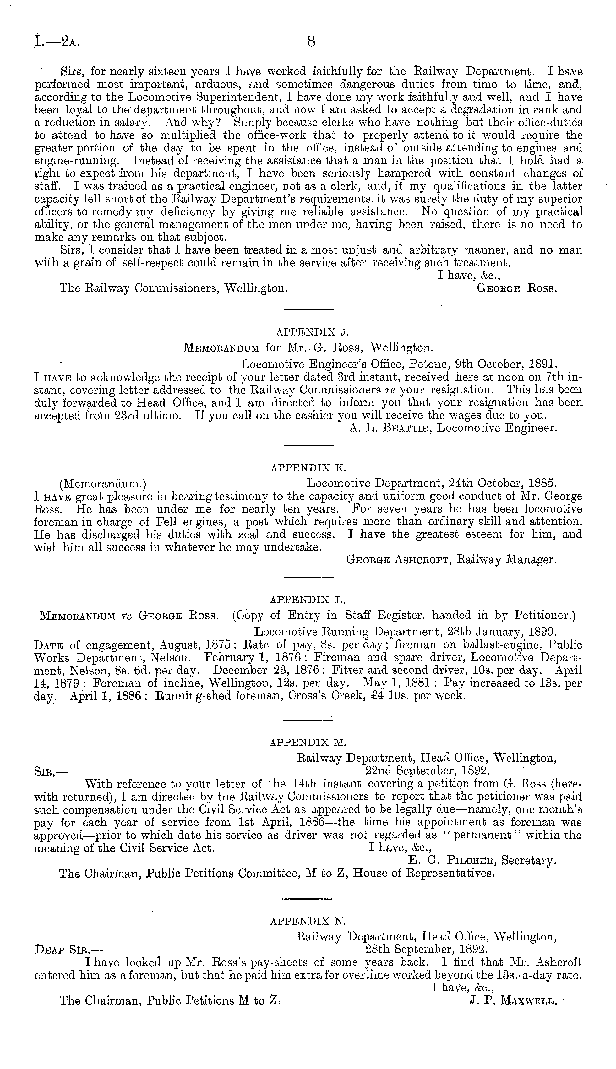APPENDIX L. Memobandum re Geoege Ross. (Copy of Entry in Staff Register, handed in by Petitioner.) Locomotive Running Department, 28th January, 1890. Date of engagement, August, 1875: Rate of pay, Bs. per day; fireman on ballast-engine, Public Works Department, Nelson. February 1, 1876 : Fireman and spare driver, Locomotive Department, Nelson, Bs. 6d. per day. December 23, 1876 : Fitter and second driver, 10s. per day. April 14, 1879 : Foreman of incline, Wellington, 12s. per day. May 1, 1881 : Pay increased to 13s. per day. April 1, 1886 : Running-shed foreman, Cross's Creek, £4 10s. per week.