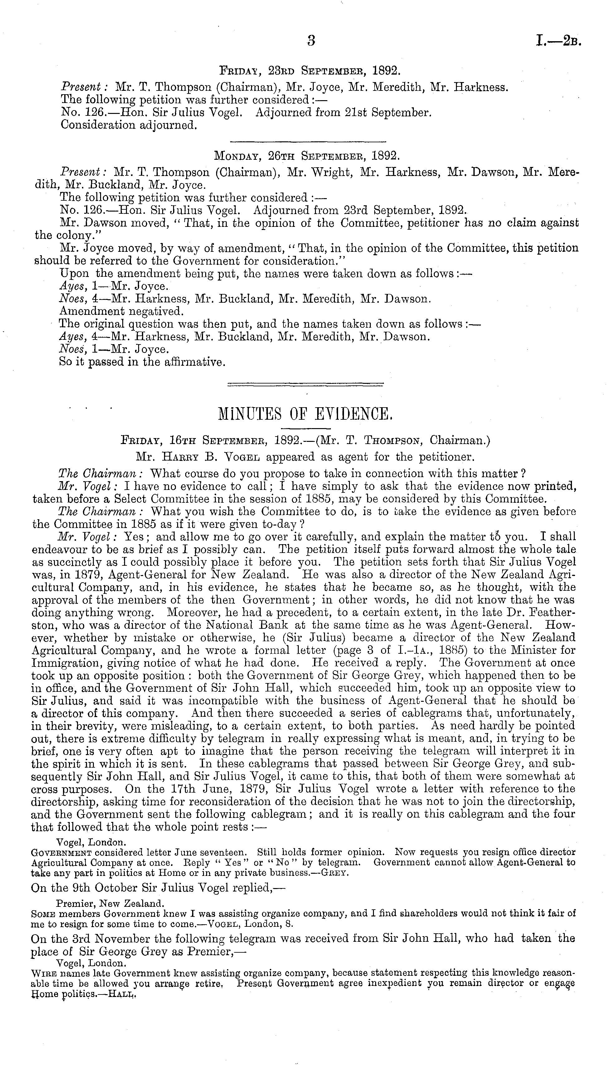 MINUTES OF EVIDENCE. Friday, 16th September, 1892.—(Mr. T. Thompson, Chairman.) Mr. Harry B. Vogel appeared as agent for the petitioner. The Chairman : What course do you propose to take in connection with this matter ? Mr. Vogel: I have no evidence to call; I have simply to ask that the evidence now printed, taken before a Select Committee in the session of 1885, may be considered by this Committee. The Chairman : What you wish the Committee to do, is to take the evidence as given before the Committee in 1885 as if it were given to-day ? Mr. Vogel: Yes ; and allow me to go over it carefully, and explain the matter t& you. I shall endeavour to be as brief as I possibly can. The petition itself puts forward almost the whole tale as succinctly as I could possibly place it before you. The petition sets forth that Sir Julius Vogel was, in 1879, Agent-General for New Zealand. He was also a director of the New Zealand Agricultural Company, and, in his evidence, he states that he became so, as he thought, with the approval of the members of the then Government; in other words, he did not know that he was doing anything wrong. Moreover, he had a precedent, to a certain extent, in the late Dr. Featherston, who was a director of the National Bank at the same time as he was Agent-General. However, whether by mistake or otherwise, he (Sir Julius) became a director of the New Zealand Agricultural Company, and he wrote a formal letter (page 3 of 1.—1α., 1885) to the Minister for Immigration, giving notice of what he had done. He received a reply. The Government at once took up an opposite position : both the Government of Sir George Grey, which happened then to be in office, and the Government of Sir John Hall, which succeeded him, took up an opposite view to Sir Julius, and said it was incompatible with the business of Agent-General that he should be a director of this company. And then there succeeded a series of cablegrams that, unfortunately, in their brevity, were misleading, to a certain extent, to both parties. As need hardly be pointed out, there is extreme difficulty by telegram in really expressing what is meant, and, in trying to be brief, one is very often apt to imagine that the person receiving the telegram will interpret it in the spirit in which it is sent. In these cablegrams that passed between Sir George Grey, and subsequently Sir John Hall, and Sir Julius Vogel, it came to this, that both of them were somewhat at cross purposes. On the 17th June, 1879, Sir Julius Vogel wrote a letter with reference to the directorship, asking time for reconsideration of the decision that he was not to join the directorship, and the Government sent the following cablegram; and it is really on this cablegram and the four that followed that the whole point rests : — Vogel, London. Government considered letter June seventeen. Still holds former opinion. Now requests you resign office director Agricultural Company at once. Reply "Yes" or "No" by telegram. Government cannot allow Agent-General to take any part in politics at Home or in any private business. —Gbey. On the 9th October Sir Julius Vogel replied,— Premier, New Zealand. Some members Government knew I was assisting organize company, and I find shareholders would not think it fair of me to resign for some time to come.—Vogel, London, 8. On the 3rd November the following telegram was received from Sir John Hall, who had taken the place of Sir George Grey as Premier, — Vogel, London. Wibe names late Government knew assisting organize company, because statement respecting this knowledge reasonable time be allowed you arrange retire, Present Government agree inexpedient you remain director or engage Home politics.—Hall.