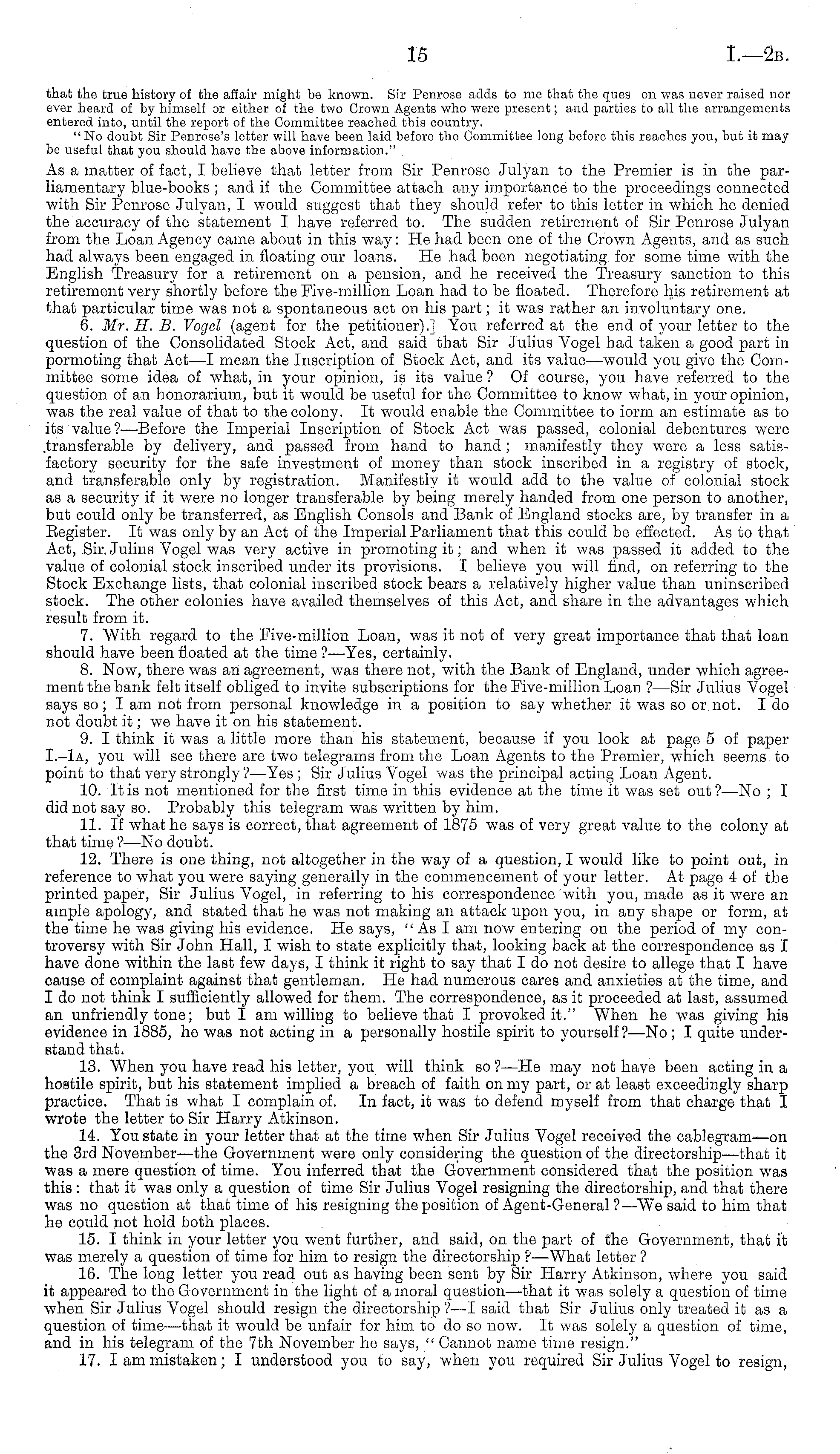 that the true history of the affair might be known. Sir Penrose adds to me that the ques on was never raised nor ever heard of by himself or either of the two Crown Agents who were present; and parties to all the arrangements entered into, until the report of the Committee reached this country. "No doubt Sir Penrose's letter will have been laid before the Committee long before this reaches you, but it may he useful that you should have the above information." As a matter of fact, I believe that letter from Sir Penrose Jtilyan to the Premier is in the parliamentary blue-books ; and if the Committee attach any importance to the proceedings connected with Sir Penrose Julyan, I would suggest that they should refer to this letter in which he denied the accuracy of the statement I have referred to. The sudden retirement of Sir Penrose Julyan from the Loan Agency came about in this way: He had been one of the Crown Agents, and as such had always been engaged in floating our loans. He had been negotiating for some time with the English Treasury for a retirement on a pension, and he received the Treasury sanction to this retirement very shortly before the Five-million Loan had to be floated. Therefore his retirement at that particular time was not a spontaneous act on his part; it was rather an involuntary one. 6. Mr.H.B. Vogel (agent for the petitioner).] You referred at the end of your letter to the question of the Consolidated Stock Act, and said that Sir Julius Vogel had taken a good part in pormoting that Act—l mean the Inscription of Stock Act, and its value—would you give the Committee some idea of what, in your opinion, is its value ? Of course, you have referred to the question of an honorarium, but it would be useful for the Committee to know what, in your opinion, was the real value of that to the colony. It would enable the Committee to iorm an estimate as to its value?— Before the Imperial Inscription of Stock Act was passed, colonial debentures were transferable by delivery, and passed from hand to hand; manifestly they were a less satisfactory security for the safe investment of money than stock inscribed in a registry of stock, and transferable only by registration. Manifestly it would add to the value of colonial stock as a security if it were no longer transferable by being merely handed from one person to another, but could only be transferred, as English Consols and Bank of England stocks are, by transfer in a Register. It was only by an Act of the Imperial Parliament that this could be effected. As to that Act, .Sir. Julius Vogel was very active in promoting it; and when it was passed it added to the value of colonial stock inscribed under its provisions. I believe you will find, on referring to the Stock Exchange lists, that colonial inscribed stock bears a relatively higher value than uninscribed stock. The other colonies have availed themselves of this Act, and share in the advantages which result from it. 7. With regard to the Five-million Loan, was it not of very great importance that that loan should have been floated at the time ? —Yes, certainly. 8. Now, there was an agreement, was there not, with the Bank of England, under which agreement the bank felt itself obliged to invite subscriptions for the Five-million Loan ? —Sir Julius Vogel says so; lam not from personal knowledge in a position to say whether it was so or not. Ido not doubt it; we have it on his statement. 9. I think it was a little more than his statement, because if you look at page 5 of paper I.—lα, you will see there are two telegrams from the Loan Agents to the Premier, which seems to point to that very strongly'?— Yes ; Sir Julius Vogel was the principal acting Loan Agent. 10. It is not mentioned for the first time in this evidence at the time it was set out?—No ; I did not say so. Probably this telegram was written by him. 11. If what he says is correct, that agreement of 1875 was of very great value to the colony at that time ?—No doubt. 12. There is one thing, not altogether in the way of a question, I would like to point out, in reference to what you were saying generally in the commencement of your letter. At page 4of the printed paper, Sir Julius Vogel, in referring to his correspondence with you, made as it were an ample apology, and stated that he was not making an attack upon you, in any shape or form, at the time he wa.s giving his evidence. He says, "Asl am now entering on the period of my controversy with Sir John Hall, I wish to state explicitly that, looking back at the correspondence as I have clone within the last few days, I think it right to say that I do not desire to allege that I have cause of complaint against that gentleman. He had numerous cares and anxieties at the time, and I do not think I sufficiently allowed for them. The correspondence, as it proceeded at last, assumed an unfriendly tone; but I am willing to believe that I provoked it." When he was giving his evidence in 1885, he was not acting in a personally hostile spirit to yourself?—No ; I quite understand that. 13. When you have read his letter, you will think so ?—He may not have been acting in a hostile spirit, but his statement implied a breach of faith on my part, or at least exceedingly sharp practice. That is what I complain of. In fact, it was to defend myself from that charge that I wrote the letter to Sir Harry Atkinson. 14. You state in your letter that at the time when Sir Julius Vogel received the cablegram—on the 3rd November —the Government were only considering the question of the directorship—that it was a mere question of time. You inferred that the Government considered that the position was this : that it was only a question of time Sir Julius Vogel resigning the directorship, and that there was no question at that time of his resigning the position of Agent-General ?—We said to him that he could not hold both places. 15. I think in your letter you went further, an