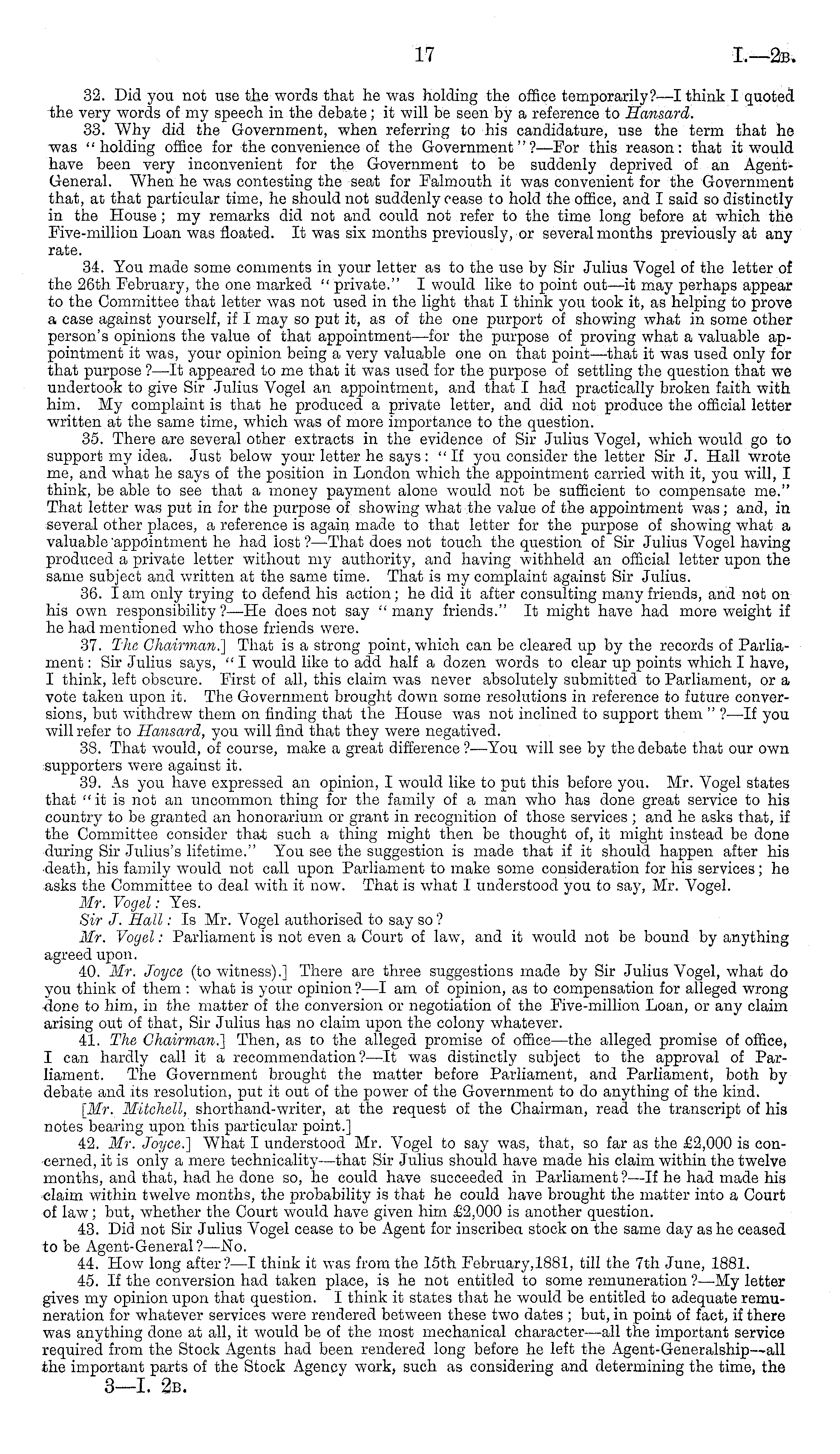 32. Did you not use the words that he was holding the office temporarily?—l think I quoted the very words of my speech in the debate; it will be seen by a reference to Hansard. 33. Why did the Government, when referring to his candidature, use the term that he •was "holding office for the convenience of the Government"?— For this reason: that it would have been very inconvenient for the Government to be suddenly deprived of an AgentGeneral. When he was contesting the seat for Falmouth it was convenient for the Government that, at that particular time, he should not suddenly pease to hold the office, and I said so distinctly in the House; my remarks did not and could not refer to the time long before at which the Five-million Loan was floated. It was six months previously, or several months previously at any rate. 34. You made some comments in your letter as to the use by Sir Julius Vogel of the letter of the 26th February, the one marked " private." I would like to point out—it may perhaps appear to the Committee that letter was not used in the light that I think you took it, as helping to prove a case against yourself, if I may so put it, as of the one purport of showing what in some other person's opinions the value of that appointment—for the purpose of proving what a valuable appointment it was, your opinion being a very valuable one on that point—that it was used only for that purpose ? —lt appeared to me that it was used for the purpose of settling the question that we undertook to give Sir Julius Vogel an appointment, and that I had practically broken faith with him. My complaint is that he produced a private letter, and did not produce the official letter written at the same time, which was of more importance to the question. 35. There are several other extracts in the evidence of Sir Julius Vogel, which would go to support my idea. Just below your letter he says: "If you consider the letter Sir J. Hall wrote me, and what he says of the position in London which the appointment carried with it, you will, I think, be able to see that a money payment alone would not be sufficient to compensate me." That letter was put in for the purpose of showing what the value of the appointment was; and, in several other places, a reference is again made to that letter for the purpose of showing what a valuable 'appointment he had lost ?—That does not touch the question of Sir Julius Vogel having produced a private letter without my authority, and having withheld an official letter upon the same subject and written at the same time. That is my complaint against Sir Julius. 36. lam only trying to defend his action; he did it after consulting many friends, and not on his own responsibility?—He does not say "many friends." It might have had more weight if he had mentioned who those friends were. 37. The Chairman.] That is a strong point, which can be cleared up by the records of Parliament : Sir Julius says, " I would like to add half a dozen words to clear up points which I have, I think, left obscure. First of all, this claim was never absolutely submitted to Parliament, or a vote taken upon it. The Government brought down some resolutions in reference to future conversions, but withdrew them on finding that the House was not inclined to support them " ?—lf you will refer to Hansard, you will find that they were negatived. 38. That would, of course, make a great difference ?—You will see by the debate that our own supporters were against it. 39. As you have expressed an opinion, I would like to put this before you. Mr. Vogel states that "it is not an uncommon thing for the family of a man who has done great service to his country to be granted an honorarium or grant in recognition of those services ; and he asks that, if the Committee consider that such a thing might then be thought of, it might instead be done during Sir Julius's lifetime." You see the suggestion is made that if it should happen after his death, his family would not call upon Parliament to make some consideration for his services; he asks the Committee to deal with it now. That is what I understood you to say, Mr. Vogel. Mr. Vogel: Yes. Sir J. Hall: Is Mr. Vogel authorised to say so ? Mr, Vogel: Parliament is not even a Court of law, and it would not be bound by anything agreed upon. 40. Mr. Joyce (to witness).] There are three suggestions made by Sir Julius Vogel, what do you think of them : what is your opinion ? —I am of opinion, as to compensation for alleged wrong done to him, in the matter of the conversion or negotiation of the Five-million Loan, or any claim arising out of that, Sir Julius has no claim upon the colony whatever. 41. The Chairman.] Then, as to the alleged promise of office—the alleged promise of office, I can hardly call it a recommendation?—lt was distinctly subject to the approval of Parliament. The Government brought the matter before Parliament, and Parliament, both by debate and its resolution, put it out of the power of the Government to do anything of the kind. [Mr. Mitchell, shorthand-writer, at the request of the Chairman, read the transcript of his notes bearing upon this particular point.] 42. Mr. Joyce.] What I understood Mr. Vogel to say was, that, so far as the £2,000 is concerned, it is only a mere technicality—that Sir Julius should have made his claim within the twelve months, and that, had he done so, he could have succeeded in Parliament?—lf he had made his claim within twelve months, the probability is that he could have brought the matter into a Court of law; but, whether the Court would have given him £2,000 is another question. 43. Did not Sir Julius Vogel cease to be Agent for inscribed stock on the same day as he ceased to be Agent-General?—No. 44. How long after? —I think it was from the loth February,lBBl, till the 7th June, 1881. 45. If the conversion had taken place, is he not entitled to some remuneration ?—My letter gives my opinion upon