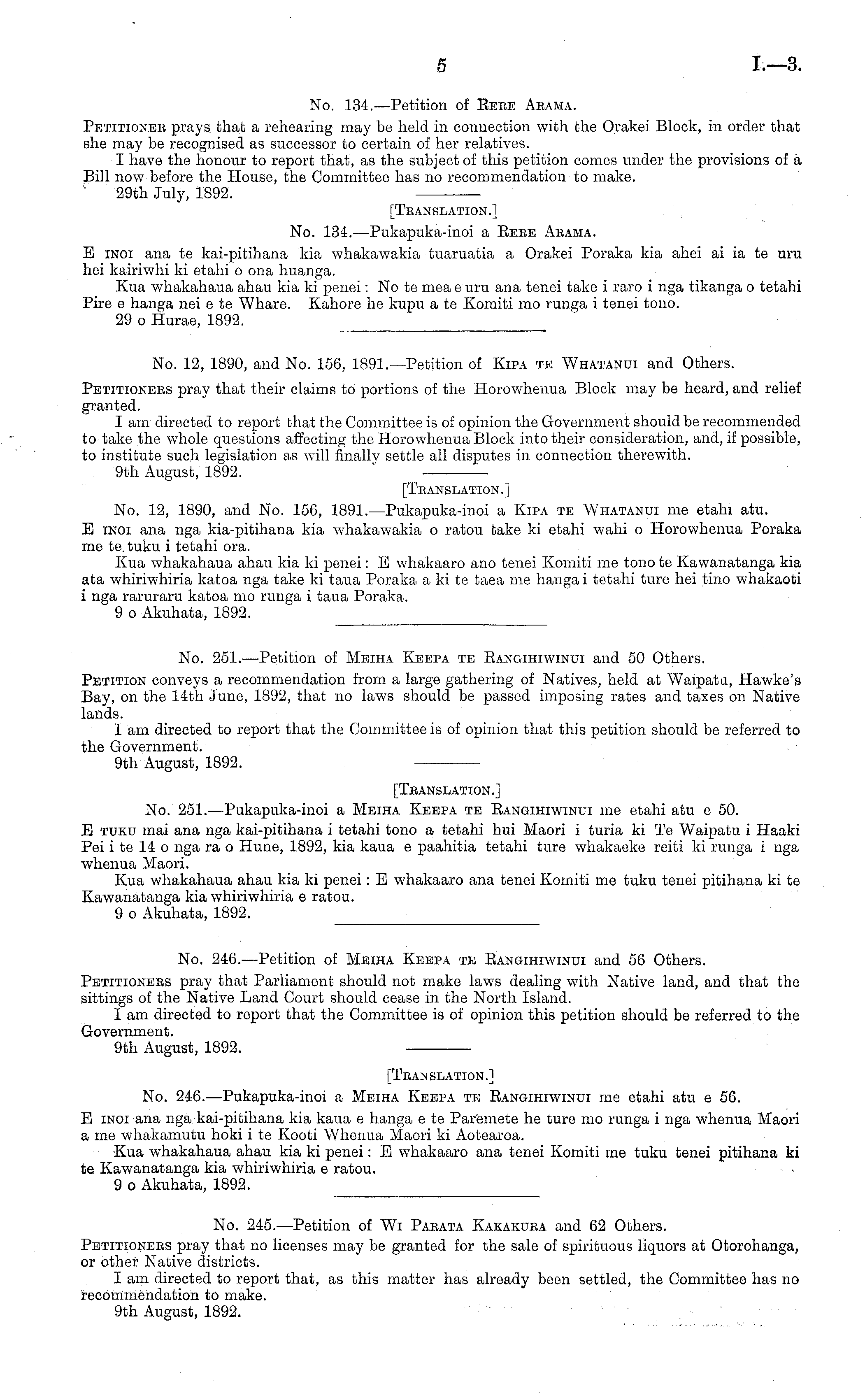 [Translation.] No. 246.—Pukapuka-inoi a Meiha Keepa te Eangihiwinui me etahi atu c 56. E inoi ana nga kai-pitihana kia kaua c hanga c te Paremete he ture mo runga i nga whenua Maori a me whakamutu hoki i te Kooti Whenua Maori ki Aotearoa. Kua whakahaua ahau kia ki penei: E whakaaro ana tenei Komiti me tuku tenei pitihana ki te Kawanatanga kia whiriwhiria c ratou. 9 o Akuhata, 1892. No. 245.—Petition of Wi Parata Kakakura and 62 Others. Petitioners pray that no licenses may be granted for the sale of spirituous liquors at Otorohanga, or other Native districts. I am directed to report that, as this matter has already been settled, the Committee has no recommendation to make. 9th August, 1892.