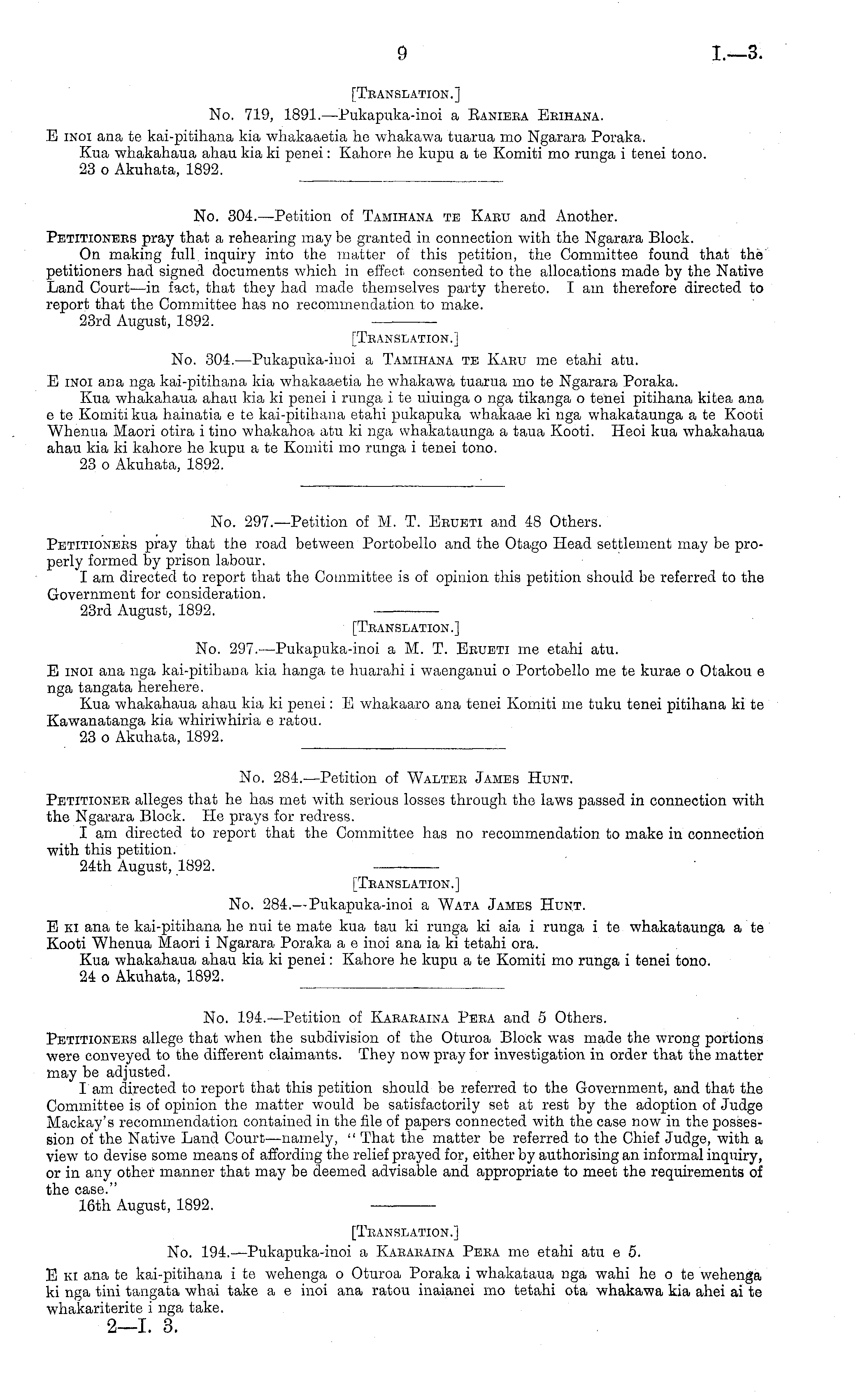 No. 304. —Pukapuka-inoi a Tamihana te Karu me etahi atu. E inoi ana nga kai-pitihana kia whakaaetia he whakawa tuarua mo te Ngarara Poraka. Kua whakahaua ahau kia ki penei i runga i te uiuinga o nga tikanga o tenei pitihana kitea ana c te Komiti kua hainatia c te kai-pitihana etahi pukapuka whakaae ki nga whakataunga a te Kooti Whenua Maori otira i tino whakahoa atu ki nga whakataunga a taua Kooti. Heoi kua whakahaua ahau kia ki kahore he kupu a te Komiti mo runga i tenei tono. 23 o Akuhata, 1892.