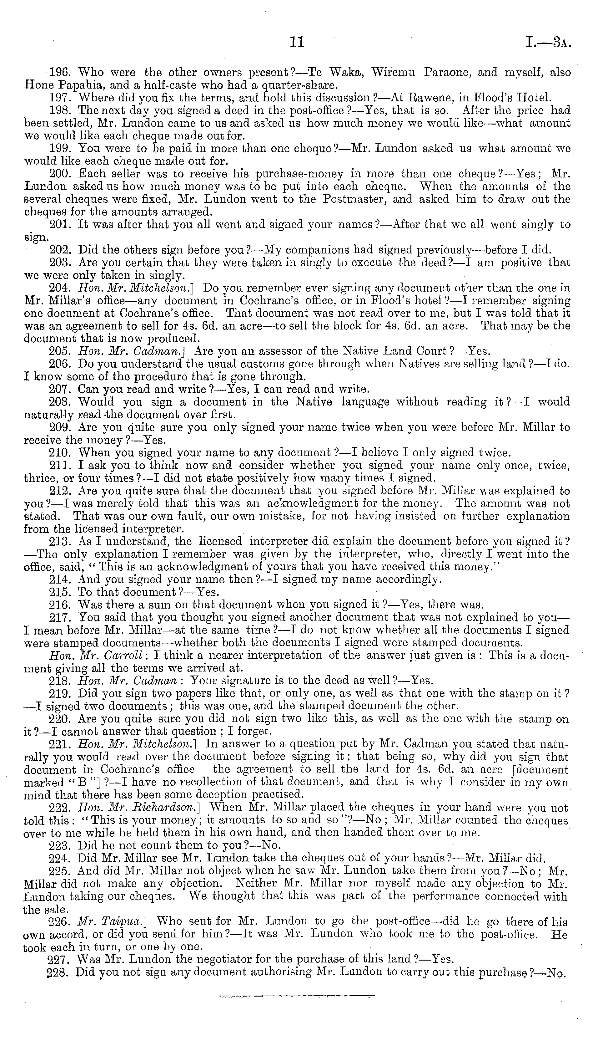 196. Who were the other owners present?—Te Waka, Wiremu Paraone, and myself, also Hone Papahia, and a half-caste who had a quarter-share. 197. Where did you fix the terms, and hold this discussion ? —At Eawene, in Flood's Hotel. 198. The next day you signed a deed in the post-office ?—Yes, that is so. After the price had been settled, Mr. Lundon came to us and asked us how much money we would like—what amount we would like each cheque made out for. 199. You were to be paid in more than one cheque?— Mr. Lundon asked us what amount we would like each cheque made out for. 200. Each seller was to receive his purchase-money in more than one cheque ?—Yes; Mr. Lundon asked us how much money was to be put into each cheque. When the amounts of the several cheques were fixed, Mr. Lundon went to the Postmaster, and asked him to draw out the cheques for the amounts arranged. 201. It was after that you all went and signed your names?— After that we all went singly to sign. 202. Did the others sign before you?—My companions had signed previously—before I did. 203. Are you certain that they were taken in singly to execute the deed?—l am positive that we were only taken in singly. 204. Hon. Mr. Mitchelson.] Do you remember ever signing any document other than the one in Mr. Millar's office —any document in Cochrane's office, or in Flood's hotel ? —I remember signing one document at Cochrane's office. That document was not read over to me, but I was told that it was an agreement to sell for 4s. 6d. an acre —to sell the block for 4s. 6d. an acre. That may be the document that is now produced. 205. Hon. Mr. Cadman.} Are you an assessor of the Native Land Court ?—Yes. 206. Do you understand the usual customs gone through when Natives are selling land ? —I do. I know some of the procedure that is gone through. 207. Can you read and write ?—-Yes, I can read and write. 208. Would you sign a document in the Native language without reading it ?—I would naturally read-the document over first. 209. Are you quite sure you only signed your name twice when you were before Mr. Millar to receive the money?— Yes. 210. When you signed your name to any document ?—I believe I only signed twice. 211. I ask you to think now and consider whether you signed your name only once, twice, thrice, or four times ?—I did not state positively how many times I signed. 212. Are you quite sure that the document that you signed before Mr. Millar was explained to you? —I was merely told that this was an acknowledgment for the money. The amount was not stated. That was our own fault, our own mistake, for not having insisted on further explanation from the licensed interpreter. 213. As I understand, the licensed interpreter did explain the document before you signed it ? —The only explanation I remember was given by the interpreter, who, directly I went into the office, said, " This is an acknowledgment of yours that you have received this money." 214. And you signed your name then ?—I signed my name accordingly. 215. To that document? —Yes. 216. Was there a sum on that document when you signed it ?—Yes, there was. 217. You said that you thought you signed another document that was not explained to you— I mean before Mr. Millar—at the same time ?—I do not know whether all the documents I signed were stamped documents—whether both the documents I signed were stamped documents. Hon. Mr. Carroll: I think a nearer interpretation of the answer just given is : This is a document giving all the terms we arrived at. 218. Hon. Mr. Gadman : Your signature is to the deed as well ?—Yes. 219. Did you sign two papers like that, or only one, as well as that one with the stamp on it ? ■ —I signed two documents; this was one, and the stamped document the other. 220. Are you quite sure you did not sign two like this, as well as the one with the stamp on it ? —I cannot answer that question ; I forget. 221. Hon. Mr. Mitchelson.] In answer to a question put by Mr. Cadman you stated that naturally you would read over the document before signing it; that being so, why did you sign that document in Cochrane's office — the agreement to sell the land for 4s. 6d. an acre [document marked "B "] ? —I have no recollection of that document, and that is why I consider in my own mind that there has been some deception practised. 222. Hon. Mr. Bichardson.] When Mr. Millar placed the cheques in your hand were you not told this: "This is your money; it amounts to so and so"?—No ; Mr. Millar counted the cheques over to me while he held them in his own hand, and then handed them over to me. 223. Did he not count them to you ?—No. 224. Did Mr. Millar see Mr. Lundon take the cheques out of your hands? —Mr. Millar did. 225. And did Mr. Millar not object when he saw Mr. Lundon take them from you?—No; Mr. Millar did not make any objection. Neither Mr. Millar nor myself made any objection to Mr. Lundon taking our cheques. We thought that this was part of the performance connected with the sale. 226. Mr. Taipua.] Who sent for Mr. Lundon to go the post-office—did he go there of his own accord, or did you send for him ?—lt was Mr. Lundon who took me to the post-office. He took each in turn, or one by one. 227. Was Mr. Lundon the negotiator for the purchase of this land ?—Yes. 228. Did you not sign any document authorising Mr. Lundon to carry out this purchase?—No,