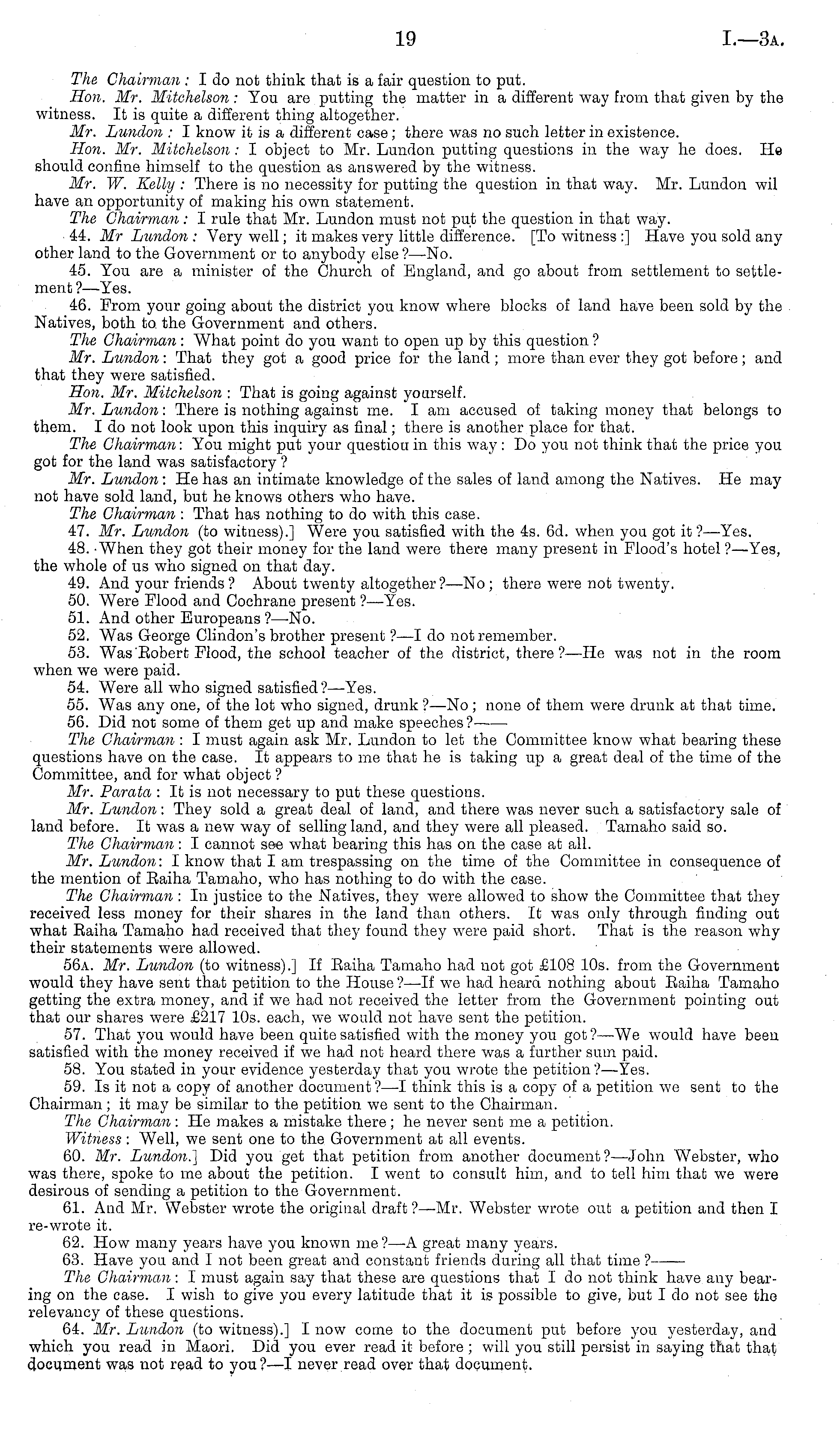 The Chairman : I do not think that is a fair question to put. Hon. Mr. Mitehelson: You are putting the matter in a different way from that given by the witness. It is quite a different thing altogether. Mr. Licndon : I know it is a different case; there was no such letter in existence. Hon. Mr. Mitehelson: I object to Mr. Lundon putting questions in the way he does. He should confine himself to the question as answered by the witness. Mr. W. Kelly : There is no necessity for putting the question in that way. Mr. Lundon wil have an opportunity of making his own statement. The Chairman: I rule that Mr. Lundon must not put the question in that way. 44. Mr Licndon : Very well; it makes very little difference. [To witness :] Have you sold any other land to the Government or to anybody else ?—No. 45. You are a minister of the Church of England, and go about from settlement to settlement ?—Yes. 46. From your going about the district you know where blocks of land have been sold by the Natives, both to. the Government and others. The Chairman : What point do you want to open up by this question ? Mr. Lundon : That they got a good price for the land; more than ever they got before; and that they were satisfied. Hon. Mr. Mitehelson : That is going against yourself. Mr. Lundon: There is nothing against me. I am accused of taking money that belongs to them. Ido not look upon this inquiry as final; there is another place for that. The Chairman : You might put your questiou in this way :Do you not think that the price you got for the land was satisfactory ? Mr. Lundon : He has an intimate knowledge of the sales of land among the Natives. He may not have sold land, but he knows others who have. The Chairman : That has nothing to do with this case. 47. Mr. Lundon (to witness).] Were you satisfied with the 4s. 6d. when you got it ?—Yes. 48. -When they got their money for the land were there many present in Flood's hotel ?—Yes, the whole of us who signed on that day. 49. And your friends? About twenty altogether?—No; there were not twenty. 50. Were Flood and Cochrane present ?—Yes. 51. And other Europeans ?—No. 52. Was George Clindon's brother present ? —I do not remember. 53. Was Eobert Flood, the school teacher of the district, there ?—He was not in the room when we were paid. 54. Were all who signed satisfied?— Yes. 55. Was any one, of the lot who signed, drunk ? —No ; none of them were drunk at that time. 56. Did not some of them get up and make speeches? The Chairman : I must again ask Mr. Lundon to let the Committee know what bearing these questions have on the case. It appears to me that he is taking up a great deal of the time of the Committee, and for what object ? Mr. Parata : It is not necessary to put these questions. Mr. Lundon: They sold a great deal of land, and there was never such a satisfactory sale of land before. It was a new way of selling land, and they were all pleased. Tamaho said so. The Chairman: I cannot see what bearing this has on the case at all. Mr. Lundon: I know that I am trespassing on the time of the Committee in consequence of the mention of Baiha Tamaho, who has nothing to do with the case. The Chairman : In justice to the Natives, they were allowed to show the Committee that they received less money for their shares in the land than others. It was only through finding out what Baiha Tamaho had received that they found they were paid short. That is the reason why their statements were allowed. 56a. Mr. Lundon (to witness).] If Eaiha Tamaho had not got £108 10s. from the Government would they have sent that petition to the House ?—lf we had heard nothing about Eaiha Tamaho getting the extra money, and if we had not received the letter from the Government pointing out that our shares were £217 10s. each, we would not have sent the petition. 57. That you would have been quite satisfied with the money you got? —We would have been satisfied with the money received if we had not heard there was a further sum paid. 58. You stated in your evidence yesterday that you wrote the petition?— Yes. 59. Is it not a copy of another document ?—I think this is a copy of a petition we sent to the Chairman; it may be similar to the petition we sent to the Chairman. The Chairman : He makes a mistake there; he never sent me a petition. Witness : Well, we sent one to the Government at all events. 60. Mr. Lundon.] Did you get that petition from another document ?—John Webster, who was there, spoke to me about the petition. I went to consult him, and to tell him that we were desirous of sending a petition to the Government. 61. And Mr. Webster wrote the original draft? —Mr. Webster wrote out a petition and then I re-wrote it. 62. How many years have you known me? —A great many years. 63. Have you and I not been great and constant friends during all that time ? The Chairman : I must again say that these are questions that I do not think have any bearing on the case. I wish to give you every latitude that it is possible to give, but Ido not see the relevancy of these questions. 64. Mr. Lundon (to witness).] I now come to the document put before you yesterday, and which you read in Maori. Did you ever read it before ; will you still persist in saying that that document was not read to you?—l never read over that document.