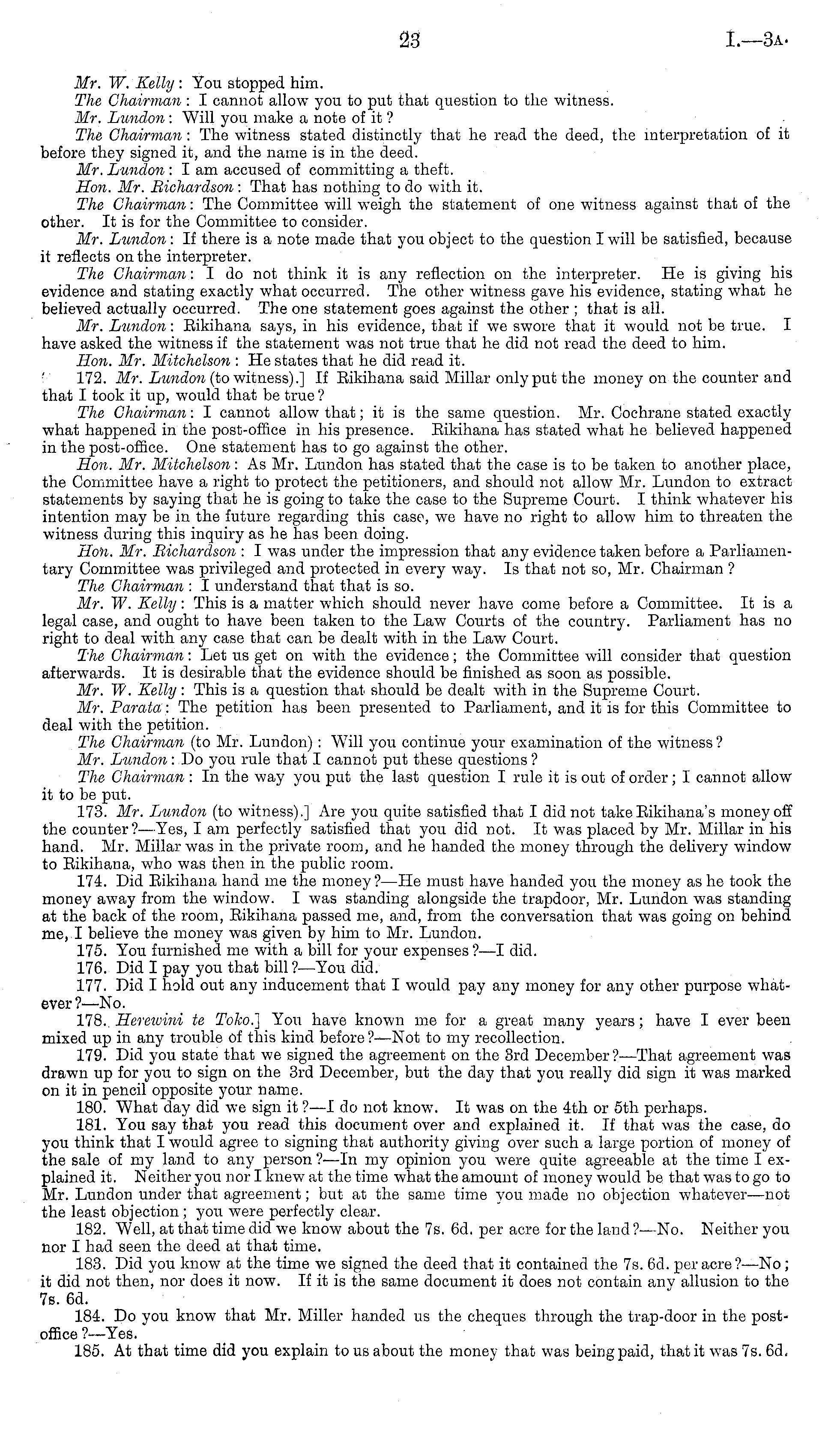 Mr. W. Kelly : You stopped him. The Chairman : I cannot allow you to put that question to the witness. Mr. Lundon: Will you make a note of it ? The Chairman : The witness stated distinctly that he read the deed, the interpretation of it before they signed it, and the name is in the deed. Mr. Lundon : I am accused of committing a theft. Hon. Mr. Richardson: That has nothing to do with it. The Chairman: The Committee will weigh the statement of one witness against that of the other. It is for the Committee to consider. Mr. Lundon : If there is a note made that you object to the question I will be satisfied, because it reflects on the interpreter. The Chairman: I do not think it is any reflection on the interpreter. He is giving his evidence and stating exactly what occurred. The other witness gave his evidence, stating what he believed actually occurred. The one statement goes against the other ; that is all. Mr. Lundon : Eikihana says, in his evidence, that if we swore that it would not be true. I have asked the witness if the statement was not true that he did not read the deed to him. Hon. Mr. Mitchelson : He states that he did read it. 172. Mr. Lundon (to witness).] If Eikihana said Millar only put the money on the counter and that I took it up, would that be true ? The Chairman : I cannot allow that; it is the same question. Mr. Cochrane stated exactly what happened in the post-office in his presence. Eikihana has stated what he believed happened in the post-office. One statement has to go against the other. Hon. Mr. Mitchelson : As Mr. Lundon has stated that the case is to be taken to another place, the Committee have a right to protect the petitioners, and should not allow Mr. Lundon to extract statements by saying that he is going to take the case to the Supreme Court. I think whatever his intention may be in the future regarding this case, we have no right to allow him to threaten the witness during this inquiry as he has been doing. Hon. Mr. Bichardson : I was under the impression that any evidence taken before a Parliamentary Committee was privileged and protected in every way. Is that not so, Mr. Chairman ? The Chairman : I understand that that is so. Mr. W. Kelly : This is a matter which should never have come before a Committee. It is a legal case, and ought to have been taken to the Law Courts of the country. Parliament has no right to deal with any case that can be dealt with in the Law Court. The Chairman: Let us get on with the evidence; the Committee will consider that question afterwards. It is desirable that the evidence should be finished as soon as possible. Mr. W. Kelly : This is a question that should be dealt with in the Supreme Court. Mr, Parata : The petition has been presented to Parliament, and it is for this Committee to deal with the petition. The Chairman (to Mr. Lundon) : Will you continue your examination of the witness ? Mr. Lundon: Do you rule that I cannot put these questions ? The Chairman :In the way you put the last question I rule it is out of order; I cannot allow it to be put. 173. Mr. Lundon (to witness).] Are you quite satisfied that I did not take Bikihana's money off the counter?— Yes, lam perfectly satisfied that you did not. It was placed by Mr. Millar in his hand. Mr. Millar was in the private room, and he handed the money through the delivery window to Eikihana, who was then in the public room. 174. Did Eikihana hand me the money?—He must have handed you the money as he took the money away from the window. I was standing alongside the trapdoor, Mr. Lundon was standing at the back of the room, Eikihana passed me, and, from the conversation that was going on behind me, I believe the money was given by him to Mr. Lundon. 175. You furnished me with a bill for your expenses ?—I did. 176. Did I pay you that bill ?—You did. 177. Did I hold out any inducement that I would pay any money for any other purpose whatever?— No. 178.. Herewini te Toko.] You have known me for a great many years; have I ever been mixed up in any trouble of this kind before ?—Not to my recollection. 179. Did you state that we signed the agreement on the 3rd December?— That agreement was drawn up for you to sign on the 3rd December, but the day that you really did sign it was marked on it in pencil opposite your name. 180. What day did we sign it ?—I do not know. It was on the 4th or sth perhaps. 181. You say that you read this document over and explained it. If that was the case, do you think that I would agree to signing that authority giving over such a large portion of money of the sale of my land to any person ?—ln my opinion you were quite agreeable at the time I explained it. Neither you nor I knew at the time what the amount of money would be that was to go to Mr. Lundon under that agreement; but at the same time you made no objection whatever —not the least objection; you were perfectly clear. 182. Well, at that time did we know about the 7s. 6d. per acre for the laud ?—No. Neither you nor I had seen the deed at that time. 183. Did you know at the time we signed the deed that it contained the 7s. 6d. per acre ?—No; it did not then, nor does it now. If it is the same document it does not contain any allusion to the 7s. 6d. 184. Do you know that Mr. Miller handed us the cheques through the trap-door in the postoffice ?—Yes. 185. At that time did you explain to us about the money that was being paid, that it was 7s. 6d,