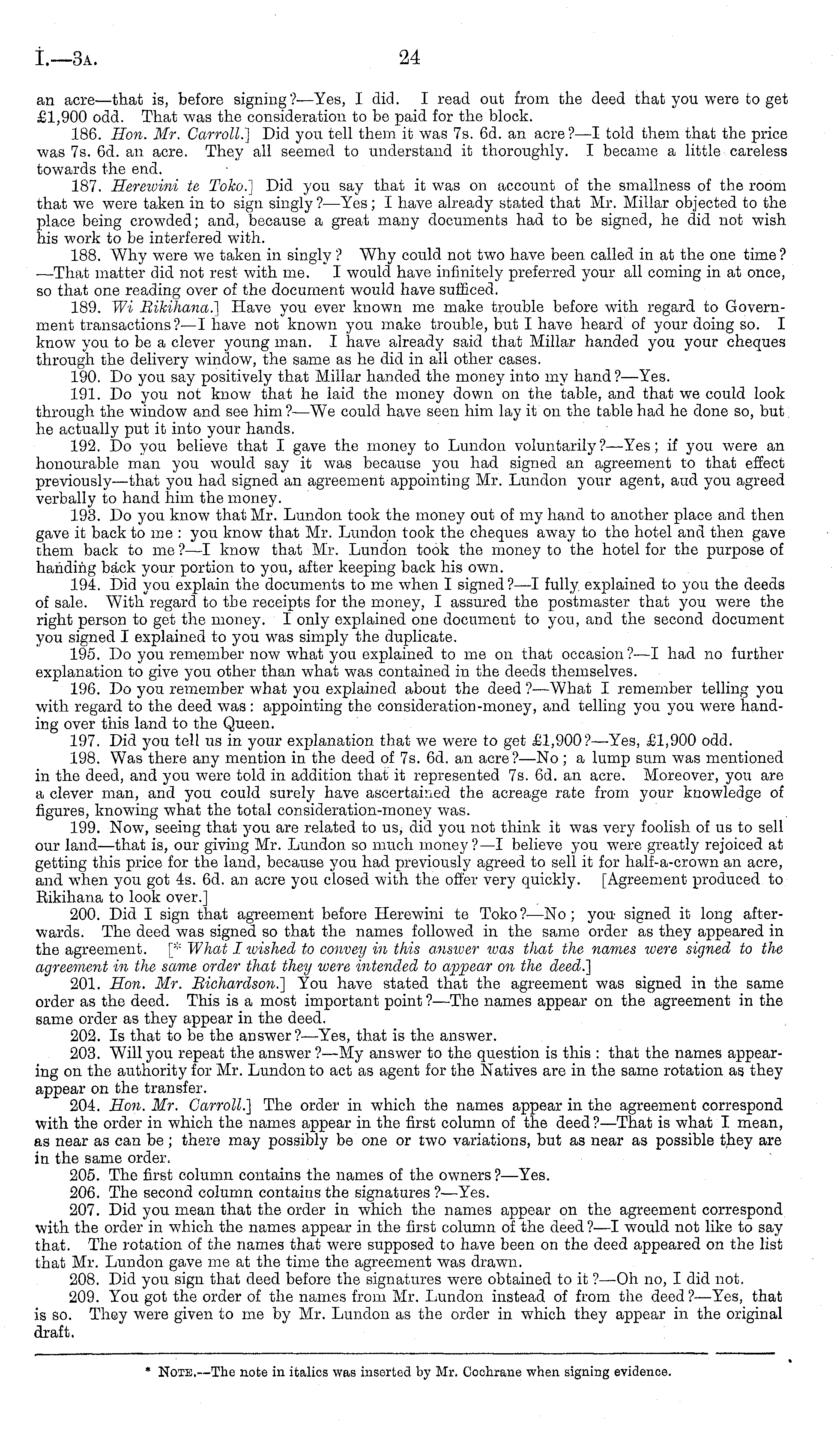 an acre—that is, before signing?— Yes, I did. I read out from the deed that you were to get £1,900 odd. That was the consideration to be paid for the block. 186. Hon. Mr. Carroll.} Did you tell them it was 7s. 6d. an acre?—l told them that the price was 7s. 6d. an acre. They all seemed to understand it thoroughly. I became a little careless towards the end. 187. Hereioini te Toko.] Did you say that it was on account of the smallness of the room that we were taken in to sign singly ?—Yes; I have already stated that Mr. Millar objected to the place being crowded; and, because a great many documents had to be signed, he did not wish his work to be interfered with. 188. Why were we taken in singly ? Why could not two have been called in at the one time? —That matter did not rest with me. I would have infinitely preferred your all coming in at once, so that one reading over of the document would have sufficed. 189. Wi Bikihana.] Have you ever known me make trouble before with regard to Government transactions?—l have not known you make trouble, but I have heard of your doing so. I know you to be a clever young man. I have already said that Millar handed you your cheques through the delivery window, the same as he did in all other cases. 190. Do you say positively that Millar handed the money into my hand ?—Yes. 191. Do you not know that he laid the money down on the table, and that we could look through the window and see him ?—We could have seen him lay it on the table had he done so, but he actually put it into your hands. 192. Do you believe that I gave the money to Lundou voluntarily?— Yes; if you were an honourable man you would say it was because you had signed an agreement to that effect previously—that you had signed an agreement appointing Mr. Lundon your agent, aud you agreed verbally to hand him the money. 193. Do you know that Mr. Lundon took the money out of my hand to another place and then gave it back to me : you know that Mr. Lundon took the cheques away to the hotel and then gave them back to me ?—I know that Mr. Lundon took the money to the hotel for the purpose of handing back your portion to you, after keeping back his own. 194. Did you explain the documents to me when I signed ?—I fully explained to you the deeds of sale. With regard to the receipts for the money, I assured the postmaster that you were the right person to get the money. I only explained one document to you, and the second document you signed I explained to you was simply the duplicate. 195. Do you remember now what you explained to me on that occasion? —I had no further explanation to give you other than what was contained in the deeds themselves. 196. Do you remember what you explained about the deed ? —What I remember telling you with regard to the deed was : appointing the consideration-money, and telling you you were handing over this land to the Queen. 197. Did you tell us in your explanation that we were to get £1,900? —-Yes, £1,900 odd. 198. Was there any mention in the deed of 7s. 6d. an acre?—No; a lump sum was mentioned in the deed, and you were told in addition that it represented 7s. 6d. an acre. Moreover, you are a clever man, and you could surely have ascertained the acreage rate from your knowledge of figures, knowing what the total consideration-money was. 199. Now, seeing that you are related to us, did you not think it was very foolish of us to sell our land—that is, our giving Mr. Lundon so much money?—l believe you were greatly rejoiced at getting this price for the land, because you had previously agreed to sell it for half-a-crown an acre, and when you got 4s. 6d. an acre you closed with the offer very quickly. [Agreement produced to Eikihana to look over.] 200. Did I sign that agreement before Herewini te Toko?—No; you signed it long afterwards. The deed was signed so that the names followed in the same order as they appeared in the agreement. [* What I wished to convey in this answer was that the names were signed to the agreement in the same order that they were intended to appear on the deed.] 201. Hon. Mr. Bichardson.] You have stated that the agreement was signed in the same order as the deed. This is a most important point ?—The names appear on the agreement in the same order as they appear in the deed. 202. Is that to be the answer?— Yes, that is the answer. 203. Will you repeat the answer ?—My answer to the question is this : that the names appearing on the authority for Mr. Lundon to act as agent for the Natives are in the same rotation as they appear on the transfer. 204. Hon. Mr. Carroll.] The order in which the names appear in the agreement correspond with the order in which the names appear in the first column of the deed?— That is what I mean, as near as can be; there may possibly be one or two variations, but as near as possible they are in the same order. 205. The first column contains the names of the owners ?—Yes. 206. The second column contains the signatures ?—Yes. 207. Did you mean that the order in which the names appear on the agreement correspond with the order in which the names appear in the first column of the deed ? —I would not like to say that. The rotation of the names that were supposed to have been on the deed appeared on the list that Mr. Lundon gave me at the time the agreement was drawn. 208. Did you sign that deed before the signatures were obtained to it ?—Oh no, I did not. 209. You got the order of the names from Mr. Lundon instead of from the deed ? —Yes, that is so. They were given to me by Mr. Lundon as the order in which they appear in the original draft.