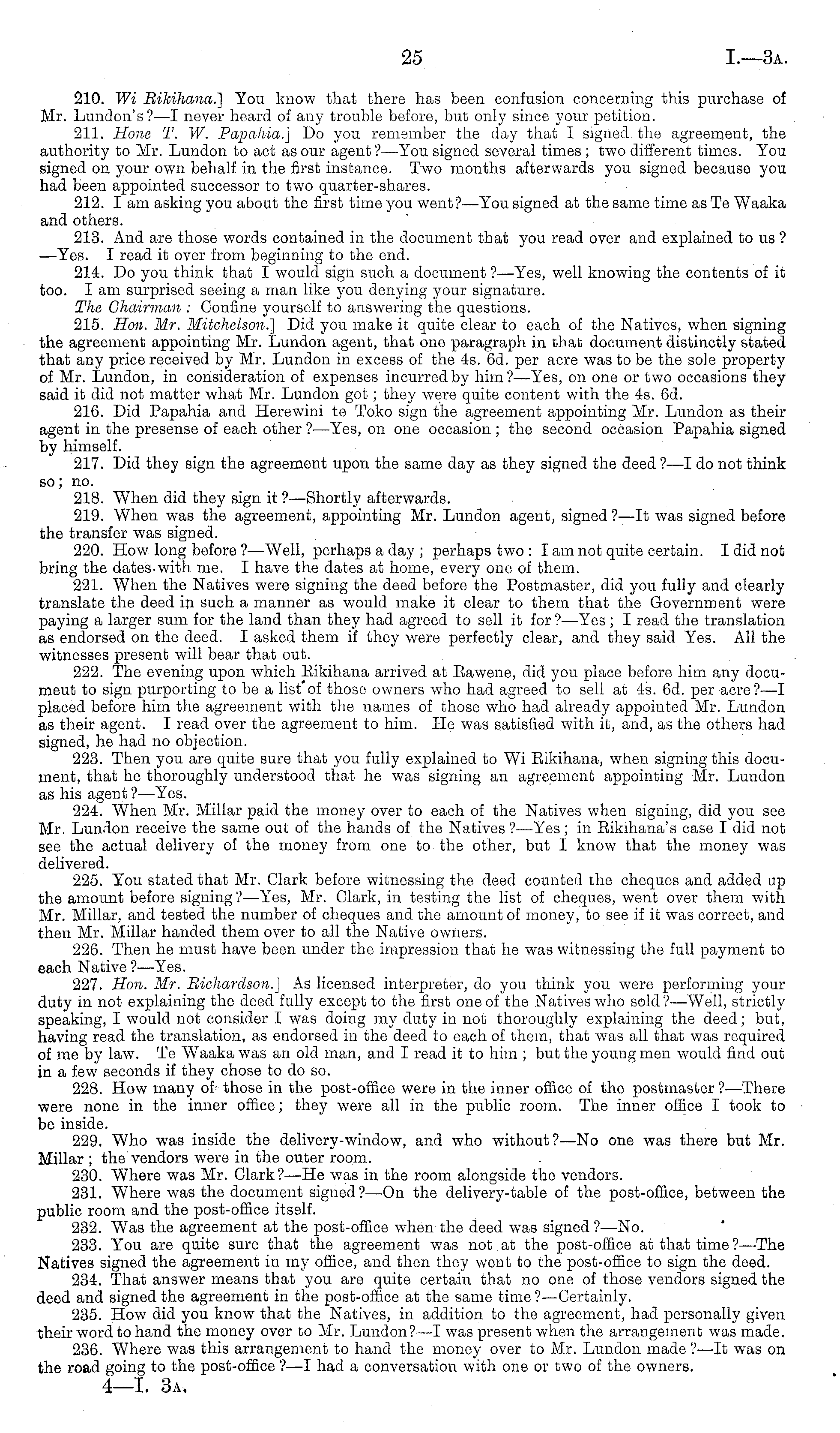 210. Wi Bihihana.] You know that there has been confusion concerning this purchase of Mr. Lundon's?—l never heard of any trouble before, but only since your petition. 211. Hone T. W. Papaida.] Do you remember the day that I signed the agreement, the authority to Mr. Lundon to act as our agent?— You signed several times; two different times. You signed on your own behalf in the first instance. Two months afterwards you signed because you had been appointed successor to two quarter-shares. 212. I am asking you about the first time you went? —You signed at the same time as Te Waaka and others. 213. And are those words contained in the document that you read over and explained to us ? —Yes. I read it over from beginning to the end. 214. Do you think that I would sign such a document ?—Yes, well knowing the contents of it too. lam surprised seeing a man like you denying your signature. The Chairman : Confine yourself to answering the questions. 215. Hon. Mr. Mitchelson.] Did you make it quite clear to each of the Natives, when signing the agreement appointing Mr. Lundon agent, that one paragraph in that document distinctly stated that any price received by Mr. Lundon in excess of the 4s. 6d. per acre was to be the sole property of Mr. Lundon, in consideration of expenses incurred by him ?—Yes, on one or two occasions they said it did not matter what Mr. Lundon got; they were quite content with the 4s. 6d. 216. Did Papahia and Herewini te Toko sign the agreement appointing Mr. Lundon as their agent in the presense of each other ? —Yes, on one occasion ; the second occasion Papahia signed by himself. 217. Did they sign the agreement upon the same day as they signed the deed ?—I do not think so; no. 218. When did they sign it ?—Shortly afterwards. 219. When was the agreement, appointing Mr. Lundon agent, signed ?—lt was signed before the transfer was signed. 220. How long before ? —Well, perhaps a day ; perhaps two :I am not quite certain. I did not bring the dates-with me. I have the dates at home, every one of them. 221. When the Natives were signing the deed before the Postmaster, did you fully and clearly translate the deed in such a manner as would make it clear to them that the Government were paying a larger sum for the land than they had agreed to sell it for ? —Yes ; I read the translation as endorsed on the deed. I asked them if they were perfectly clear, and they said Yes. All the witnesses present will bear that out. 222. The evening upon which Eikihana arrived at Eawene, did you place before him any documeut to sign purporting to be a list of those owners who had agreed to sell at 4s. 6d. per acre ?—I placed before him the agreement with the names of those who had already appointed Mr. Lundon as their agent. I read over the agreement to him. He was satisfied with it, and, as the others had signed, he had no objection. 223. Then you are quite sure that you fully explained to Wi Eikihana, when signing this document, that he thoroughly understood that he was signing an agreement appointing Mr. Lundon as his agent ?—Yes. 224. When Mr. Millar paid the money over to each of the Natives when signing, did you see Mr. Lundon receive the same out of the hands of the Natives ?—Yes ; in Bikihana's case I did not see the actual delivery of the money from one to the other, but I know that the money was delivered. 225. You stated that Mr. Clark before witnessing the deed counted the cheques and added up the amount before signing?—Y'es, Mr. Clark, in testing the list of cheques, went over them with Mr. Millar, and tested the number of cheques and the amount of money, to see if it was correct, and then Mr. Millar handed them over to all the Native owners. 226. Then he must have been under the impression that he was witnessing the full payment to each Native? —Yes. 227. Hon. Mr. Richardson."] As licensed interpreter, do you think you were performing your duty in not explaining the deed fully except to the first one of the Natives who sold ?—Well, strictly speaking, I would not consider I was doing my duty in not thoroughly explaining the deed; but, having read the translation, as endorsed in the deed to each of them, that was all that was required of me by law 7 . Te Waaka was an old man, and I read it to him ; but the young men would find out in a few seconds if they chose to do so. 228. How many of those in the post-office were in the inner office of the postmaster ?—There were none in the inner office; they were all in the public room. The inner office I took to be inside. 229. Who was inside the delivery-window, and who without?—No one was there but Mr. Millar ; the vendors were in the outer room. 230. Where was Mr. Clark?—He was in the room alongside the vendors. 231. Where was the document signed?—On the delivery-table of the post-office, between the public room and the post-office itsslf. 232. Was the agreement at the post-office when the deed was signed?— No. 233. You are quite sure that the agreement was not at the post-office at that time?— The Natives signed the agreement in my office, and then they went to the post-office to sign the deed. 234. That answer means that you are quite certain that no one of those vendors signed the deed and signed the agreement in the post-office at the same time ?—Certainly. 235. How did you know that the Natives, in addition to the agreement, had personally given their word to hand the money over to Mr. Lundon? —I was present when the arrangement was made. 236. Where was this arrangement to hand the money over to Mr. Lundon made ?—lt was on the road going to the post-office ? —I had a conversation with one or two of the owners. 4—l. 3a.