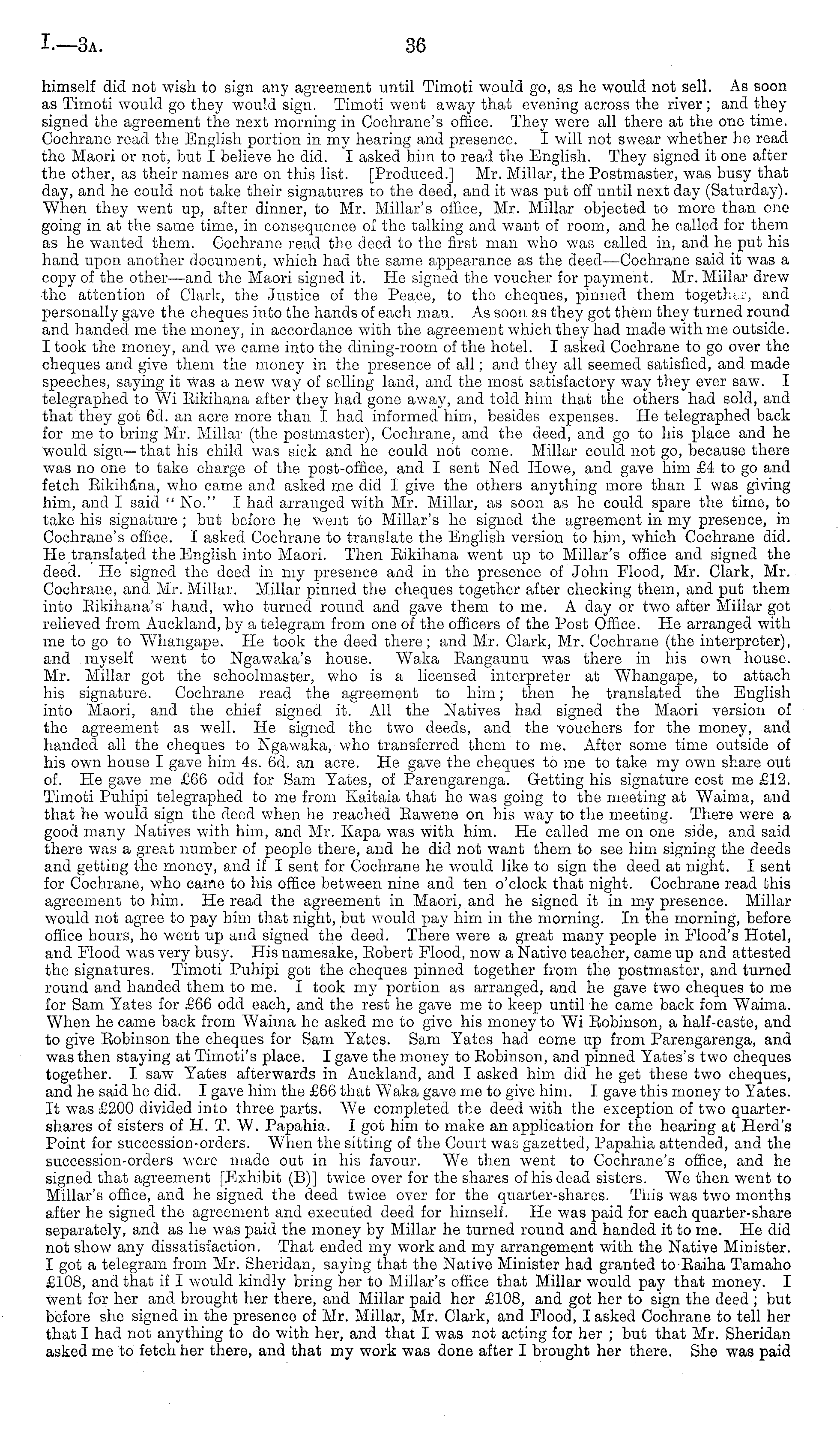 himself did not wish to sign any agreement until Timoti would go, as he would not sell. As soon as Timoti would go they would sign. Timoti went away that evening across the river ; and they signed the agreement the next morning in Cochrane's office. They were all there at the one time. Cochrane read the English portion in my hearing and presence. I will not swear whether he read the Maori or not, but I believe he did. I asked him to read the English. They signed it one after the other, as their names are on this list. [Produced.] Mr. Millar, the Postmaster, was busy that day, and he could not take their signatures to the deed, and it was put off until next day (Saturday). "When they went up, after dinner, to Mr. Millar's office, Mr. Millar objected to more than one going in at the same time, in consequence of the talking and want of room, and he called for them as he wanted them. Cochrane read the deed to the first man who was called in, and he put his hand upon another document, which had the same appearance as the deed— Cochrane said it was a copy of the other—and the Maori signed it. He signed the voucher for payment. Mr. Millar drew the attention of Clark, the Justice of the Peace, to the cheques, pinned them together, and personally gave the cheques into the hands of each man. As soon as they got them they turned round and handed me the money, in accordance with the agreement which they had made with me outside. I took the money, and we came into the dining-room of the hotel. I asked Cochrane to go over the cheques and give them the money in the presence of all; and they all seemed satisfied, and made speeches, saying it was a new way of selling land, and the most satisfactory way they ever saw. I telegraphed to Wi Bikihaua after they had gone away, and told him that the others had sold, and that they got 6d. an acre more than I had informed him, besides expenses. He telegraphed back for me to bring Mr. Millar (the postmaster), Cochrane, and the deed, and go to his place and he would sign—that his child was sick and he could not come. Millar could not go, because there was no one to take charge of the post-office, and I sent Ned Howe, and gave him £4 to go and fetch Eikihana, who came and asked me did I give the others anything more than I was giving him, and I said " No." I had arranged with Mr. Millar, as soon as he could spare the time, to take his signature ; but before he went to Millar's he signed the agreement in my presence, in Cochrane's office. I asked Cochrane to translate the English version to him, which Cochrane did. He translated the English into Maori. Then Eikihana went up to Millar's office and signed the deed. He signed the deed in my presence and in the presence of John Flood, Mr. Clark, Mr. Cochrane, and Mr. Millar. Millar pinned the cheques together after checking them, and put them into Bikihana's hand, who turned round and gave them to me. A day or two after Millar got relieved from Auckland, by a telegram from one of the officers of the Post Office. He arranged with me to go to Whangape. He took the deed there; and Mr. Clark, Mr. Cochrane (the interpreter), and myself went to Ngawaka's house. Waka Eangaunu was there in his own house. Mr. Millar got the schoolmaster, who is a licensed interpreter at Whangape, to attach his signature. Cochrane read the agreement to him; then he translated the English into Maori, and the chief signed it. All the Natives had signed the Maori version of the agreement as well. He signed the two deeds, and the vouchers for the money, and handed, all the cheques to Ngawaka, who transferred them to me. After some time outside of his own house I gave him 4s. 6d. an acre. He gave the cheques to me to take my own share out of. He gave me £66 odd for Sam Tates, of Parengarenga. Getting his signature cost me £12. Timoti Puhipi telegraphed to me from Kaitaia that he was going to the meeting at Waima, and that he would sign the deed when he reached Eawene on his way to the meeting. There were a good many Natives with him, and Mr. Kapa was with him. He called me on one side, and said there was a great number of people there, and he did not want them to see him signing the deeds and getting the money, and if I sent for Cochrane he would like to sign the deed at night. I sent for Cochrane, who came to his office between nine and ten o'clock that night. Cochrane read this agreement to him. He read the agreement in Maori, and he signed it in my presence. Millar would not agree to pay him that night, but would pay him in the morning. In the morning, before office hours, he went up and signed the deed. There were a great many people in Flood's Hotel, and Flood was very busy. His namesake, Eobert Flood, now a Native teacher, came up and attested the signatures. Timoti Puhipi got the cheques pinned together from the postmaster, and turned round and handed them to me. I took my portion as arranged, and he gave two cheques to me for Sam Tates for £66 odd each, and the rest he gave me to keep until he came back fom Waima. When he came back from Waima he asked me to give his money to Wi Eobinson, a half-caste, and to give Eobinson the cheques for Sam Yates. Sam Yates had come up from Parengarenga, and was then staying at Timoti's place. I gave the money to Eobinson, and pinned Yates's two cheques together. I saw Yates afterwards in Auckland, and I asked him did he get these two cheques, and he said he did. I gave him the £66 that Waka gave me to give him. I gave this money to Yates. It was £200 divided into three parts. We completed the deed with the exception of two quartershares of sisters of H. T. W. Papahia. I got him to make an application for the hearing at Herd's Point for succession-orders. When the sitting of the Court was gazetted, Papahia attended, and the succession-orders were made out in his favour. We then went to Cochrane's office, and he signed that agreement [Exhibit (B)] twice over for the shares of his dead sisters. We th