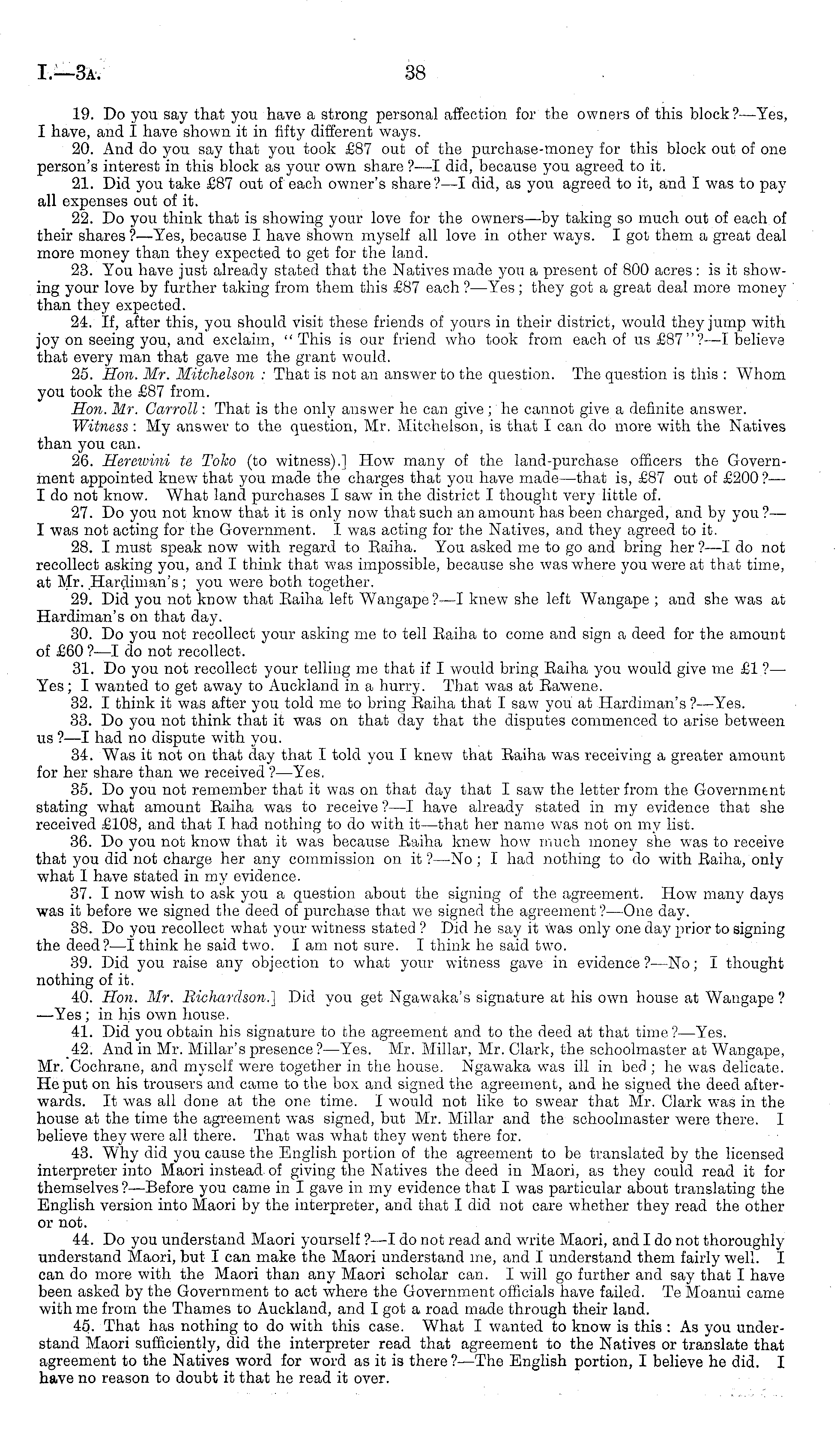 19. Do you say that you have a strong personal affection for the owners of this block? —Yes, I have, and I have shown it in fifty different ways. 20. And do you say that you took £87 out of the purchase-money for this block out of one person's interest in this block as your own share ?—I did, because you agreed to it. 21. Did you take £87 out of each owner's share? —I did, as you agreed to it, and I was to pay all expenses out of it. 22. Do you think that is showing your love for the owners —by taking so much out of each of their shares ?—Yes, because I have shown myself all love in other ways. I got them a great deal more money than they expected to get for the land. 23. You have just already stated that the Natives made you a present of 800 acres : is it showing your love by further taking from them this £87 each ? —Yes ; they got a great deal more money than they expected. 24. If, after this, you should visit these friends of yours in their district, would they jump with joy on seeing you, and exclaim, " This is our friend who took from each of us £87"? —I believe that every man that gave me the grant would. 25. Hon. Mr. Mitchelson : That is not an answer to the question. The question is this : Whom you took the £87 from. Hon. Mr. Carroll: That is the only answer he can give ;he cannot give a definite answer. Witness : My answer to the question, Mr. Mitchelson, is that I can do more with the Natives than you can. 26. Herewini te Tolw (to witness).] How many of the land-purchase officers the Government appointed knew that you made the charges that you have made—that is, £87 out of £200?— Ido not know. What land purchases I saw in the district I thought very little of. 27. Do you not know that it is only now that such an amount has been charged, and by you ? — I was not acting for the Government. I was acting for the Natives, and they agreed to it. 28. I must speak now with regard to Eaiha. You asked me to go and bring her ? —I do not recollect asking you, and I think that was impossible, because she was where you were at that time, at Mr. .Hardiman's; you were both together. 29. Did you not know that Eaiha left Wangape ?—I knew she left Wangape ; and she was at Hardiman's on that day. 30. Do you not recollect your asking me to tell Eaiha to come and sign a deed for the amount of £60 ?—I do not recollect. 31. Do you not recollect your telling me that if I would bring Eaiha you would give me £1 ? — Yes; I wanted to get away to Auckland in a hurry. That was at Eawene. 32. I think it was after you told me to bring Eaiha that I saw you at Hardiman's? —Yes. 33. Do you not think that it was on that day that the disputes commenced to arise between us ?—I had no dispute with you. 34. Was it not on that day that I told you I knew that Eaiha was receiving a greater amount for her share than we received ?—Yes. 35. Do you not remember that it was on that day that I saw the letter from the Government stating what amount Eaiha was to receive ? —I have already stated in my evidence that she received £108, and that I had nothing to do with it—that her name was not on my list. 36. Do you not know that it was because Eaiha knew how much money she was to receive that you did not charge her any commission on it ?—No ; I had nothing to do with Eaiha, only what I have stated in my evidence. 37. I now wish to ask you a question about the signing of the agreement. How many days was it before we signed the deed of purchase that we signed the agreement ?—One day. 38. Do you recollect what your witness stated ? Did he say it was only one day prior to signing the deed?—l think he said two. lam not sure. I think he said two. 39. Did you raise any objection to what your witness gave in evidence ? —No; I thought nothing of it. 40. Hon. Mr. Bichardson.] Did you get Ngawaka's signature at his own house at Wangape ? —Yes; in his own house. 41. Did you obtain his signature to the agreement and to the deed at that time?— Yes. 42. And in Mr. Millar's presence?— Yes. Mr. Millar, Mr. Clark, the schoolmaster at Wangape, Mr. Cochrane, and myself were together in the house. Ngawaka was ill in bed ; he was delicate. He put on his trousers and came to the box and signed the agreement, and he signed the deed afterwards. It was all done at the one time. I would not like to swear that Mr. Clark was in the house at the time the agreement was signed, but Mr. Millar and the schoolmaster were there. I believe they were all there. That was what they went there for. 43. Why did you cause the English portion of the agreement to be translated by the licensed interpreter into Maori instead of giving the Natives the deed in Maori, as they could read it for themselves ?—Before you came in I gave in my evidence that I was particular about translating the English version into Maori by the interpreter, and that I did not care whether they read the other or not. 44. Do you understand Maori yourself ?—I do not read and write Maori, and Ido not thoroughly understand Maori, but I can make the Maori understand me, and I understand them fairly well. I can do more with the Maori than any Maori scholar can. I will go further and say that I have been asked by the Government to act where the Government officials have failed. Te M'oanui came with me from the Thames to Auckland, and I got a road made through their land. 45. That has nothing to do with this case. What I wanted to know is this : As you understand Maori sufficiently, did the interpreter read that agreement to the Natives or translate that agreement to the Natives word for word as it is there ?—The English portion, I believe he did. I have no reason to doubt it that he read it over.