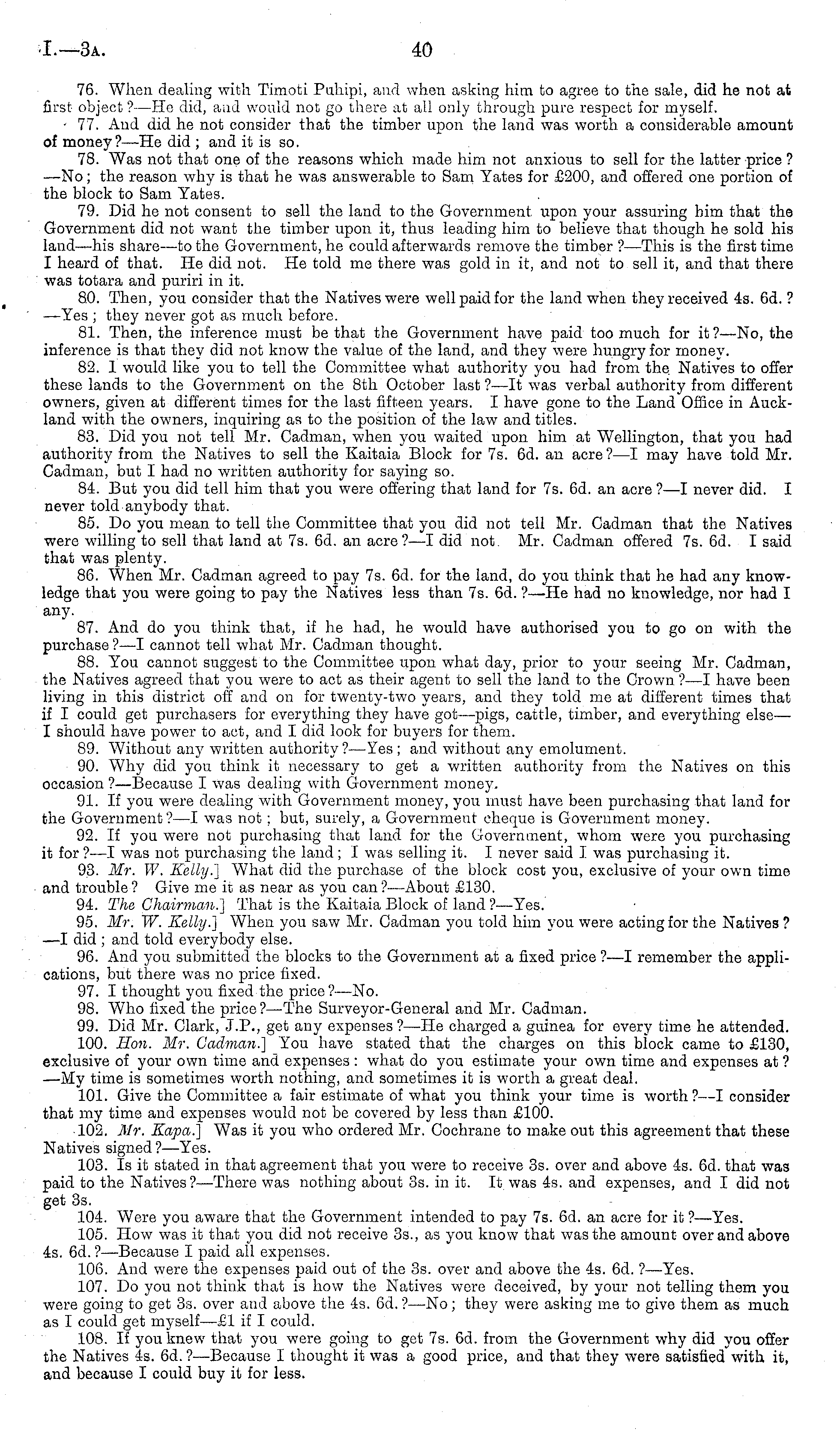 76. When dealing with Timoti Puhipi, and when asking him to agree to the sale, did he not at first object'? —He did, and would not go there at all only through pure respect for myself. 77. And did he not consider that the timber upon the land was worth a considerable amount of money ?—He did ; and it is so. 78. Was not that one of the reasons which made him not anxious to sell for the latter price ? —No; the reason why is that he was answerable to Sam Yates for £200, and offered one portion of the block to Sam Yates. 79. Did he not consent to sell the land to the Government upon your assuring him that the Government did not want the timber upon it, thus leading him to believe that though he sold his land—his share—to the Government, he could afterwards remove the timber ? —This is the first time I heard of that. He did not. He told me there was gold in it, and not to sell it, and that there was totara and puriri in it. 8.0. Then, you consider that the Natives were well paid for the land when they received 4s. 6d. ? —Yes ; they never got as much before. 81. Then, the inference must be that the Government have paid too much for it?—No, the inference is that they did not know the value of the land, and they were hungry for money. 82. I would like you to tell the Committee what authority you had from the Natives to offer these lands to the Government on the Bth October last ?—lt was verbal authority from different owners, given at different times for the last fifteen years. I have gone to the Land Office in Auckland with the owners, inquiring aa to the position of the law and titles. 83. Did you not tell Mr. Cadman, when you waited upon him at Wellington, that you had authority from the Natives to sell the Kaitaia Block for 7s. 6d. an acre ?—I may have told Mr. Cadman, but I had no written authority for saying so. 84. But you did tell him that you were offering that land for 7s. 6d. an acre ?—I never did. I never told anybody that. 85. Do you mean to tell the Committee that you did not tell Mr. Cadman that the Natives were willing to sell that land at 7s. 6d. an acre?—l did not. Mr. Cadman offered 7s. 6d. I said that was plenty. 86. When Mr. Cadman agreed to pay 7s. 6d. for the land, do you think that he had any knowledge that you were going to pay the Natives less than 7s. 6d. ?—He had no knowledge, nor had I any. 87. And do you think that, if he had, he would have authorised you to go on with the purchase ?—I cannot tell what Mr. Cadman thought. 88. You cannot suggest to the Committee upon what day, prior to your seeing Mr. Cadman, the Natives agreed that you were to act as their agent to sell the land to the Crown ?—I have been living in this district off and on for twenty-two years, and they told me at different times that if I could get purchasers for everything they have got—pigs, cattle, timber, and everything else— I should have power to act, and I did look for buyers for them. 89. Without any written authority ?—Yes ; and without any emolument. 90. Why did you think it necessary to get a written authority from the Natives on this occasion ?—Because I was dealing with Government money. 91. If you were dealing with Government money, you must have been purchasing that land for the Government?—l was not ; but, surely, a Government cheque is Government money. 92. If you were not purchasing that land for the Government, whom were you purchasing it for ? —I was not purchasing the land ; I was selling it. I never said I was purchasing it. 93. Mr. W. Kelly.] W T hat did the purchase of the block cost you, exclusive of your own time and trouble? Give me it as near as you can?— About £130. 94. The Chairman.'] That is the Kaitaia Block of land ?—Yes. 95. Mr. W. Kelly.] When you saw Mr. Cadman you told him you were acting for the Natives ? —I did ; and told everybody else. 96. And you submitted the blocks to the Government at a fixed price ?—I remember the applications, but there was no price fixed. 97. I thought you fixed the price?— No. 98. Who fixed the price?— The Surveyor-General and Mr. Cadman. 99. Did Mr. Clark, J. P., get any expenses ?—-He charged a guinea for every time he attended. 100. Hon. Mr. Cadman.] You have stated that the charges on this block came to £130, exclusive of your own time and expenses : what do you estimate your own time and expenses at? —My time is sometimes worth nothing, and sometimes it is worth a great deal. 101. Give the Committee a fair estimate of what you think your time is worth?—l consider that my time and expenses would not be covered by less than £100. 102. Mr. Kapa.] Was it you who ordered Mr. Cochrane to make out this agreement that these Natives signed ? —Yes. 103. Is it stated in that agreement that you were to receive 3s. over and above 4s. 6d. that was paid to the Natives? —There was nothing about 3s. in it. It was 4s. and expenses, and I did not get 3s. 104. Were you aware that the Government intended to pay 7s. 6d. an acre for it ?—Yes. 105. How was it that you did not receive 35., as you know that was the amount over and above 4s. 6d. ?—Because I paid all expenses. 106. And were the expenses paid out of the 3s. over and above the 4s. 6d. ?—Yes. 107. Do you not think that is how the Natives were deceived, by your not telling them you were going to get 3s. over and above the 4s. 6d. ? —No; they were asking me to give them as much as I could get myself—£l if I could. 108. If you knew that you were going to get 7s. 6d. from the Government why did you offer the Natives 4s. 6d. ?—Because I thought it was a good price, and that they were satisfied with it, and because I could buy it for less.