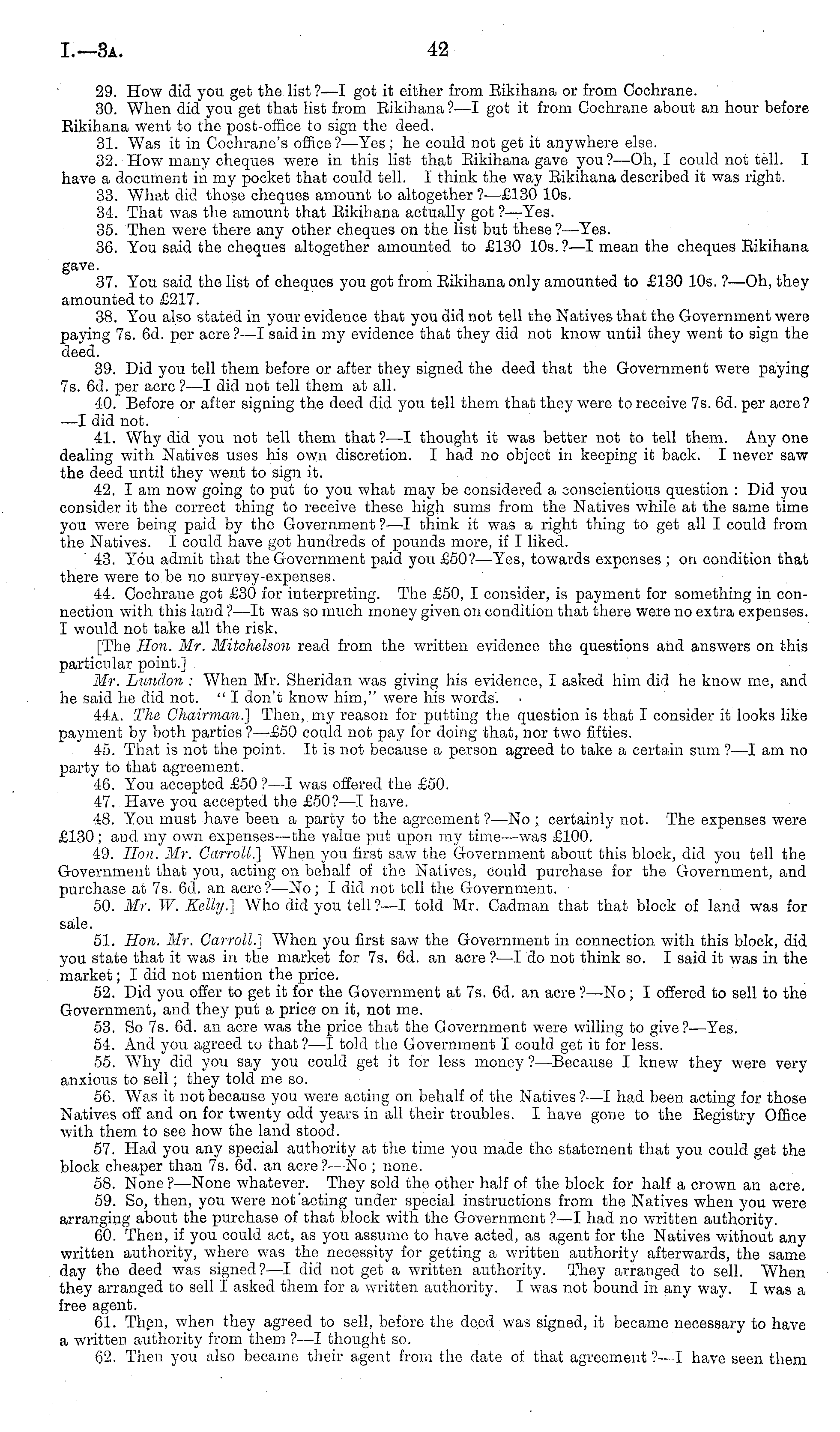 29. How did you get the list ?—I got it either from Eikihana or from Cochrane. 30. When did you get that list from Eikihana?—l got it from Cochrane about an hour before Eikihana went to the post-office to sign the deed. 31. Was it in Coehrane's office? —Yes; he could not get it anywhere else. 32. How many cheques were in this list that Eikihana gave you?—Oh, I could not tell. I have a document in my pocket that could tell. I think the way Eikihana described it was right. 33. What did those cheques amount to altogether?—£l3o 10s. 34. That was the amount that Eikihana actually got ? —Yes. 35. Then were there any other cheques on the list but these ?—Yes. 36. You said the cheques altogether amounted to £130 10s. ?—I mean the cheques Eikihana gave. 37. You said the list of cheques you got from Eikihana only amounted to £130 10s. ?—Oh, they amounted to £217. 38. You also stated in your evidence that you did not tell the Natives that the Government were paying 7s. 6d. per acre?—l said in my evidence that they did not know until they went to sign the deed. 39. Did you tell them before or after they signed the deed that the Government were paying 7s. 6d. per acre ?—I did not tell them at all. 40. Before or after signing the deed did you tell them that they were to receive 7s. 6d. per acre? —I did not. 41. Why did you not tell them that ?—I thought it was better not to tell them. Any one dealing with Natives uses his own discretion. I had no object in keeping it back. I never saw the deed until they went to sign it. 42. I am now going to put to you what may be considered a conscientious question : Did you consider it the correct thing to receive these high sums from the Natives while at the same time you were being paid by the Government ? —I think it was a right thing to get all I could from the Natives. I could have got hundreds of pounds more, if I liked. 43. You admit that the Government paid you £50?— Yes, towards expenses ; on condition that there were to be no survey-expenses. 44. Cochrane got £30 for interpreting. The £50, I consider, is payment for something in connection with this land ? —lt was so much money given on condition that there were no extra expenses. I would not take all the risk. [The Hon. Mr. Mitchelson read from the written evidence the questions and answers on this particular point.] Mr. Lunclon : When Mr. Sheridan was giving his evidence, I asked him did he know me, and he said he did not. " I don't know him," were his words. 44a. The Chairman.] Then, my reason for putting the question is that I consider it looks like payment by both parties ?—£so could not pay for doing that, nor two fifties. 45. That is not the point. It is not because a person agreed to take a certain sum ?—I am no party to that agreement. '16. You accepted £50 ?—I was offered the £50. 47. Have you accepted the £50? —I have. 48. You must have been a party to the agreement ?—No ; certainly not. The expenses were £130; and my own expenses—the value put upon my time—was £100. 49. Hon. Mr. Carroll.'] When you first saw the Government about this block, did you tell the Government that you, acting on behalf of the Natives, could purchase for the Government, and purchase at 7s. 6d. an acre?—No; I did not tell the Government. 50. Mr. W. Kelly.] Who did you tell ?—I told Mr. Cadman that that block of land was for sale. 51. Hon. Mr. Carroll.] When you first saw the Government in connection with this block, did you state that it was in the market for 7s. 6d. an acre ?—I do not think so. I said it was in the market; I did not mention the price. 52. Did you offer to get it for the Government at 7s. 6d. an acre ? —No; I offered to sell to the Government, and they put a price on it, not me. 53. So 7s. 6d. an acre was the price that the Government were willing to give?— Yes. 54. And you agreed to that?—l told the Government I could get it for less. 55. Why did you say you could get it for less money ?—Because I knew they were very anxious to sell; they told me so. 56. Was it not because you were acting on behalf of the Natives?—l had been acting for those Natives off and on for twenty odd years in all their troubles. I have gone to the Eegistry Office with them to see how the land stood. 57. Had you any special authority at the time you made the statement that you could get the block cheaper than 7s. 6d. an acre?—No ; none. 58. None? —None whatever. They sold the other half of the block for half a crown an acre. 59. So, then, you were not'acting under special instructions from the Natives when you were arranging about the purchase of that block with the Government ?—I had no written authority. 60. Then, if you could act, as you assume to have acted, as agent for the Natives without any written authority, where was the necessity for getting a written authority afterwards, the same day the deed was signed?—l did not get a written authority. They arranged to sell. When they arranged to sell I asked them for a written authority. I was not bound in any way. I was a free agent. 61. Then, when they agreed to sell, before the deed was signed, it became necessary to have a written authority from them ?—I thought so. 62. Then you also became their agent from the date of that agreement?—l have seen them