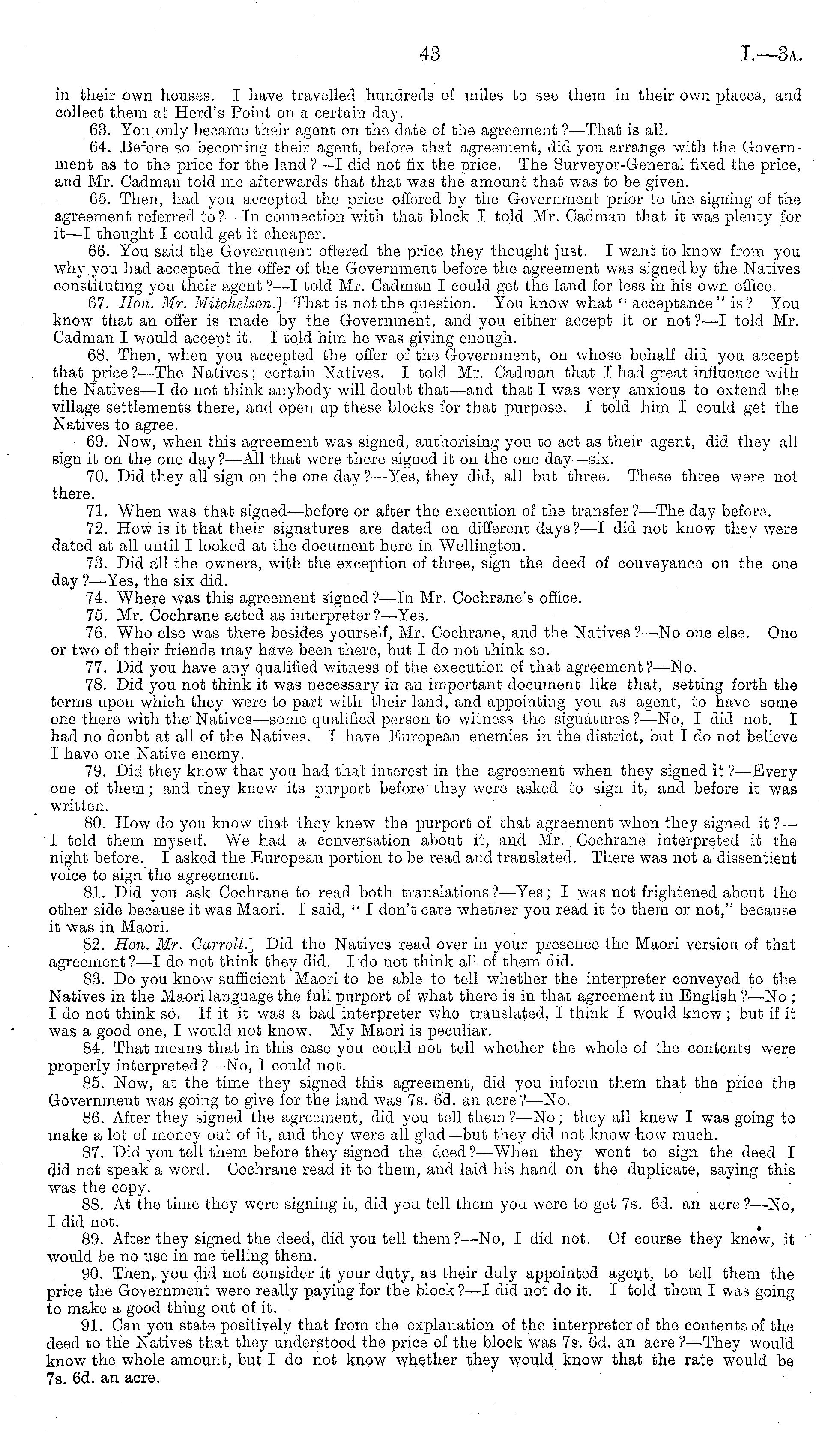 in their own houses. I have travelled hundreds of miles to see them in their own places, and collect them at Herd's Point on a certain day. 63. You only became their agent on the date of the agreement ? —That is all. 64. Before so becoming their agent, before that agreement, did you arrange with the Government as to the price for the land ?—I did not fix the price. The Surveyor-General fixed the price, and Mr. Cadman told me afterwards that that was the amount that was to be given. 65. Then, had you accepted the price offered by the Government prior to the signing of the agreement referred to ? —ln connection with that block I told Mr. Cadman that it was plenty for it—l thought I could get it cheaper. 66. You said the Government offered the price they thought just. I want to know from you why you had accepted the offer of the Government before the agreement was signed by the Natives constituting you their agent ?—I told Mr. Cadman I could get the land for less in his own office. 67. Hon. Mr. Mitchelson.] That is not the question. You know what " acceptance "is ? You know that an offer is made by the Government, and you either accept it or not ?—I told Mr. Cadman I would accept it. I told him he was giving enough. 68. Then, when you accepted the offer of the Government, on whose behalf did you accept that price?— The Natives; certain Natives. I told Mr. Cadman that I had great influence with the Natives—l do not think anybody will doubt that—and that I was very anxious to extend the village settlements there, and open up these blocks for that purpose. I told him I could get the Natives to agree. 69. Now, when this agreement was signed, authorising you to act as their agent, did they all sign it on the one day?— All that were there signed it on the one day —six. 70. Did they all sign on the one day ?—Yes, they did, all but three. These three were not there. 71. When was that signed —before or after the execution of the transfer? —The day before. 72. How is it that their signatures are dated on different days?—l did not know they were dated at all until I looked at the document here in Wellington. 73. Did all the owners, with the exception of three, sign the deed of conveyancs on the one day ?—Yes, the six did. 74. Where was this agreement signed ? —ln Mr. Cochrane's office. 75. Mr. Cochrane acted as interpreter?— Yes. 76. Who else was there besides yourself, Mr. Cochrane, and the Natives ? —No one else. One or two of their friends may have been there, but I do not think so. 77. Did you have any qualified witness of the execution of that agreement?— No. 78. Did you not think it was necessary in an important document like that, setting forth the terms upon which they were to part with their land, and appointing you as agent, to have some one there with the Natives—some qualified person to witness the signatures ? —No, I did not. I had no doubt at all of the Natives. I have European enemies in the district, but Ido not believe I have one Native enemy. 79. Did they know that you had that interest in the agreement when they signed It ?—Every one of them; and they knew its purport before■ they were asked to sign it, and before it was written. 80. How do you know that they knew the purport of that agreement when they signed it ?— I told them myself. We had a conversation about it, and Mr. Cochrane interpreted it the night before. I asked the European portion to be read and translated. There was not a dissentient voice to sign the agreement. 81. Did you ask Cochrane to read both translations?— Yes; I was not frightened about the other side because it was Maori. I said, " I don't care whether you read it to them or not," because it was in Maori. 82. Hon. Mr. Carroll.'] Did the Natives read over in your presence the Maori version of that agreement?—l do not think they did. Ido not think all of them did. 83. Do you know sufficient Maori to be able to tell whether the interpreter conveyed to the Natives in the Maori language the full purport of what there is in that agreement in English ?—No ; Ido not think so. If it it was a bad interpreter who translated, I think I would know ; but if it was a good one, I would not know. My Maori is peculiar. 84. That means that in this case you could not tell whether the whole of the contents were properly interpreted?—No, I could not. 85. Now, at the time they signed this agreement, did you inform them that the price the Government was going to give for the land was 7s. 6d. an acre?— No. 86. After they signed the agreement, did you toll them? —No; they all knew I was going to make a lot of money oat of it, and they were all glad—but they did not know how much. 87. Did you tell them before they signed ihe deed?— When they went to sign the deed I did not speak a word. Cochrane read it to them, and laid his hand on the duplicate, saying this was the copy. 88. At the time they were signing it, did you tell them you were to get 7s. 6d. an acre ?—No, I did not. 89. After they signed the deed, did you tell them?—No, I did not. Of course they knew, it would be no use in me telling them. 90. Then, you did not consider it your duty, as their duly appointed agent, to tell them the price the Government were really paying for the block? —I did not do it. I told them I was going to make a good thing out of it. 91. Can you state positively that from the explanation of the interpreter of the contents of the deed to the Natives that they understood the price of the block was 7s. 6d. an acre ?—They would know the whole amount, but I do not know whether they would know that the rate would be 7s. 6d. an acre.
