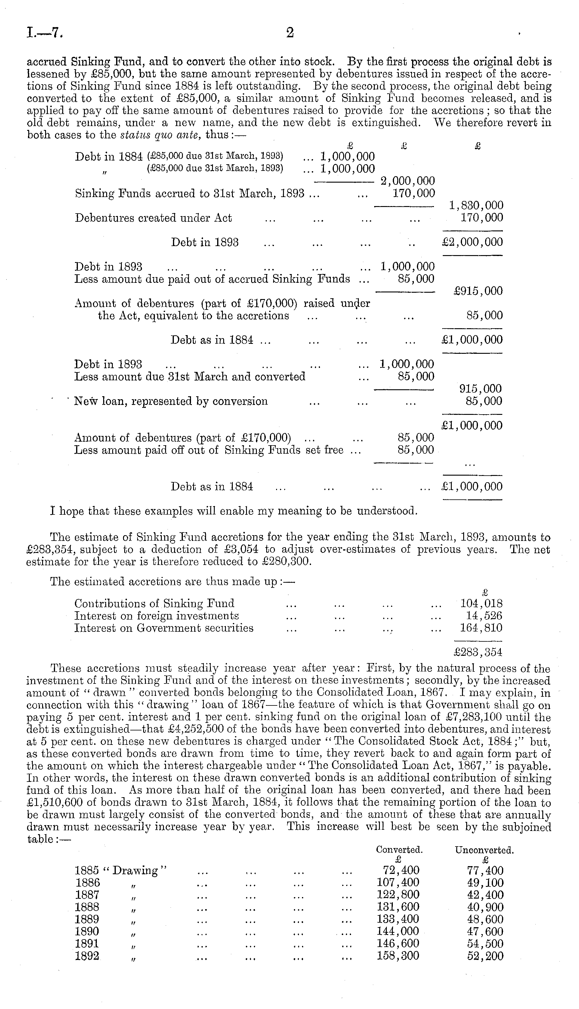 accrued Sinking Fund, and to convert the other into stock. By the first process the original debt is lessened by £85,000, but the same amount represented by debentures issued in respect of the accretions of Sinking Fund since 1884 is left outstanding. By the second process, the original debt being converted to the extent of £85,000, a similar amount of Sinking Fund becomes released, and is applied to pay off the same amount of debentures raised to provide for the accretions ; so that the old debt remains, under a new name, and the new debt is extinguished. We therefore revert in both cases to the status quo ante, thus : — £ £ £ Debt in 1884 (£85,000 due 31 st March, 1893) ... 1,000,000 (£85,000 due 31st March, 1893) ... 1,000,000 2,000,000 Sinking Funds accrued to 31st March, 1893 ... ... 170,000 — 1,830,000 Debentures created under Act ... ... ... ... 170,000 Debt in 1893 ... ... ... .. £2,000,000 Debt in 1893 ... ... ... ... ... 1,000,000 Less amount due paid out of accrued Sinking Funds ... 85,000 • £915,000 Amount of debentures (part of £170,000) raised under the Act, equivalent to the accretions ... ... ... 85,000 Debt as in 1884 ... ... ... ... £1,000,000 Debt in 1893 ... ... ... ... ... 1,000,000 Less amount due 31st March and converted ... 85,000 915,000 New loan, represented by conversion ... ... ... 85,000 £1,000,000 Amount of debentures (part of £170,000) ... ... 85,000 Less amount paid off out of Sinking Funds set free ... 85,000 Debt as in 1884 ... ... ... ... £1,000,000 I hope that these examples will enable my meaning to be understood. The estimate of Sinking Fund accretions for the year ending the 31st March, 1893, amounts to £283,354, subject to a deduction of £3,054 to adjust over-estimates of previous years. The net estimate for the year is therefore reduced to £280,300. The estimated accretions are thus made up : — Contributions of Sinking Fund ... ... ... ... 104,018 Interest on foreign investments ... ... ... ... 14,526 Interest on Government securities ... ... ... ... 164,810 £283,354 These accretions must steadily increase year after year: First, by the natural process of the investment of the Sinking Fund and of the interest on these investments ; secondly, by the increased amount of " drawn " converted bonds belonging to the Consolidated Loan, 1867. I may explain, in connection with this " drawing " loan of 1867 —the feature of %vhich is that Government shall go on paying 5 per cent, interest and 1 per cent, sinking fund on the original loan of £7,283,100 until the debt is extinguished—that £4,252,500 of the bonds have been converted into debentures, and interest at 5 per cent, on these new debentures is charged under "The Consolidated Stock Act, 1884;" but, as these converted bonds are drawn from time to time, they revert back to and again form part of the amount on which the interest chargeable under " The Consolidated Loan Act, 1867," is payable. In other words, the interest on these drawn converted bonds is an additional contribution of sinking fund of this loan. As more than half of the original loan has been converted, and there had been £1,510,600 of bonds drawn to 31st March, 1884, it follows that the remaining portion of the loan to be drawn must largely consist of the converted bonds, and the amount of these that are annually drawn must necessarily increase year by year. This increase will best be seen by the subjoined table:— Converted. Unconverted. £ £ 1885 " Drawing" ... ... ... ... 72,400 77,400 1886 „ ... ... ... ... 107,400 49,100 1887 „ ... ... ... ... 122,800 42,400 1888 „ ... ... ... ... 131,600 40,900 1889 „ ... ... ... ... 133,400 48,600 1890 „ ... ... 144,000 47,600 1891 „ ... ... ... ... 146,600 54,500 1892 „ ... ... ... ... 158,300 52,200