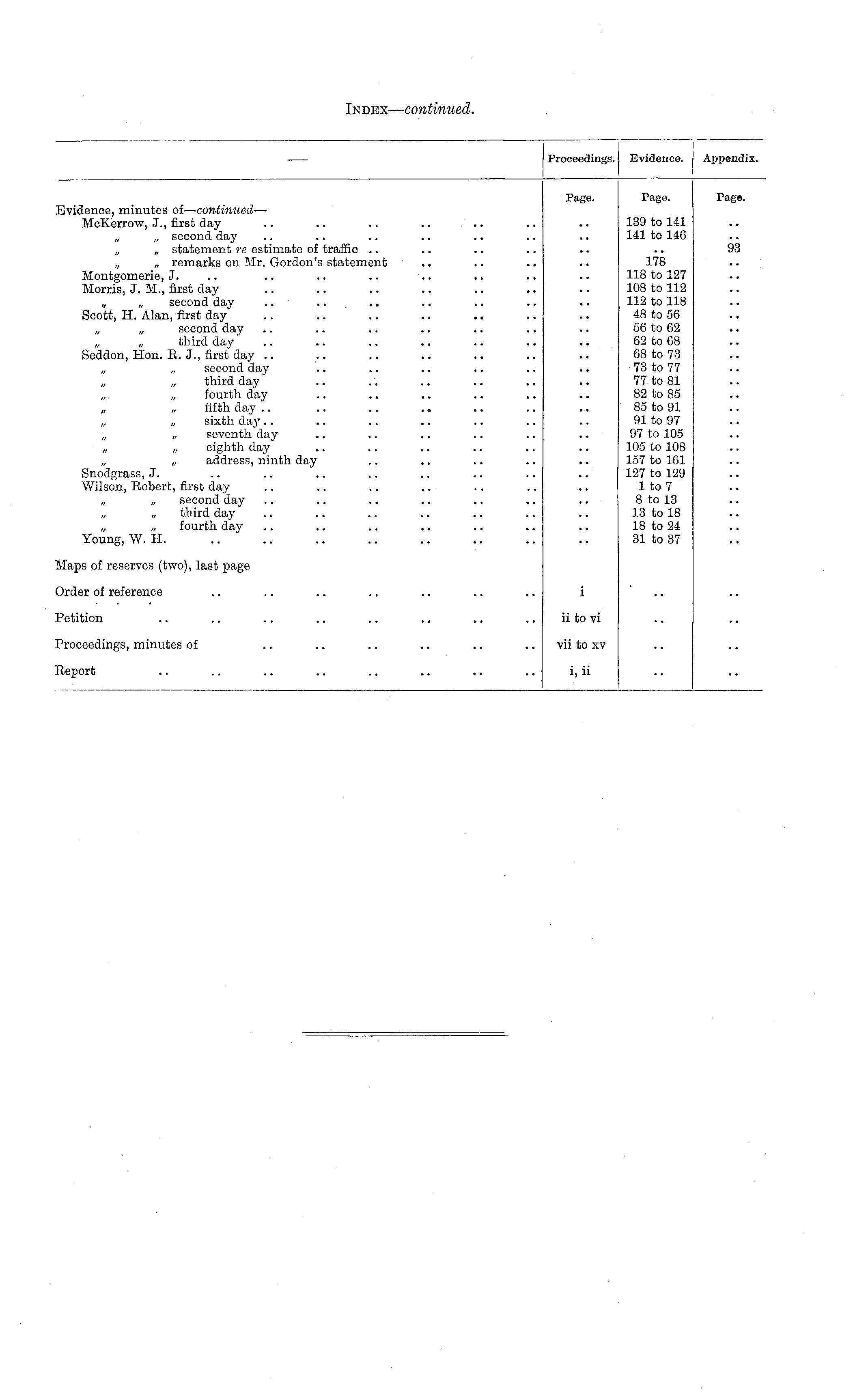 Proceedings. Evidence. Appendix. Page. Page. Page. Evidence, minutes of — continued — McKerrow, J., first day „ second day „ statement re estimate of traffic .. „ „ remarks on Mr. Gordon's statement Montgomerie, J. Morris, J. M., first day „ „ second day Scott, H. Alan, first day second day „ third day Seddon, Hon. R. J., first day .. „ „ second day „ „ third day „ fourth day fifth day sixth day .. „ „ seventh day „ „ eighth day address, ninth day Snodgrass, J. Wilson, Robert, first day second day „ „ third day „ „ fourth day Young, W. H. 139 to 141 141 to 146 178 118 to 127 108 to 112 112 to 118 48 to 56 56 to 62 62 to 68 68 to 73 73 to 77 77 to 81 82 to 85 85 to 91 91 to 97 97 to 105 105 to 108 157 to 161 127 to 129 1 to 7 8 to 13 13 to 18 18 to 24 31 to 37 93 Maps of reserves (two), last page i Order of reference Petition ii to vi Proceedings, minutes of vii to xv Report i, ii