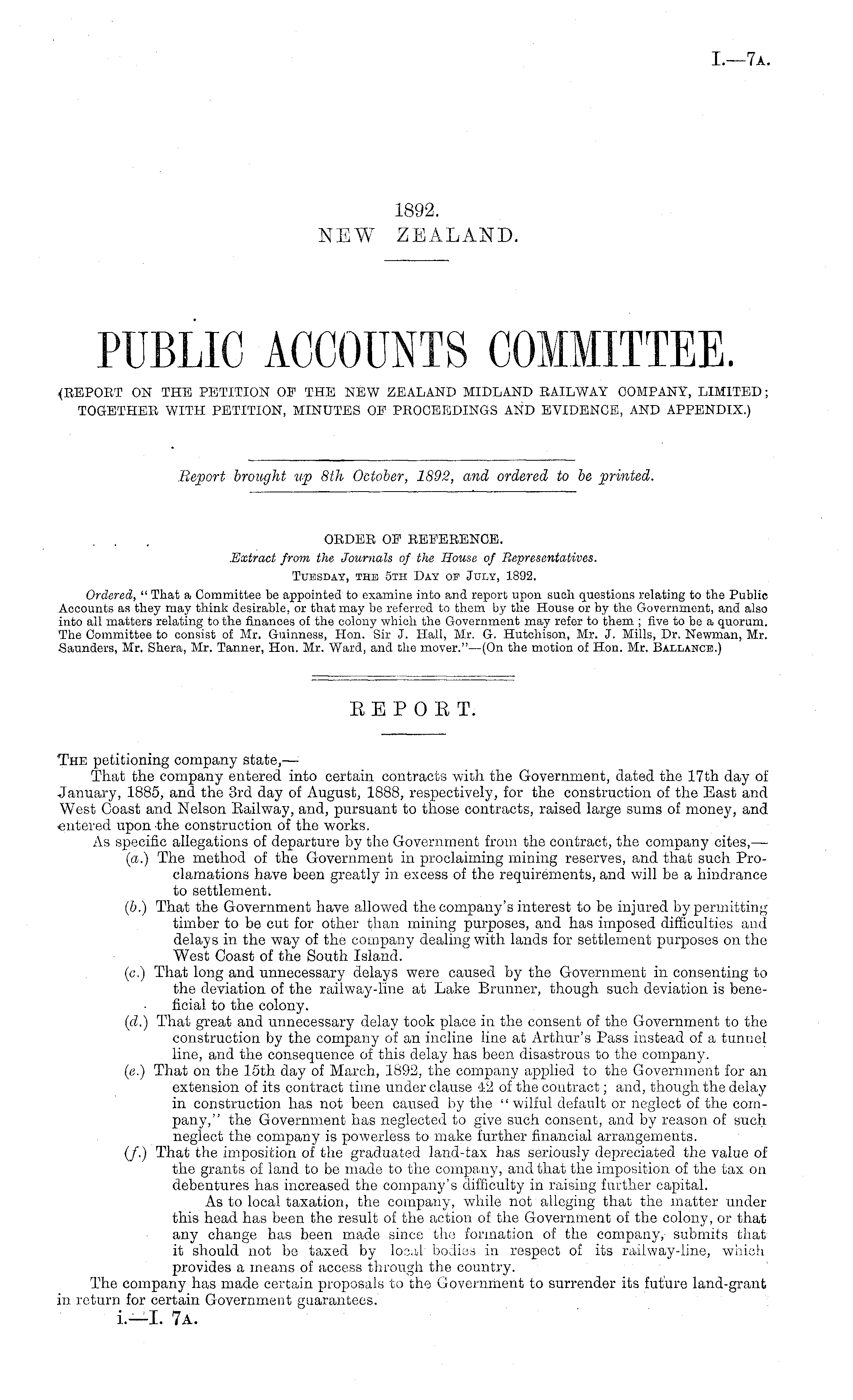 . . . ORDER OE REEERENCE. Extract from the Journals of the Souse of Representatives. Tuesday, the sth Day op July, 1892. Ordered, " That a Committee be appointed to examine into and report upon such questions relating to the Public Accounts as they may think desirable, or that may be referred to them by the House or by the Government, and also into all matters relating to the finances of the colony which the Government may refer to them ; five to be a quorum. The Committee to consist of Mr. Guinness, Hon. Sir J. Hall, Mr. G. Hutchison, Mr. J. Mills, Dr. Newman, Mr. Saunders, Mr. Shera, Mr. Tanner, Hon. Mr. Ward, and the mover."—(On the motion of Hon. Mr. Ballance.)