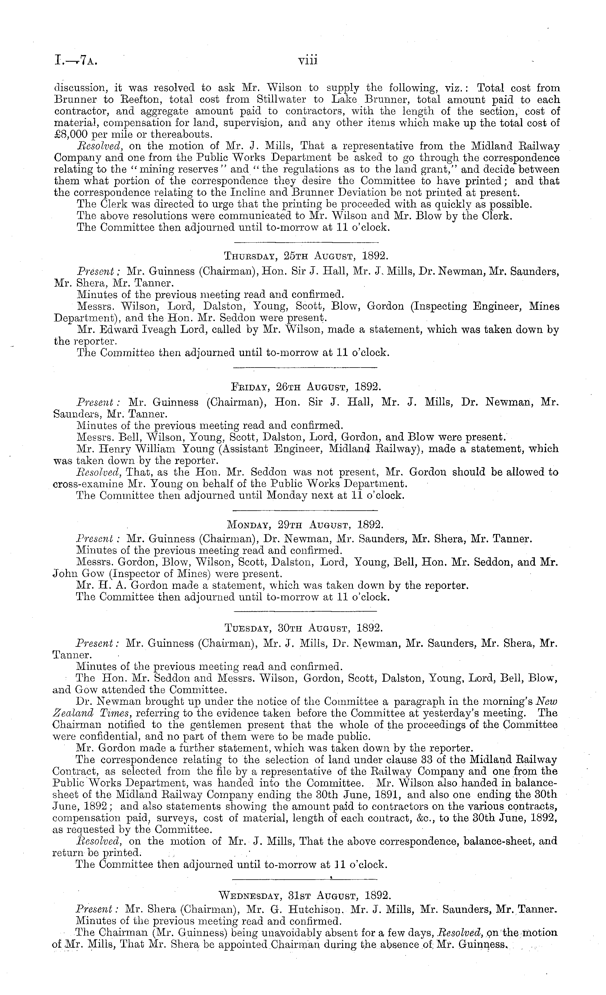 Thursday, 25th August, 1892. Present; Mr. Guinness (Chairman), Hon. Sir J. Hall, Mr. J. Mills, Dr. Newman, Mr. Saunders, Mr. Shera, Mr. Tanner. Minutes of the previous meeting read and confirmed. Messrs. Wilson, Lord, Dalston, Young, Scott, Blow, Gordon (Inspecting Engineer, Mines Department), and the Hon. Mr. Seddon were present. Mr. Edward Iveagh Lord, called by Mr. Wilson, made a statement, which was taken down by the reporter. The Committee then adjourned until to-morrow at 11 o'clock.