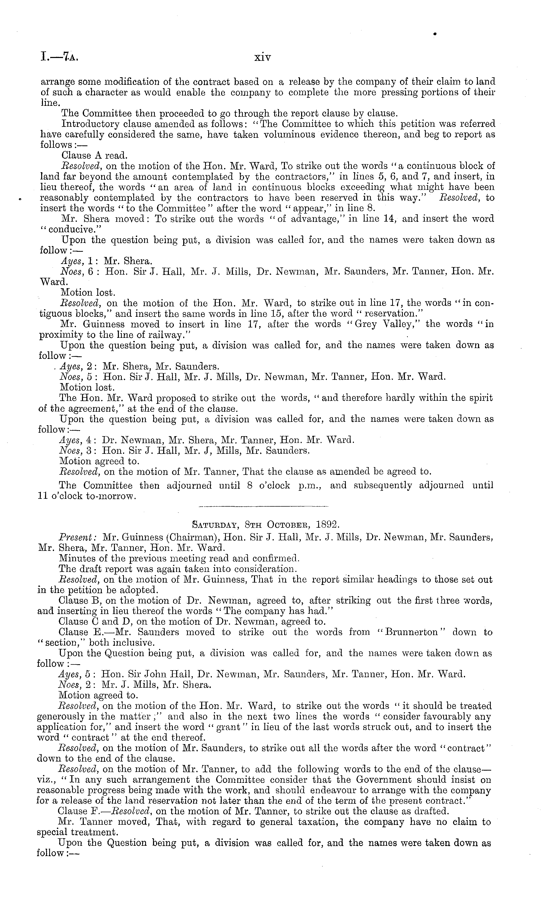 Saturday, Bth October, 1892. Present: Mr. Guinness (Chairman), Hon. Sir J. Hall, Mr. J. Mills, Dr. Newman, Mr. Saunders, Mr. Shera, Mr. Tanner, Hon. Mr. Ward. Minutes of the previous meeting read and confirmed. The draft report was again taken into consideration. Resolved, on the motion of Mr. Guinness, That in the report similar headings to those set out in the petition be adopted. Clause B, on the motion of Dr. Newman, agreed to, after striking out the first three words, and inserting in lieu thereof the words "The company has had." Clause C and D, on the motion of Dr. Newman, agreed to. Clause E.—Mr. Saunders moved to strike out the words from " Brunnerton" down to " section," both inclusive. Upon the Question being put, a division was called for, and the names were taken down as follow :— Ayes, 5 : Hon. Sir John Hall, Dr. Newman, Mr. Saunders, Mr. Tanner, Hon. Mr. Ward. Noes, 2 : Mr. J. Mills, Mr. Shera. Motion agreed to. Resolved, on the motion of the Hon. Mr. Ward, to strike out the words " it should be treated generously in the matter," and also in the next two lines the words " consider favourably any application for," and insert the word " grant" in lieu of the last words struck out, and to insert the word " contract " at the end thereof. Resolved, on the motion of Mr. Saunders, to strike out all the words after the word "contract" down to the end of the clause. Resolved, on the motion of Mr. Tanner, to add the following words to the end of the clause— viz., " In any such arrangement the Committee consider that the Government should insist on reasonable progress being made with the work, and should endeavour to arrange with the company for a release of the land reservation not later than the end of the term of the present contract." Clause F.— Resolved, on the motion of Mr. Tanner, to strike out the clause as drafted. Mr. Tanner moved, That, with regard to general taxation, the company have no claim to special treatment. Upon the Question being put, a division was called for, and the names were taken down as follow:—