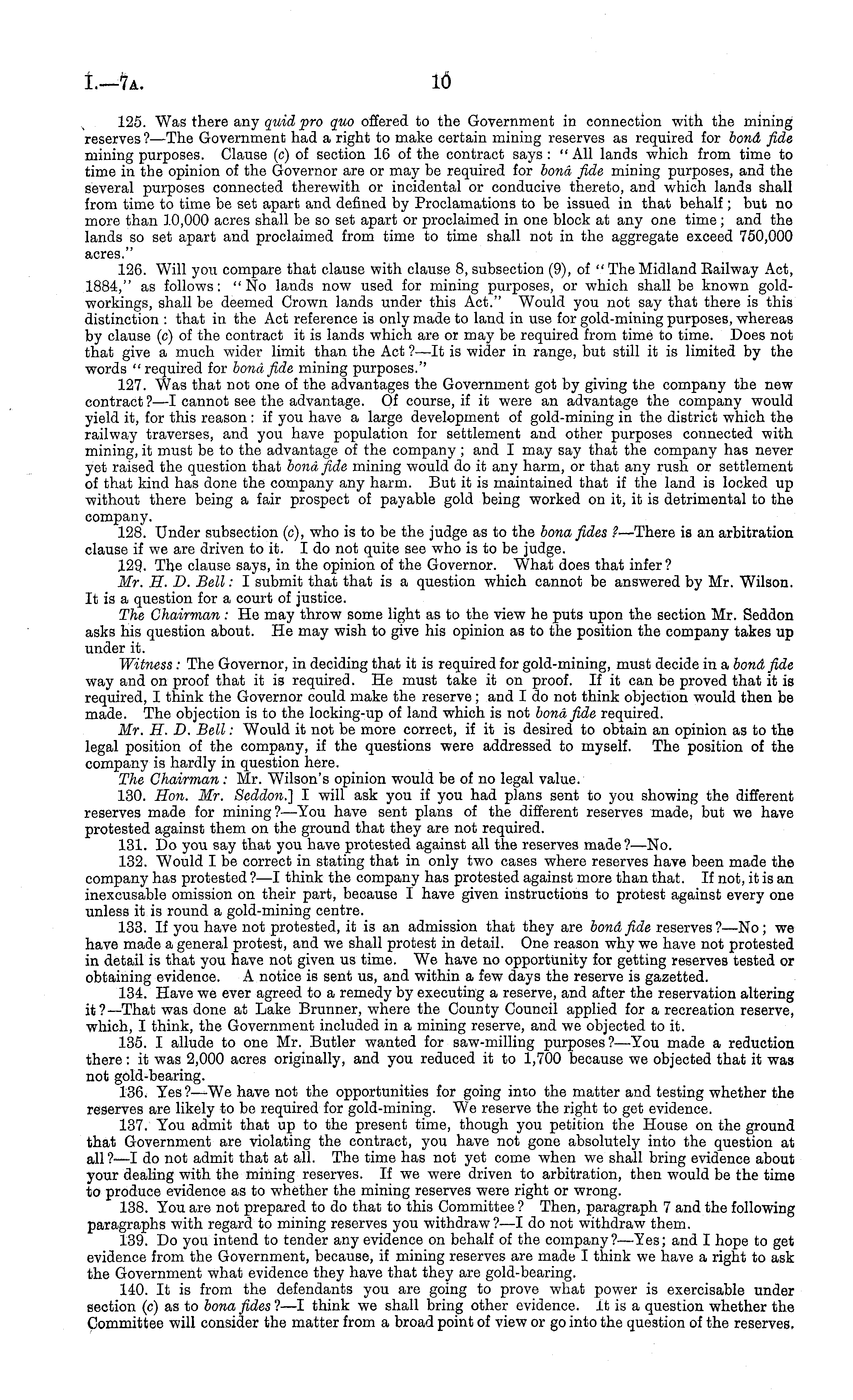 125. Was there any quid pro quo offered to the Government in connection with the mining reserves ?—The Government had a right to make certain mining reserves as required for bond fide mining purposes. Clause (c) of section 16 of the contract says : " All lands which from time to time in the opinion of the Governor are or may be required for bond fide mining purposes, and the several purposes connected therewith or incidental or conducive thereto, and which lands shall from time to time be set apart and defined by Proclamations to be issued in that behalf; but no more than 10,000 acres shall be so set apart or proclaimed in one block at any one time; and the lands so set apart and proclaimed from time to time shall not in the aggregate exceed 750,000 acres." 126. Will you compare that clause with clause 8, subsection (9), of " The Midland Eailway Act, 1884," as follows: "No lands now used for mining purposes, or which shall be known goldworkings, shall be deemed Crown lands under this Act." Would you not say that there is this distinction : that in the Act reference is only made to land in use for gold-mining purposes, whereas by clause (c) of the contract it is lands which are or may be required from time to time. Does not that give a much wider limit than the Act ?—lt is wider in range, but still it is limited by the words "required for bond fide mining purposes." 127. Was that not one of the advantages the Government got by giving the company the new contract ? —I cannot see the advantage. Of course, if it were an advantage the company would yield it, for this reason : if you have a large development of gold-mining in the district which the railway traverses, and you have population for settlement and other purposes connected with mining, it must be to the advantage of the company; and I may say that the company has never yet raised the question that bond fide mining would do it any harm, or that any rush or settlement of that kind has done the company any harm. But it is maintained that if the land is locked up without there being a fair prospect of payable gold being worked on it, it is detrimental to the company. 128. Under subsection (c), who is to be the judge as to the bona fides ? —There is an arbitration clause if we are driven to it. Ido not quite see who is to be judge. 129. The clause says, in the opinion of the Governor. What does that infer? Mr. H. D. Bell: I submit that that is a question which cannot be answered by Mr. Wilson. It is a question for a court of justice. The Chairman : He may throw some light as to the view he puts upon the section Mr. Seddon asks his question about. He may wish to give his opinion as to the position the company takes up under it. Witness: The Governor, in deciding that it is required for gold-mining, must decide in a bond fide way and on proof that it is required. He must take it on proof. If it can be proved that it is required, I think the Governor could make the reserve; and Ido not think objection would then be made. The objection is to the locking-up of land which is not bond fide required. Mr. H. D. Bell: Would it not be more correct, if it is desired to obtain an opinion as to the legal position of the company, if the questions were addressed to myself. The position of the company is hardly in question here. The Chairman : Mr. Wilson's opinion would be of no legal value. 130. Hon. Mr. Seddon.] I will ask you if you had plans sent to you showing the different reserves made for mining? —-You have sent plans of the different reserves made, but we have protested against them on the ground that they are not required. 131. Do you say that you have protested against all the reserves made?— No. 132. Would I be correct in stating that in only two cases where reserves have been made the company has protested ? —I think the company has protested against more than that. If not, it is an inexcusable omission on their part, because I have given instructions to protest against every one unless it is round a gold-mining centre. 133. If you have not protested, it 13 an admission that they are bond fide reserves?—No; we have made a general protest, and we shall protest in detail. One reason why we have not protested in detail is that you have not given us time. We have no opportunity for getting reserves tested or obtaining evidence. A notice is sent us, and within a few days the reserve is gazetted. 134. Have we ever agreed to a remedy by executing a reserve, and after the reservation altering it?— That was done at Lake Brunner, where the County Council applied for a recreation reserve, which, I think, the Government included in a mining reserve, and we objected to it. 135. I allude to one Mr. Butler wanted for saw-milling purposes?— You made a reduction there: it was 2,000 acres originally, and you reduced it to 1,700 because we objected that it was not gold-bearing. 136. Yes?—We have not the opportunities for going into the matter and testing whether the reserves are likely to be required for gold-mining. We reserve the right to get evidence. 137. You admit that up to the present time, though you petition the House on the ground that Government are violating the contract, you have not gone absolutely into the question at all ? —I do not admit that at all. The time has not yet come when we shall bring evidence about your dealing with the mining reserves. If we were driven to arbitration, then would be the time to produce evidence as to whether the mining reserves were right or wrong. 138. You are not prepared to do that to this Committee ? Then, paragraph 7 and the following paragraphs with regard to mining reserves you withdraw?—l do not withdraw them. 139. Do you intend to tender any evidence on behalf of the company?— Yes; and I hope to get evidence from the Government, because, if mining reserves are made I think we have a right to ask the Government what evidence they have that they are gold-bearing. 140. It is from 