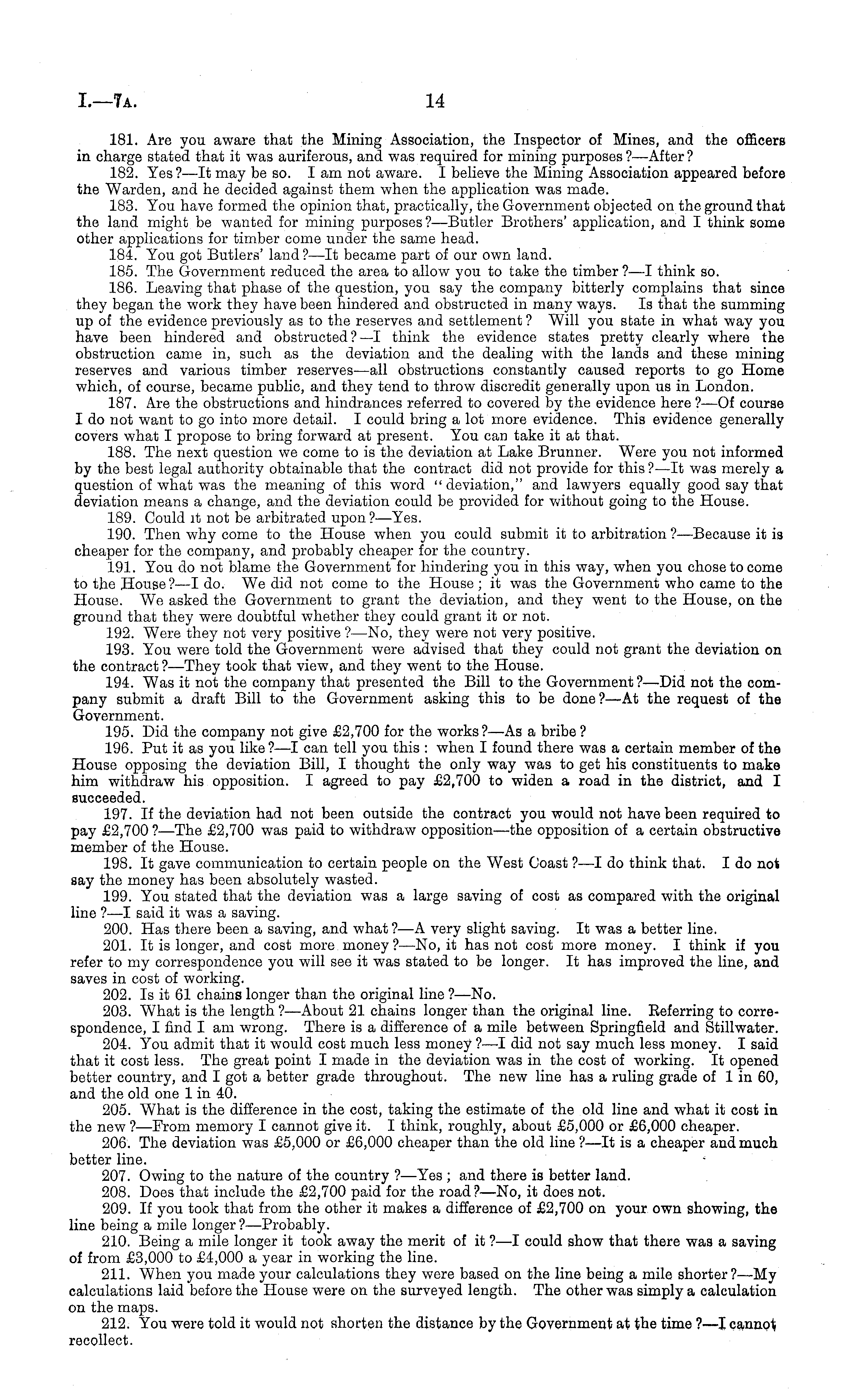 181. Are you aware that the Mining Association, the Inspector of Mines, and the officers in charge stated that it was auriferous, and was required for mining purposes ? —After ? 182. Yes?—lt may be so. lam not aware. I believe the Mining Association appeared before the Warden, and he decided against them when the application was made. 183. You have formed the opinion that, practically, the Government objected on the ground that the land might be wanted for mining purposes? —Butler Brothers' application, and I think some other applications for timber come under the same head. 184. You got Butlers' land ?—lt became part of our own land. 185. The Government reduced the area to allow you to take the timber ?—I think so. 186. Leaving that phase of the question, you say the company bitterly complains that since they began the work they have been hindered and obstructed in many ways. Is that the summing up of the evidence previously as to the reserves and settlement? Will you state in what way you have been hindered and obstructed ?—I think the evidence states pretty clearly where the obstruction came in, such as the deviation and the dealing with the lands and these mining reserves and various timber reserves —all obstructions constantly caused reports to go Home which, of course, became public, and they tend to throw discredit generally upon us in London. 187. Are the obstructions and hindrances referred to covered by the evidence here ? —Of course Ido not want to go into more detail. I could bring a lot more evidence. This evidence generally covers what I propose to bring forward at present. You can take it at that. 188. The next question we come to is the deviation at Lake Brunner. Were you not informed by the best legal authority obtainable that the contract did not provide for this ?—lt was merely a question of what was the meaning of this word "deviation," and lawyers equally good say that deviation means a change, and the deviation could be provided for without going to the House. 189. Could it not be arbitrated upon ?—Yes. 190. Then why come to the House when you could submit it to arbitration ?—Because it is cheaper for the company, and probably cheaper for the country. 191. You do not blame the Government for hindering you in this way, when you chose to come to the House? —I do. We did not come to the House ;it was the Government who came to the House. We asked the Government to grant the deviation, and they went to the House, on the ground that they were doubtful whether they could grant it or not. 192. Were they not very positive ? —No, they were not very positive. 193. You were told the Government were advised that they could not grant the deviation on the contract ? —They took that view, and they went to the House. 194. Was it not the company that presented the Bill to the Government ?—Did not the company submit a draft Bill to the Government asking this to be done ?—At the request of the Government. 195. Did the company not give £2,700 for the works?—As a bribe? 196. Put it as you like ?—I can tell you this : when I found there was a certain member of the House opposing the deviation Bill, I thought the only way was to get his constituents to make him withdraw his opposition. I agreed to pay £2,700 to widen a road in the district, and I succeeded. 197. If the deviation had not been outside the contract you would not have been required to pay £2,700 ? —The £2,700 was paid to withdraw opposition—the opposition of a certain obstructive member of the House. 198. It gave communication to certain people on the West Coast ?—I do think that. Ido not say the money has been absolutely wasted. 199. You stated that the deviation was a large saving of cost as compared with the original line ?—I said it was a saving. 200. Has there been a saving, and what ?—A very slight saving. It was a better line. 201. It is longer, and cost more money ? —No, it has not cost more money. I think if you refer to my correspondence you will see it was stated to be longer. It has improved the line, and saves in cost of working. 202. Is it 61 chains longer than the original line ?—No. 203. What is the length ? —About 21 chains longer than the original line. Eeferring to correspondence, I find I am wrong. There is a difference of a mile between Springfield and Stillwater. 204. You admit that it would cost much less money ?—-I did not say much less money. I said that it cost less. The great point I made in the deviation was in the cost of working. It opened better country, and I got a better grade throughout. The new line has a ruling grade of lin 60, and the old one 1 in 40. 205. What is the difference in the cost, taking the estimate of the old line and what it cost in the new ?—From memory I cannot give it. I think, roughly, about £5,000 or £6,000 cheaper. 206. The deviation was £5,000 or £6,000 cheaper than the old line ?—lt is a cheaper and much better line. 207. Owing to the nature of the country ? —Yes ; and there is better land. 208. Does that include the £2,700 paid for the road ?—No, it does not. 209. If you took that from the other it makes a difference of £2,700 on your own showing, the line being a mile longer? —Probably. 210. Being a mile longer it took away the merit of it ? —I could show that there was a saving of from £3,000 to £4,000 a year in working the line. 211. When you made your calculations they were based on the line being a mile shorter?—My calculations laid before the House were on the surveyed length. The other was simply a calculation on the maps. 212. You were told it would not shorten the distance by the Government at the time ?—I cannot recollect.