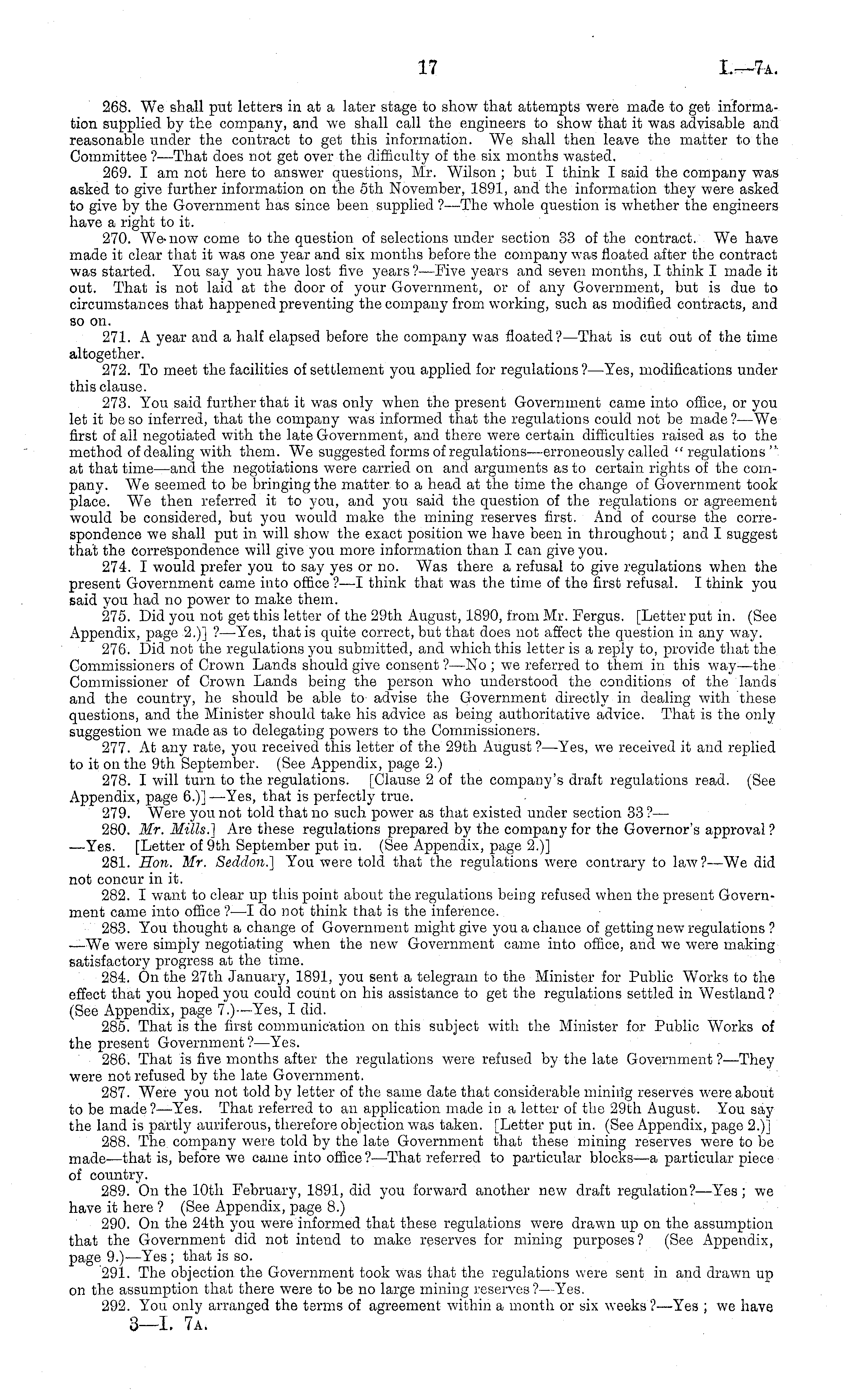 268. We shall put letters in at a later stage to show that attempts were made to get information supplied by the company, and we shall call the engineers to show that it was advisable and reasonable under the contract to get this information. We shall then leave the matter to the Committee ?—That does not get over the difficulty of the six months wasted. 269. I am not here to answer questions, Mr. Wilson ; but I think I said the company was asked to give further information on the sth November, 1891, and the information they were asked to give by the Government has since been supplied ?—The whole question is whether the engineers have a right to it. 270. We-now come to the question of selections under section 33 of the contract. We have made it clear that it was one year and six months before the company was floated after the contract was started. You say you have lost five years ?—Five years and seven months, I think I made it out. That is not laid at the door of your Government, or of any Government, but is due to circumstances that happened preventing the company from working, such as modified contracts, and so on. 271. A year and a half elapsed before the company was floated?— That is cut out of the time altogether. 272. To meet the facilities of settlement you applied for regulations?— Yes, modifications under this clause. 273. You said further that it was only when the present Government came into office, or you let it be so inferred, that the company was informed that the regulations could not be made ?—We first of all negotiated with the late Government, and there were certain difficulties raised as to the method of dealing with them. We suggested forms of regulations—erroneously called "regulations"' at that time—and the negotiations were carried on and arguments as to certain rights of the company. We seemed to be bringing the matter to a head at the time the change of Government took place. We then referred it to you, and you said the question of the regulations or agreement would be considered, but you would make the mining reserves first. And of course the correspondence we shall put in will show the exact position we have been in throughout; and I suggest that the Correspondence will give you more information than I can give you. 274. I would prefer you to say yes or no. Was there a refusal to give regulations when the present Government came into office ?—I think that was the time of the first refusal. I think you said you had no power to make them. 275. Did you not get this letter of the 29th August, 1890, from Mr. Fergus. [Letter put in. (See Appendix, page 2.)] ?—Yes, that is quite correct, but that does not affect the question in any way. 276. Did not the regulations you submitted, and which this letter is a reply to, provide that the Commissioners of Crown Lands should give consent ?—No ; we referred to them in this way—the Commissioner of Crown Lands being the person who understood the conditions of the lands and the country, he should be able to advise the Government directly in dealing with these questions, and the Minister should take his advice as being authoritative advice. That is the only suggestion we made as to delegating powers to the Commissioners. 277. At any rate, you received this letter of the 29th August ?—Yes, we received it and replied to it on the 9th September. (See Appendix, page 2.) 278. I will turn to the regulations. [Clause 2of the company's draft regulations read. (See Appendix, page 6.)] —Yes, that is perfectly true. 279. Were you not told that no such power as that existed under section 33 ?— 280. Mr. Mills.] Are these regulations prepared by the company for the Governor's approval ? ■ —Yes. [Letter of 9th September put in. (See Appendix, page 2.)] 281. Hon. Mr. Seddon.] You were told that the regulations were contrary to law?—We did not concur in it. 282. I want to clear up this point about the regulations being refused when the present Government came into office ?—I do not think that is the inference. 283. You thought a change of Government might give you a chance of getting new regulations ? —We were simply negotiating when the new Government came into office, and we were making satisfactory progress at the time. 284. On the 27th January, 1891, you sent a telegram to the Minister for Public Works to the effect that you hoped you could count on his assistance to get the regulations settled in Westland? (See Appendix, page 7.) —Yes, I did. 285. That is the first communication on this subject with the Minister for Public Works of the present Government ?—Yes. 286. That is five months after the regulations were refused by the late Government ?—They were not refused by the late Government. 287. Were you not told by letter of the same date that considerable mining reserves were about to be made?— Yes. That referred to an application made in a letter of the 29th August. You say the land is partly auriferous, therefore objection was taken. [Letter put in. (See Appendix, page 2.)] 288. The company were told by the late Government that these mining reserves were to be made —that is, before we came into office ?—That referred to particular blocks—a particular piece of country. 289. On the 10th February, 1891, did you forward another new draft regulation?— Yes; we have it here ? (See Appendix, page 8.) 290. On the 24th you were informed that these regulations were drawn up on the assumption that the Government did not intend to make reserves for mining purposes? (See Appendix, page 9.) —Yes ; that is so. 291. The objection the Government took was that the regulations were sent in and drawn up on the assumption that there were to be no large mining reserves?— Yea. 292. You only arranged the terms of agreement within a month or six weeks ?—Yes ; we have 3—l. 7a.