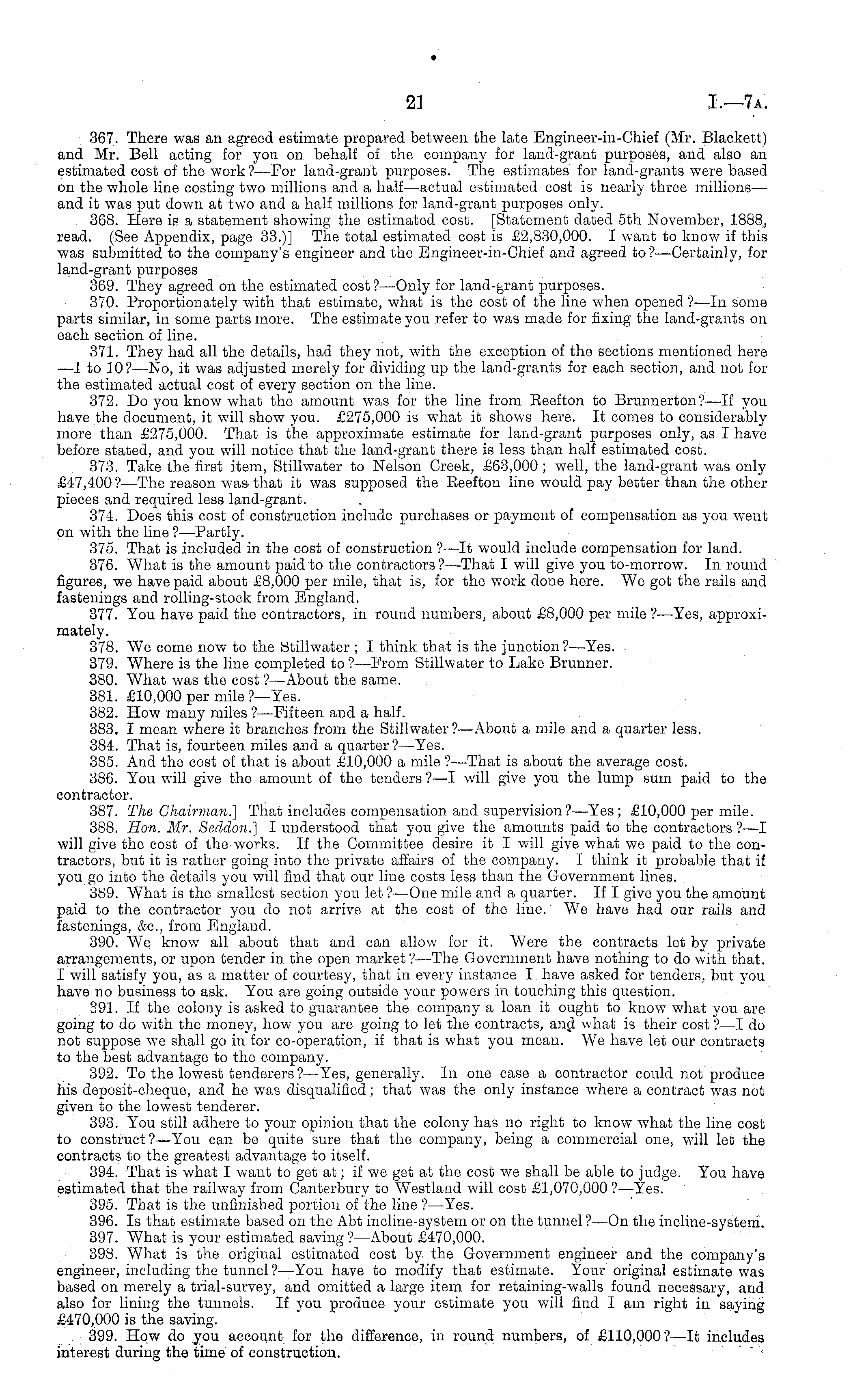367. There was an agreed estimate prepared between the late Engineer-in-Chief (Mr. Blackett) and Mr. Bell acting for you on behalf of the company for land-grant purposes, and also an estimated cost of the work ? —For land-grant purposes. The estimates for land-grants were based on the whole line costing two millions and a half—actual estimated cost is nearly three millions— and it was put down at two and a half millions for land-grant purposes only. 368. Here is a statement showing the estimated cost. [Statement dated sth November, 1888, read. (See Appendix, page 33.)] The total estimated cost is £2,830,000. I want to know if this was submitted to the company's engineer and the Engineer-in-Chief and agreed to ?—Certainly, for land-grant purposes 369. They agreed on the estimated cost ? —Only for land-grant purposes. 370. Proportionately with that estimate, what is the cost of the line when opened ?—ln some parts similar, in some parts more. The estimate you refer to was made for fixing the land-grants on each section of line. 371. They had all the details, had they not, with the exception of the sections mentioned here —1 to 10?— No, it was adjusted merely for dividing up the land-grants for each section, and not for the estimated actual cost of every section on the line. 372. Do you know what the amount was for the line from Reefton to Brunnerton?—lf you have the document, it will show you. £275,000 is what it shows here. It comes to considerably more than £275,000. That is the approximate estimate for land-grant purposes only, as I have before stated, and you will notice that the land-grant there is less than half estimated cost. 373. Take the first item, Stillwater to Nelson Creek, £63,000 ; well, the land-grant was only £47,400 ?—The reason was- that it was supposed the Eeefton line would pay better than the otherpieces and required less land-grant. 374. Does this cost of construction include purchases or payment of compensation as you went on with the line ? —Partly. 375. That is included in the cost of construction ? —lt would include compensation for land. 376. What is the amount paid to the contractors ? —-That I will give you to-morrow. In round figures, we have paid about £8,000 per mile, that is, for the work done here. We got the rails and fastenings and rolling-stock from England. 377. You have paid the contractors, in round numbers, about £8,000 per mile ?—Yes, approximately. 378. We come now to the Stillwater ; I think that is the junction?— Yes. 379. Where is the line completed to ?—From Stillwater to Lake Brunner. 380. What was the cost ?—About the same. 381. £10,000 per mile ?—Yes. 382. How many miles ?—Fifteen and a half. 383. I mean where it branches from the Stillwater?—About a mile and a quarter less. 384. That is, fourteen miles and a quarter ?—Yes. 385. And the cost of that is about £10,000 a mile ?—That is about the average cost. 386. You will give the amount of the tenders ?—I will give you the lump sum paid to the contractor. 387. The Chairman.'] That includes compensation and supervision?— Yes; £10,000 per mile. 388. Hon. Mr. Scddon.] I understood that you give the amounts paid to the contractors ?—I will give the cost of theworks. If the Committee desire it I will give what we paid to the contractors, but it is rather going into the private affairs of the company. I think it probable that if you go into the details you will find that our line costs less than the Government lines. 389. What is the smallest section you let ?—One mile and a quarter. If I give you the amount paid to the contractor you do not arrive at the cost of the line.' We have had our rails and fastenings, &c, from England. 390. We know all about that and can allow for it. Were the contracts let by private arrangements, or upon tender in the open market? —The Government have nothing to do with that. I will satisfy you, as a matter of courtesy, that in every instance I have asked for tenders, but you have no business to ask. You are going outside your powers in touching this question. ■391. If the colony is asked to guarantee the company a loan it ought to know what you are going to do with the money, how you are going to let the contracts, and what is their cost ? —I do not suppose we shall go in for co-operation, if that is what you mean. We have let our contracts to the best advantage to the company. 392. To the lowest tenderers?— Yes, generally. In one case a contractor could not produce his deposit-cheque, and he was disqualified; that was the only instance where a contract was not given to the lowest tenderer. 393. You still adhere to your opinion that the colony has no right to know what the line cost to construct ?—You can be quite sure that the company, being a commercial one, will let the contracts to the greatest advantage to itself. 394. That is what I want to get at; if we get at the cost we shall be able to judge. You have estimated that the railway from Canterbury to Westland will cost £1,070,000 ?—Yes. 395. That is the unfinished portion of the line ? —Yes. 396. Is that estimate based on the Abt incline-system or on the tunnel ? —On the incline-system. 397. What is your estimated saving?— About £470,000. 398. What is the original estimated cost by the Government engineer and the company's engineer, including the tunnel ? —You have to modify that estimate. Your original estimate was based on merely a trial-survey, and omitted a large item for retaining-walls found necessary, and also for lining the tunnels. If you produce your estimate you will find lam right in saying £470,000 is the saving. 399. How do you account for the difference, in round numbers, of £110,000? —It includes interest during the time of construction.