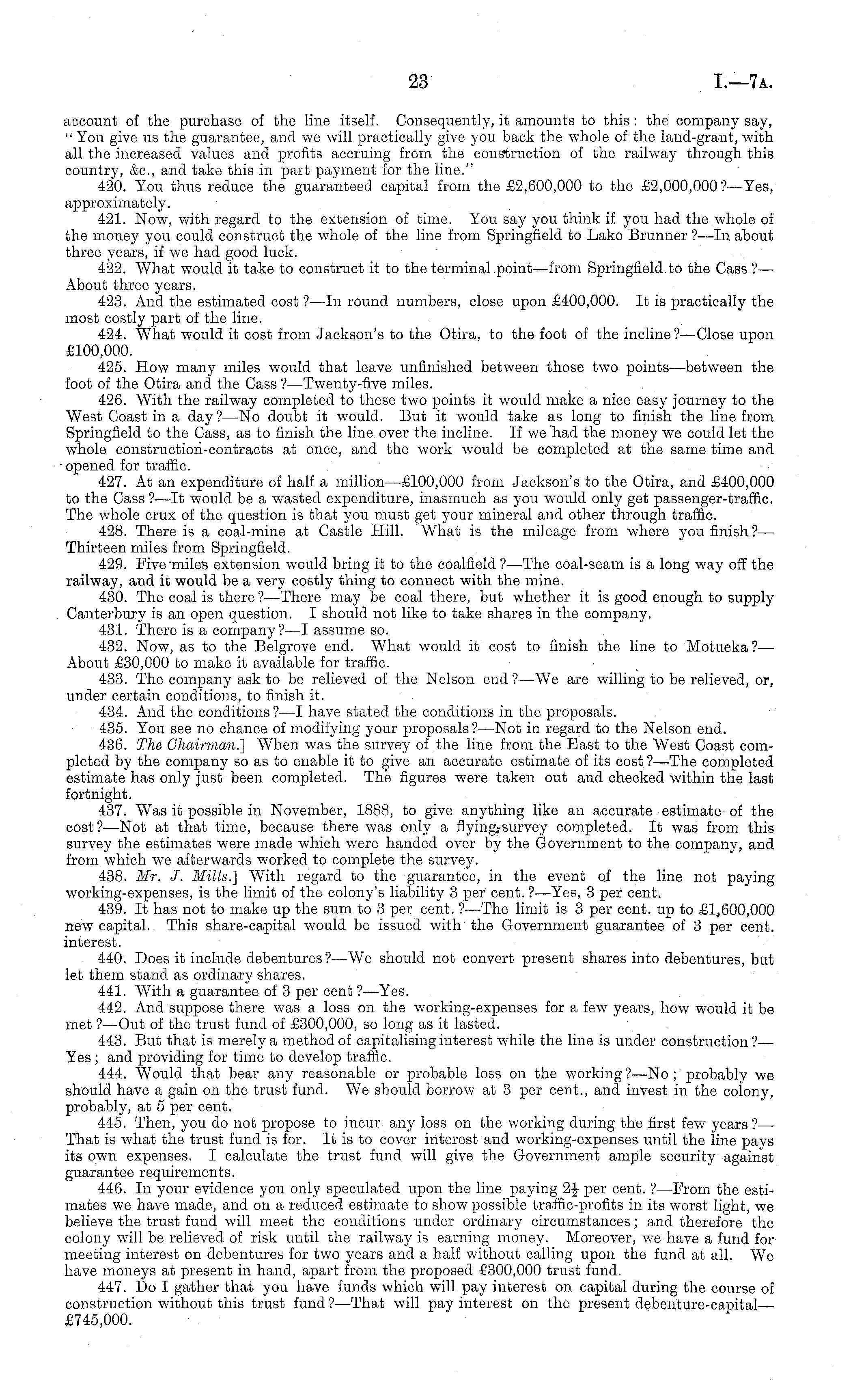 account of the purchase of the line itself. Consequently, it amounts to this: the company say, "You give us the guarantee, and we will practically give you back the whole of the land-grant, with all the increased values and profits accruing from the construction of the railway through this country, &c, and take this in part payment for the line." 420. You thus reduce the guaranteed capital from the £2,600,000 to the £2,ooo,ooo?—Yes, approximately. 421. Now, with regard to the extension of time. You say you think if you had the whole of the money you could construct the whole of the line from Springfield to Lake Brunner ?—ln about three years, if we had good luck. 422. What would it take to construct it to the terminal point—from Springfield to the Cass ?—■ About three years. 423. And the estimated cost'? —In round numbers, close upon £400,000. It is practically the most costly part of the line. 424. What would it cost from Jackson's to the Otira, to the foot of the incline ?—Close upon £100,000. 425. How many miles would that leave unfinished between those two points—between the foot of the Otira and the Cass ?—Twenty-five miles. 426. With the railway completed to these two points it would make a nice easy journey to the West Coast in a day? —No doubt it would. But it would take as long to finish the line from Springfield to the Cass, as to finish the line over the incline. If we had the money we could let the whole construction-contracts at once, and the work would be completed at the same time and opened for traffic. 427. At an expenditure of half a million—£loo,ooo from Jackson's to the Otira, and £400,000 to the Cass ?—lt would be a wasted expenditure, inasmuch as you would only get passenger-traffic. The whole crux of the question is that you must get your mineral and other through traffic. 428. There is a coal-mine at Castle Hill. What is the mileage from where you finish ?— Thirteen miles from Springfield. 429. Five'miles extension would bring it to the coalfield ? —The coal-seam is a long way off the railway, and it would be a very costly thing to connect with the mine. 430. The coal is there ?—There may be coal there, but whether it is good enough to supply Canterbury is an open question. I should not like to take shares in the company. 431. There is a company?—l assume so. 432. Now, as to the Belgrove end. What would it cost to finish the line to Motueka?—■ About £30,000 to make it available for traffic. 433. The company ask to be relieved of the Nelson end ?—We are willing to be relieved, or, under certain conditions, to finish it. 434. And the conditions? —I have stated the conditions in the proposals. 435. You see no chance of modifying your proposals?— Not in regard to the Nelson end. 436. The Chairman.} When was the survey of the line from the East to the West Coast completed by the company so as to enable it to give an accurate estimate of its cost ?—The completed estimate has only just been completed. The figures were taken out and checked within the last fortnight. 437. Was it possible in November, 1888, to give anything like an accurate estimate of the cost? —Not at that time, because there was only a flying-survey completed. It was from this survey the estimates were made which were handed over by the Government to the company, and from which we afterwards worked to complete the survey. 438. Mr. J. Mills.} With regard to the guarantee, in the event of the line not paying working-expenses, is the limit of the colony's liability 3 per cent. ?—Yes, 3 per cent. 439. It has not to make up the sum to 3 per cent. ?—The limit is 3 per cent, up to £1,600,000 new capital. This share-capital would be issued with the Government guarantee of 3 per cent, interest. 440. Does it include debentures ? —We should not convert present shares into debentures, but let them stand as ordinary shares. 441. With a guarantee of 3 per cent ?—Yes. 442. And suppose there was a loss on the working-expenses for a few years, how would it be met ?—Out of the trust fund of £300,000, so long as it lasted. 443. But that is merely a method of capitalising interest while the line is under construction?— Yes ; and providing for time to develop traffic. 444. Would that bear any reasonable or probable loss on the working?—No; probably we should have a gain on the trust fund. We should borrow at 3 per cent., and invest in the colony, probably, at 5 per cent. 445. Then, you do not propose to incur any loss on the working during the first few years ?— That is what the trust fund is for. It is to cover interest and working-expenses until the line pays its own expenses. I calculate the trust fund will give the Government ample security against guarantee requirements. 446. In your evidence you only speculated upon the line paying 2-J- per cent. ?—From the estimates we have made, and on a reduced estimate to show possible traffic-profits in its worst light, we believe the trust fund will meet the conditions under ordinary circumstances; and therefore the colony will be relieved of risk until the railway is earning money. Moreover, we have a fund for meeting interest on debentures for two years and a half without calling upon the fund at all. We have moneys at present in hand, apart from the proposed £300,000 trust fund. 447. Do I gather that you have funds which will pay interest on capital during the course of construction without this trust fund ?—That will pay interest on the present debenture-capital— £745,000.