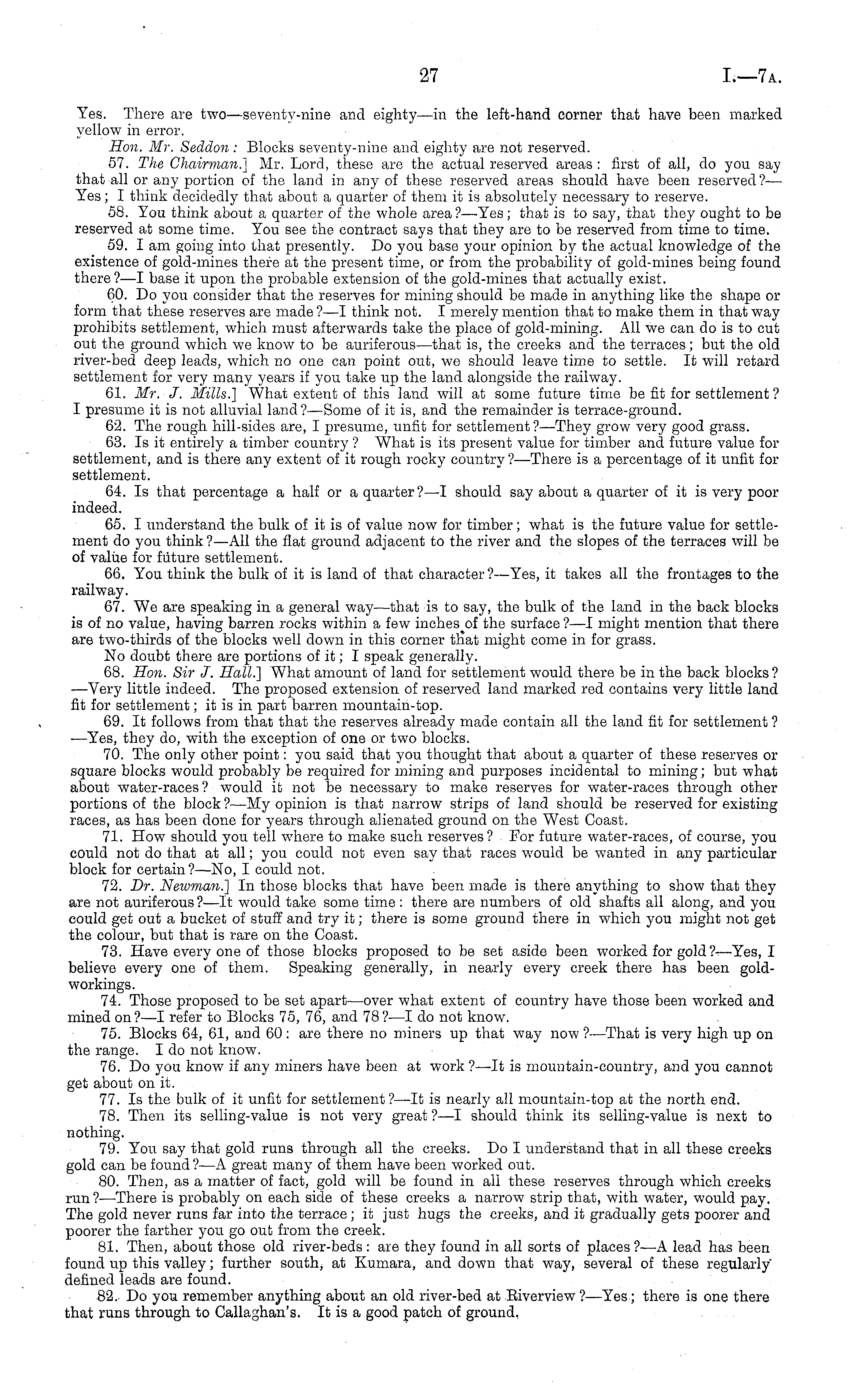 Yes. There are two— seventy-nine and eighty—in the left-hand corner that have been marked yellow in error. Hon. Mr. Seddon: Blocks seventy-nine and eighty are not reserved. 57. The Chairman.} Mr. Lord, these are the actual reserved areas : first of all, do you say that all or any portion of the land in any of these reserved areas should have been reserved ?— Yes; I think decidedly that about a quarter of them it is absolutely necessary to reserve. 58. You think about a quarter of the whole area?— Yes; that is to say, that they ought to be reserved at some time. You see the contract says that they are to be reserved from time to time. 59. lam going into that presently. Do you base your opinion by the actual knowledge of the existence of gold-mines there at the present time, or from the probability of gold-mines being found there?—l base it upon the probable extension of the gold-mines that actually exist. 60. Do you consider that the reserves for mining should be made in anything like the shape or form that these reserves are made ?—I think not. I merely mention that to make them in that way prohibits settlement, which must afterwards take the place of gold-mining. All we can do is to cut out the ground which we know to be auriferous —that is, the creeks and the terraces; but the old river-bed deep leads, which no one can point out, we should leave time to settle. It will retard settlement for very many years if you take up the land alongside the railway. 61. Mr. J. Mills.] What extent of this land will at some future time be fit for settlement ? I presume it is not alluvial land? —Some of it is, and the remainder is terrace-ground. 62. The rough hill-sides are, I presume, unfit for settlement?— They grow very good grass. 63. Is it entirely a timber country ? What is its present value for timber and. future value for settlement, and is there any extent of it rough rocky country ?—There is a percentage of it unfit for settlement. 64. Is that percentage a half or a quarter? —I should say about a quarter of it is very poor indeed. 65. I understand the bulk of it is of value now for timber; what is the future value for settlement do you think?— All the flat ground adjacent to the river and the slopes of the terraces will be of value for future settlement. 66. You think the bulk of it is land of that character ?—Yes, it takes all the frontages to the railway. 67. We are speaking in a general way—that is to say, the bulk of the land in the back blocks is of no value, having barren rocks within a few inches of the surface ? —I might mention that there are two-thirds of the blocks well down in this corner that might come in for grass. No doubt there are portions of it; I speak generally. 68. Hon. Sir J. Hall.] What amount of land for settlement would there be in the back blocks ? ■ —Very little indeed. The proposed extension of reserved land marked red contains very little land fit for settlement; it is in part barren mountain-top. 69. It follows from that that the reserves already made contain all the land fit for settlement ? —Yes, they do, with the exception of one or two blocks. 70. The only other point: you said that you thought that about a quarter of these reserves or square blocks would probably be required for mining and purposes incidental to mining; but what about water-races? would it not be necessary to make reserves for water-races through other portions of the block ?—My opinion is that narrow strips of land should be reserved for existing races, as has been done for years through alienated ground on the West Coast. 71. How should you tell where to make such reserves? For future water-races, of course, you could not do that at all; you could not even say that races would be wanted in any particular block for certain?—-No, I could not. 72. Dr. Neivman.] In those blocks that have been made is there anything to show that they are not auriferous?—lt would take some time: there are numbers of old shafts all along, and you could get out a bucket of stuff and try it; there is some ground there in which you might not get the colour, but that is rare on the Coast. 73. Have every one of those blocks proposed to be set aside been worked for gold ?—Yes, I believe every one of them. Speaking generally, in nearly every creek there has been goldworkings. 74. Those proposed to be set apart —over what extent of country have those been worked and mined on? —I refer to Blocks 75, 76, and 78? —I do not know. 75. Blocks 64, 61, and 60 : are there no miners up that way now ?—That is very high up on the range. Ido not know. 76. Do you know if any miners have been at work ?—lt is mountain-country, and you cannot get about on it. 77. Is the bulk of it unfit for settlement?—lt is nearly all mountain-top at the north end. 78. Then its selling-value is not very great ? —I should think its selling-value is next to nothing. 79. You say that gold runs through all the creeks. Do I understand that in all these creeks gold can be found? —A great many of them have been worked out. 80. Then, as a matter of fact, gold will be found in all these reserves through which creeks run? —There is probably on each side of these creeks a narrow strip that, with water, would pay. The gold never runs far into the terrace; it just hugs the creeks, and it gradually gets poorer and poorer the farther you go out from the creek. 81. Then, about those old river-beds: are they found in all sorts of places? —A lead has been found up this valley; further south, at Kumara, and down that way, several of these regularly" defined leads are found. 82. Do you remember anything about an old river-bed at Eiverview ?—Yes; there is one there that runs through to Callaghan's. It is a good patch of ground,