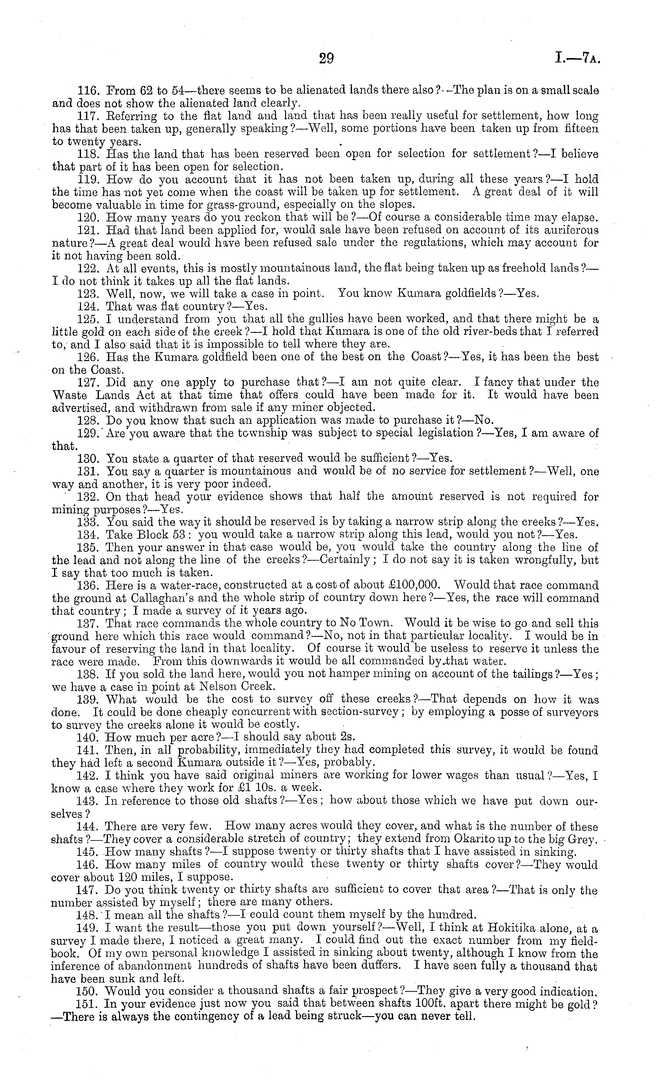 116. From 62 to 54—there seems to be alienated lands there also ?-— The plan is on a small scale and does not show the alienated land clearly. 117. Referring to the flat land and land that has been really useful for settlement, how long has that been taken up, generally speaking ?— Well, some portions have been taken up from fifteen to twenty years. 118. Has the land that has been reserved been open for selection for settlement ?—I believe that part of it has been open for selection. 119. How do you account that it has not been taken up, during all these years ?—I hold the time has not yet come when the coast will be taken up for settlement. A great deal of it will become valuable in time for grass-ground, especially on the slopes. 120. How many years do you reckon that will be ?—Of course a considerable time may elapse. 121. Had that land been applied for, would sale have been refused on account of its auriferous nature? —A great deal would have been refused sale under the regulations, which may account for it not having been sold. 122. At all events, this is mostly mountainous land, the flat being taken up as freehold lands ?—■ I do not think it takes up all the flat lands. 123. Well, now, we will take a case in point. You know Kumara goldfields? —Yes. 124. That was flat country?— Yes. 125. I understand from you that all the gullies have been worked, and that there might be a little gold on each side of the creek?—l hold that Kumara is one of the old river-beds that I referred to, and I also said that it is impossible to tell where they are. 126. Has the Kumara goldfield been one of the best on the Coast?— Yes, it has been the best on the Coast. 127. Did any one apply to purchase that?—l am not quite clear. I fancy that under the Waste Lands Act at that time that offers could have been made for it. It would have been advertised, and withdrawn from sale if any miner objected. 128. Do you know that such an application was made to purchase it ? —No. 129.' Are you aware that the township was subject to special legislation ?—Yes, I am aware of that. 130. You state a quarter of that reserved would be sufficient ?—Yes. 131. You say a quarter is mountainous and would be of no service for settlement?— Well, one way and another, it is very poor indeed. 132. On that head your evidence shows that half the amount reserved is not required for mining purposes ? —Yes. 133. You said the way it should be reserved is by taking a narrow strip along the creeks ?—Yes. 134. Take Block 53 : you would take a narrow strip along this lead, would you not?— Yes. 135. Then your answer in that case would be, you would take the country along the line of the lead and not along the line of the creeks ? —Certainly; I do not say it is taken wrongfully, but I say that too much is taken. 136. Here is a water-race, constructed at a cost of about £100,000. Would that race command the ground at Callaghan's and the whole strip of country down here?— Yes, the race will command that country; I made a survey of it years ago. 137. That race commands the whole country to No Town. Would it be wise to go and sell this ground here which this race would command?—No, not in that particular locality. I would be in favour of reserving the land in that locality. Of course it would be useless to reserve it unless the race were made. From this downwards it would be all commanded by that water. 138. If you sold the land here, would you not hamper mining on account of the tailings ?—Yes ; we have a case in point at Nelson Creek. 139. What would be the cost to survey off these creeks ?—That depends on how it was done. It could be done cheaply concurrent with section-survey; by employing a posse of surveyors to survey the creeks alone it would be costly. 140. How much per acre?—l should say about 2s. 141. Then, in all probability, immediately they had completed this survey, it would be found they had left a second Kumara outside it ?—Yes, probably. 142. I think you have said original miners are working for lower wages than usual ?—Yes, I know a case where they work for £1 10s. a week. 143. In reference to those old shafts?— Yes; how about those which we have put down ourselves ? 144. There are very few. How many acres would they cover, and what is the number of these shafts ? —They cover a considerable stretch of country; they extend from Okarito up to the big Grey. 145. How many shafts ? —I suppose twenty or thirty shafts that I have assisted in sinking. 146. How many miles of country would these twenty or thirty shafts cover?— They would cover about 120 miles, I suppose. 147. Do you think twenty or thirty shafts are sufficient to cover that area? —That is only the number assisted by myself; there are many others. 148.' I mean all the shafts ? —I could count them myself by the hundred. 149. I want the result —those you put down yourself ? —Well, I think at Hokitika alone, at a survey I made there, I noticed a great many. I could find out the exact number from my fieldbook. Of my own personal knowledge I assisted in sinking about twenty, although I know from the inference of abandonment hundreds of shafts have been duffers. I have seen fully a thousand that have been sunk and left. 150. Would you consider a thousand shafts a fair prospect? —They give a very good indication. 151. In your evidence just now you said that between shafts 100 ft. apart there might be gold? —There is always the contingency of a lead being struck—you can never tell.
