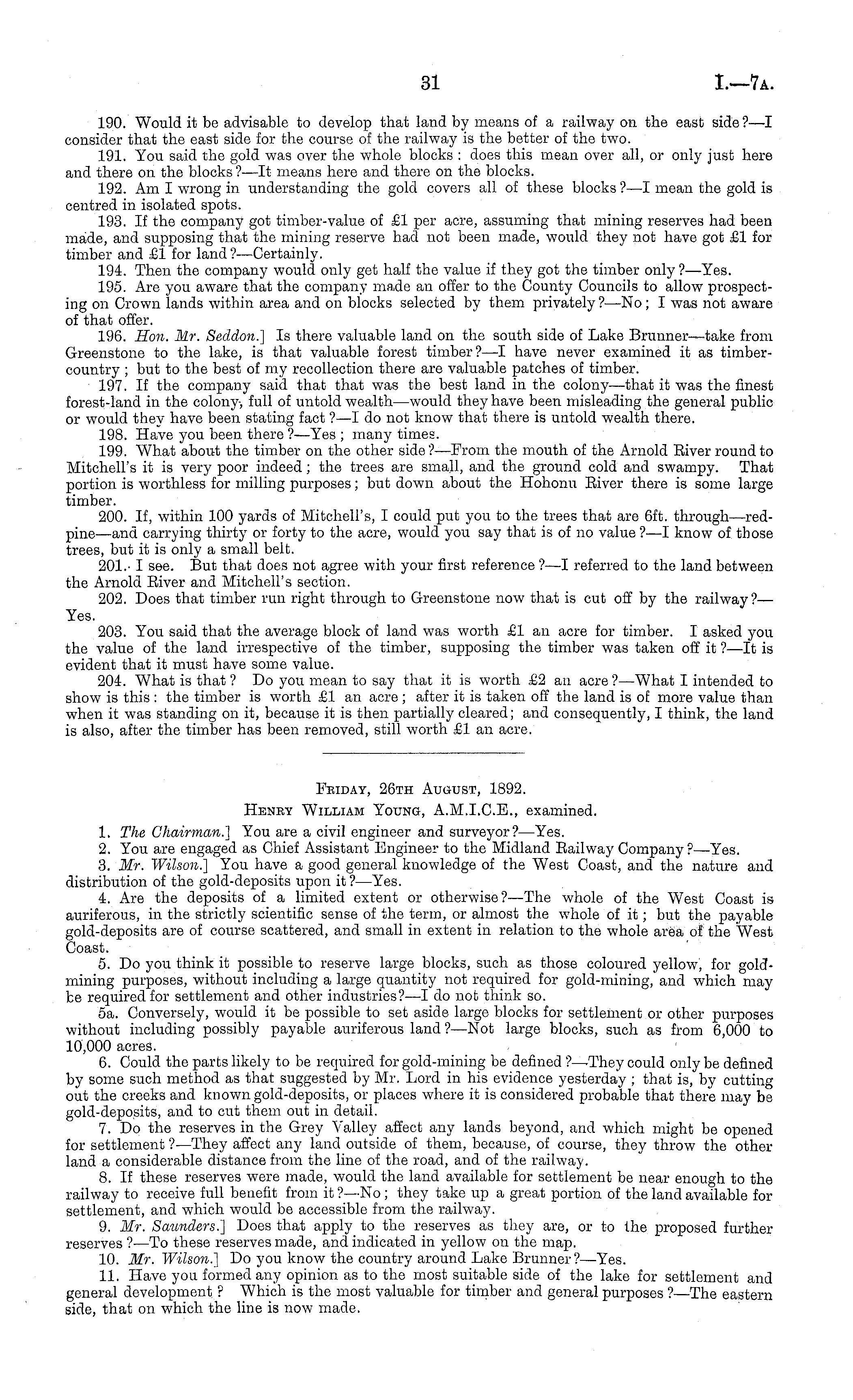 Feiday, 26th August, 1892. Henby William Young, A.M.1.C.E., examined. 1. The Chairman.] You are a civil engineer and surveyor? —Yes. 2. You are engaged as Chief Assistant Engineer to the Midland Eailway Company ?—Yes. 3. Mr. Wilson.] You have a good general knowledge of the West Coast, and the nature and distribution of the gold-deposits upon it ? —Yes. 4. Are the deposits of a limited extent or otherwise ?—The whole of the West Coast is auriferous, in the strictly scientific sense of the term, or almost the whole of it; but the payable gold-deposits are of course scattered, and small in extent in relation to the whole area of the West Coast. 5. Do you think it possible to reserve large blocks, such as those coloured yellow, for gold- ,- mining purposes, without including a large quantity not required for gold-mining, and which may be required for settlement and other industries? —I do not think so. sa. Conversely, would it be possible to set aside large blocks for settlement or other purposes without including possibly payable auriferous land ?—Not large blocks, such as from 6,000 to 10,000 acres. 6. Could the parts likely to be required for gold-mining be defined ?—They could only be defined by some such method as that suggested by Mr. Lord in his evidence yesterday ; that is, by cutting out the creeks and known gold-deposits, or places where it is considered probable that there may be gold-deposits, and to cut them out in detail. 7. Do the reserves in the Grey Valley affect any lands beyond, and which might be opened for settlement ?—They affect any land outside of them, because, of course, they throw the other land a considerable distance from the line of the road, and of the railway. 8. If these reserves were made, would the land available for settlement be near enough to the railway to receive full benefit from it ?—No; they take up a great portion of the land available for settlement, and which would be accessible from the railway. 9. Mr. Saunders.] Does that apply to the reserves as they are, or to the proposed further reserves ?—To these reserves made, and indicated in yellow on the map. 10. Mr. Wilson.] Do you know the country around Lake Brunner?—Yes. 11. Have you. formed any opinion as to the most suitable side of the lake for settlement and general development ? Which is the most valuable for timber and general purposes ?—The eastern side, that on which the line is now made.