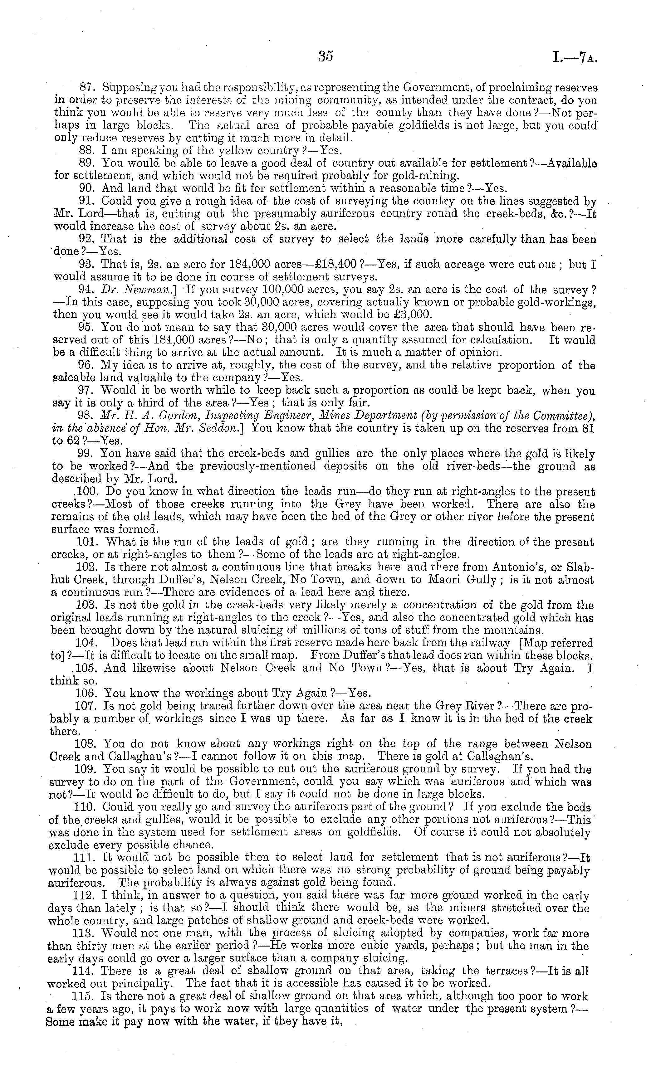 87. Supposing you had the responsibility, as representing the Government, of proclaiming reserves in order to preserve the interests of the mining community, as intended under the contract, do you think you would be able to reserve very much less of the county than they have done ?—Not perhaps in large blocks. The actual area of probable payable goldfields is not large, but you could only reduce reserves by cutting it much more in detail. 88. I am speaking of the yellow country ? —Yes. 89. You would be able co leave a good deal of country out available for settlement ?—Available for settlement, and which would not be required probably for gold-mining. 90. And land that would be fit for settlement within a reasonable time? —Yes. 91. Could you give a rough idea of the cost of surveying the country on the lines suggested by Mr. Lord—that is, cutting out the presumably auriferous country round the creek-beds, &c. ?—lt would increase the cost of survey about 2s. an acre. 92. That is the additional cost of survey to select the lands more carefully than has been done?— Yes. 93. That is, 2s. an acre for 184,000 acres —£18,400 ?—Yes, if such acreage were cut out; but I would assume it to be done in course of settlement surveys. 94. Dr. Newman.] If you survey 100,000 acres, you say 2s. an acre is the cost of the survey? —In this case, supposing you took 30,000 acres, covering actually known or probable gold-workings, then you would see it would take 2s. an acre, which would be £3,000. 95. You do not mean to say that 30,000 acres would cover the area that should have been reserved out of this 184,000 acres ? —No; that is only a quantity assumed for calculation. It would be a difficult thing to arrive at the actual amount. It is much a matter of opinion. 96. My idea is to arrive at, roughly, the cost of the survey, and the relative proportion of the saleable land valuable to the company?— Yes. 97. Would it be worth while to keep back such a proportion as could be kept back, when you say it is only a third of the area ? —Yes ; that is only fair. 98. Mr. 11. A. Gordon, Inspecting Engineer, Mines Department (by permission of the Committee), in the absence of Hon. Mr. Seddon.] You know that the country is taken up on the reserves from 81 to 62?— Yes. 99. You have said that the creek-beds and gullies are the only places where the gold is likely to be worked?— And the previously-mentioned deposits on the old river-beds—-the ground as described by Mr. Lord. .100. Do you know in what direction the leads run—do they run at right-angles to the present creeks?— Most of those creeks running into the Grey have been worked. There are also the remains of the old leads, which may have been the bed of the Grey or other river before the present surface was formed. 101. Wha'o is the run of the leads of gold; are they running in the direction of the present creeks, or at right-angles to them ?—Some of the leads are at right-angles. 102. Is there not almost a continuous line that breaks here and there from Antonio's, or Slabhut Creek, through Duffer's, Nelson Creek, No Town, and down to Maori Gully ; is it not almost a continuous run? —There are evidences of a lead here and there. 103. Is not the gold in the creek-beds very likely merely a concentration of the gold from the original leads running at right-angles to the creek ?—Yes, and also the concentrated gold which has been brought down by the natural sluicing of millions of tons of stuff from the mountains. 104. Does that lead run within the first reserve made here back from the railway [Map referred to] ?—lt is difficult to locate on the small map. From Duffer's that lead does run within these blocks. 105. And likewise about Nelson Creek and No Town ? —Yes, that is about Try Again. I think so. 106. You know the workings about Try Again ?—Yes. 107. Is not gold being traced further down over the area near the Grey Eiver ?—There are probably a number of workings since I was up there. As far as I know it is in the bed of the creek there. 108. You do not know about any workings right on the top of the range between Nelson Creek and Callaghan's?—l cannot follow it on this map. There is gold at Callaghan's. 109. You say it would be possible to cut out the auriferous ground by survey. If you had the survey to do on the part of the Government, could you say which was auriferous and which was not? —It would be difficult to do, but I say it could not be done in large blocks. 110. Could you really go and. survey the auriferous part of the ground ? If you exclude the beds of the creeks and gullies, would it be possible to exclude any other portions not auriferous ?—This was done in the system used for settlement areas on goldfields. Of course it could not absolutely exclude every possible chance. 111. It would not be possible then to select land for settlement that is not auriferous ?—lt would be possible to select land on which there was no strong probability of ground being payably auriferous. The probability is always against gold being found. 112. I think, in answer to a question, you said there was far more ground worked in the early days than lately ;is that so? —I should think there would be, as the miners stretched over the whole country, and large patches of shallow ground and creek-beds were worked. 113. Would not one man, with the process of sluicing adopted by companies, work far more than thirty men at the earlier period ?—He works more cubic yards, perhaps; but the man in the early days could go over a larger surface than a company sluicing. 114. There is a great deal of shallow ground on that area, taking the terraces ?—lt is all worked out principally. The fact that it is accessible has caused it to be worked. 115. Is there not a great deal of shallow ground on that area which, although too poor to work a few years ago, it pays to work now with large quantities of water under the present system ? 