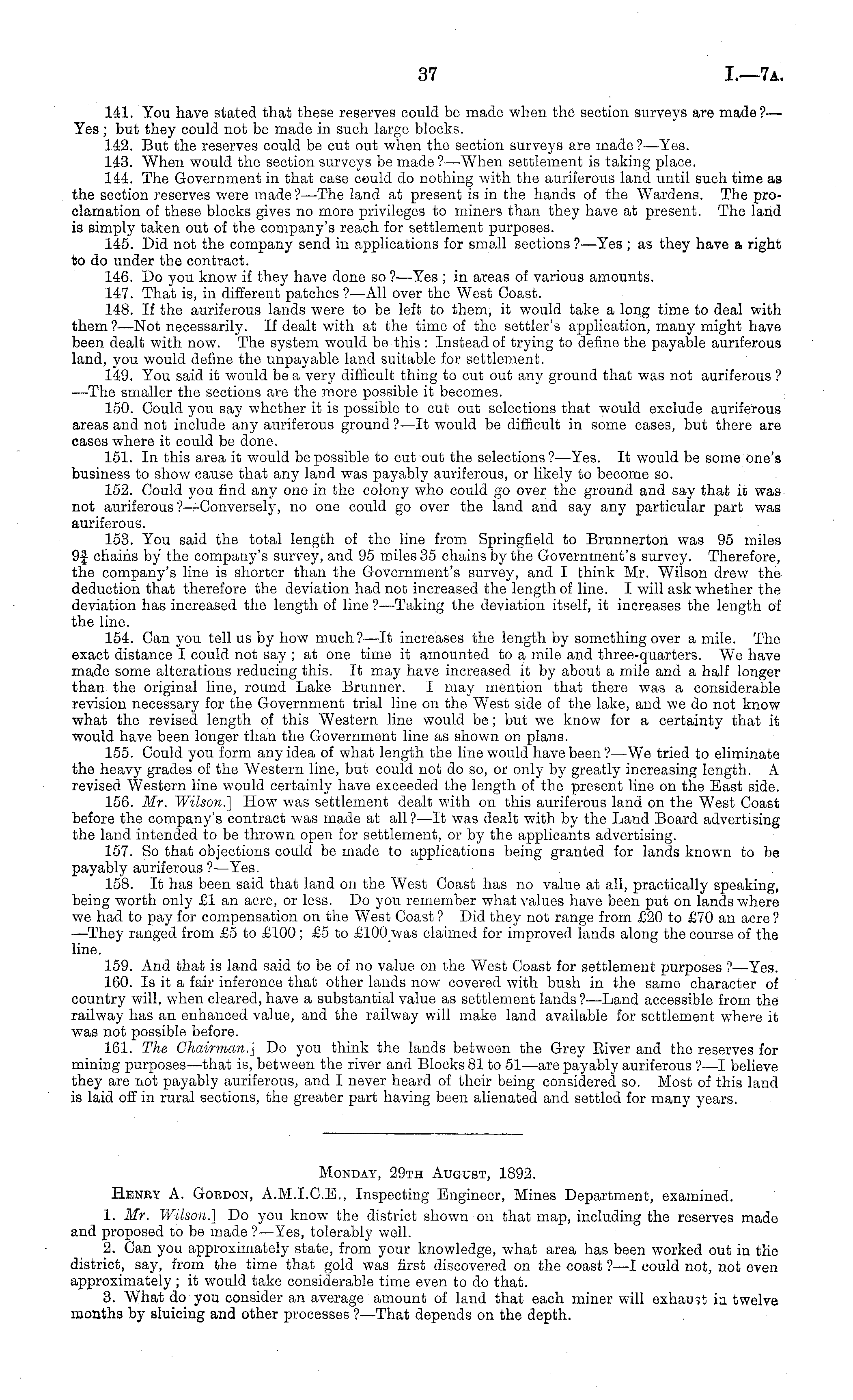 Monday, 29th August, 1892. Henry A. Goedon, A.M.1.C.E., Inspecting Engineer, Mines Department, examined. 1. Mr. Wilson.] Do you know the district shown on that map, including the reserves made and proposed to bo made ?—Yes, tolerably well. 2. Can you approximately state, from your knowledge, what area has been worked out in the district, say, from the time that gold was first discovered on the coast ? —I could not, not even approximately ; it would take considerable time even to do that. 3. What do you consider an average amount of land that each miner will exhaust ia twelve months by sluicing and other processes ? —That depends on the depth.