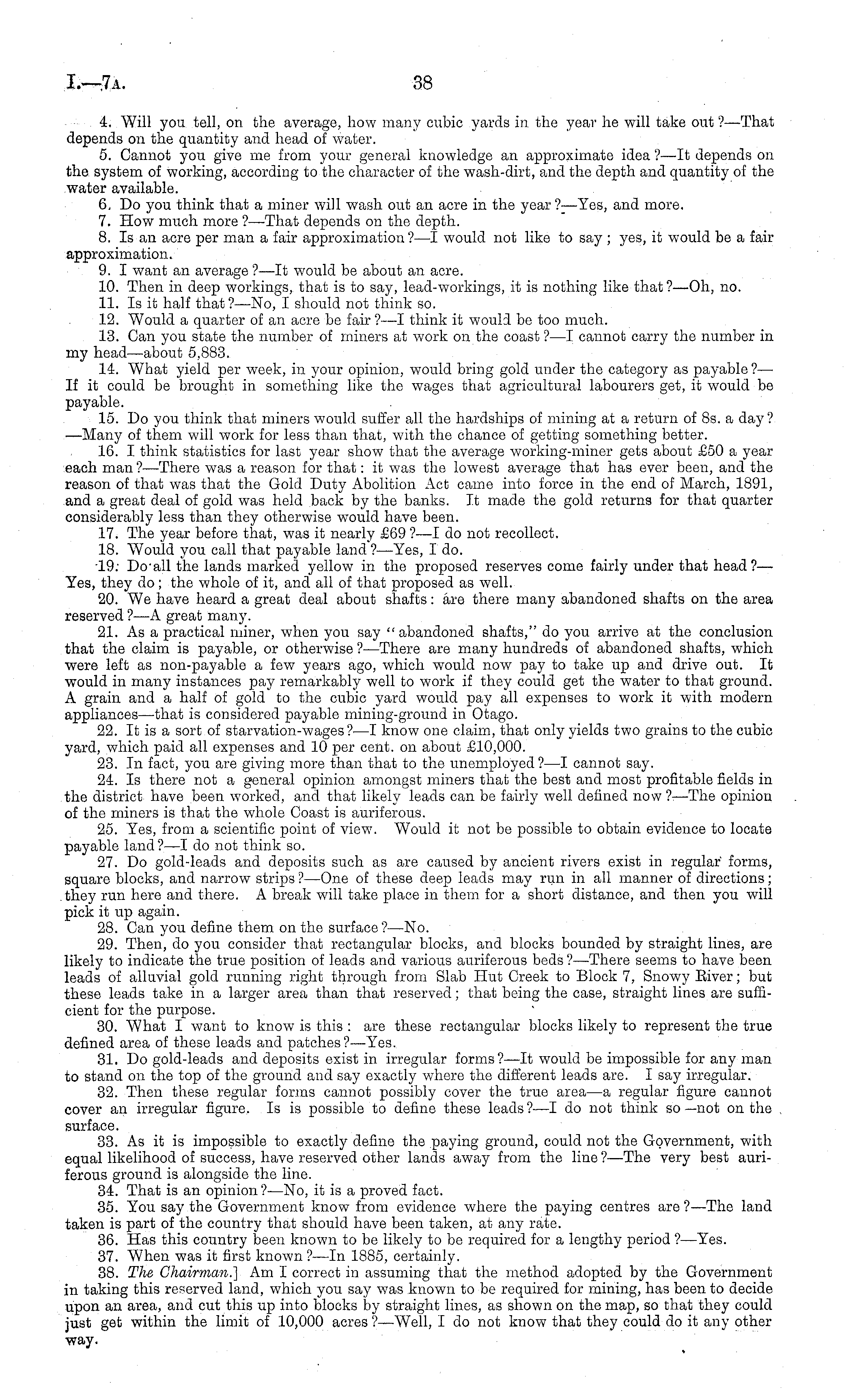 4. Will you tell, on the average, how many cubic yards in the year he will take out ?—That depends on the quantity and head of water. 5. Cannot you give me from your general knowledge an approximate idea ?—lt depends on the system of working, according to the character of the wash-dirt, and the depth and quantity of the water available. 6. Do you think that a miner will wash out an acre in the year ? —Yes, and more. 7. How much more ?—That depends on the depth. 8. Is an acre per man a fair approximation?—l would not like to say ; yes, it would be a fair approximation. 9. I want an average ?—lt would be about an acre. 10. Then in deep workings, that is to say, lead-workings, it is nothing like that ?—Oh, no. 11. Is it half that?—No, I should not think so. 12. Would a quarter of an acre be fair ?—I think it would be too much. 13. Can you state the number of miners at work on the coast ?—I cannot carry the number in my head—about 5,883. 14. What yield per week, in your opinion, would bring gold under the category as payable ?— If it could be brought in something like the wages that agricultural labourers get, it would be payable. 15. Do you think that miners would suffer all the hardships of mining at a return of Bs. a day? —Many of them will work for less than that, with the chance of getting something better. 16. I think statistics for last year show that the average working-miner gets about £50 a year each man ? —There was a reason for that: it was the lowest average that has ever been, and the reason of that was that the Gold Duty Abolition Act came into force in the end of March, 1891, and a great deal of gold was held back by the banks. It made the gold returns for that quarter considerably less than they otherwise would have been. 17. The year before that, was it nearly £69 ?—I do not recollect. 18. Would you call that payable land ?—Yes, I do. 19: Do'all the lands marked yellow in the proposed reserves come fairly under that head?— Yes, they do; the whole of it, and all of that proposed as well. 20. We have heard a great deal about shafts: are there many abandoned shafts on the area reserved ?—A great many. 21. As a practical miner, when you say "abandoned shafts," do you arrive at the conclusion that the claim is payable, or otherwise ?—There are many hundreds of abandoned shafts, which were left as non-payable a few years ago, which would now pay to take up and drive out. It would in many instances pay remarkably well to work if they could get the water to that ground. A grain and a half of gold to the cubic yard would pay all expenses to work it with modern appliances —that is considered payable mining-ground in Otago. 22. It is a sort of starvation-wages?' —I know one claim, that only yields two grains to the cubic yard, which paid all expenses and 10 per cent, on about £10,000. 23. In fact, you are giving more than that to the unemployed? —I cannot say. 24. Is there not a general opinion amongst miners that the best and most profitable fields in the district have been worked, and that likely leads can be fairly well defined now ?-, —The opinion of the miners is that the whole Coast is auriferous. 25. Yes, from a scientific point of view. Would it not be possible to obtain evidence to locate payable land ? —I do not think so. 27. Do gold-leads and deposits such as are caused by ancient rivers exist in regular forms, square blocks, and narrow strips ?—One of these deep leads may run in all manner of directions; they run here and there. A break will take place in them for a short distance, and then you will pick it up again. 28. Can you define them on the surface ?—No. 29. Then, do you consider that rectangular blocks, and blocks bounded by straight lines, are likely to indicate the true position of leads and various auriferous beds ?—There seems to have been leads of alluvial gold running right through from Slab Hut Creek to Block 7, Snowy Eiver; but these leads take in a larger area than that reserved; that being the case, straight lines are sufficient for the purpose. 30. What I want to know is this : are these rectangular blocks likely to represent the true defined area of these leads and patches?— Yes. 31. Do gold-leads and deposits exist in irregular forms? —It would be impossible for any man to stand on the top of the ground and say exactly where the different leads are. I say irregular. 32. Then these regular forms cannot possibly cover the true area —a regular figure cannot cover an irregular figure. Is is possible to define these leads?—l do not think so—not on the surface. 33. As it is impossible to exactly define the paying ground, could not the Government, with equal likelihood of success, have reserved other lands away from the line ?—The very best auriferous ground is alongside the line. 34. That is an opinion ?—No, it is a proved fact. 35. You say the Government know from evidence where the paying centres are ?—The land taken is part of the country that should have been taken, at any rate. 36. Has this country been known to be likely to be required for a lengthy period ?—Yes. 37. When was it first known ?—ln 1885, certainly. 38. The Chairman.] Am 1 correct in assuming that the method adopted by the Government in taking this reserved land, which you say was known to be required for mining, has been to decide upon an area, and cut this up into blocks by straight lines, as shown on the map, so that they could just get within the limit of 10,000 acres ?—Well, I do not know that they could do it any other way.